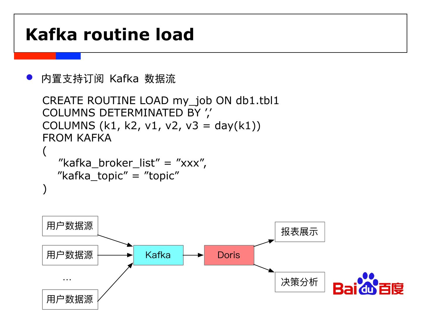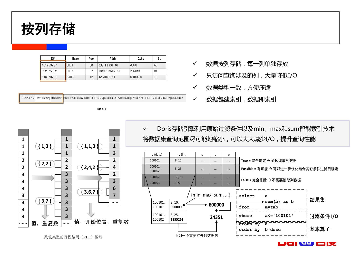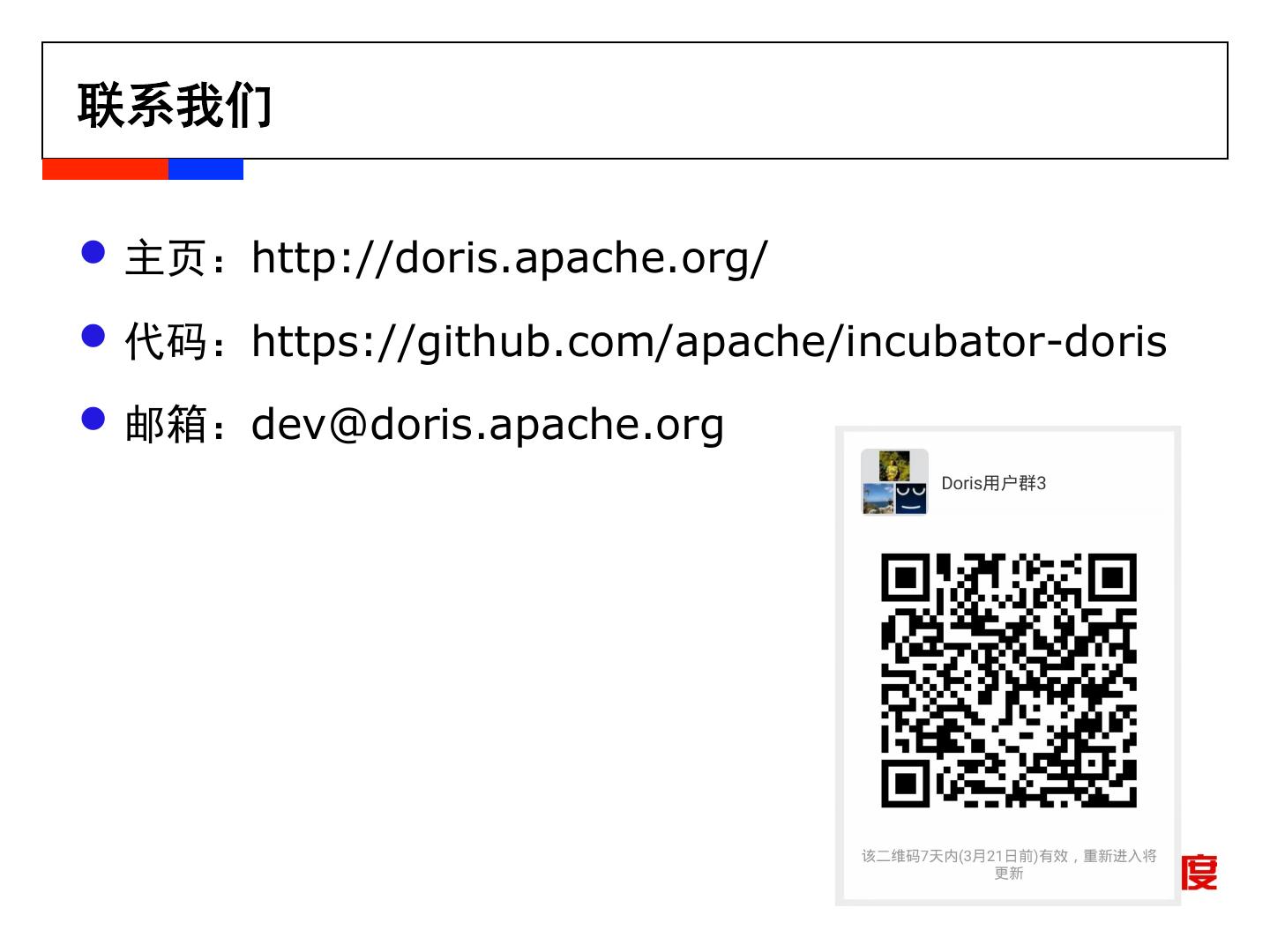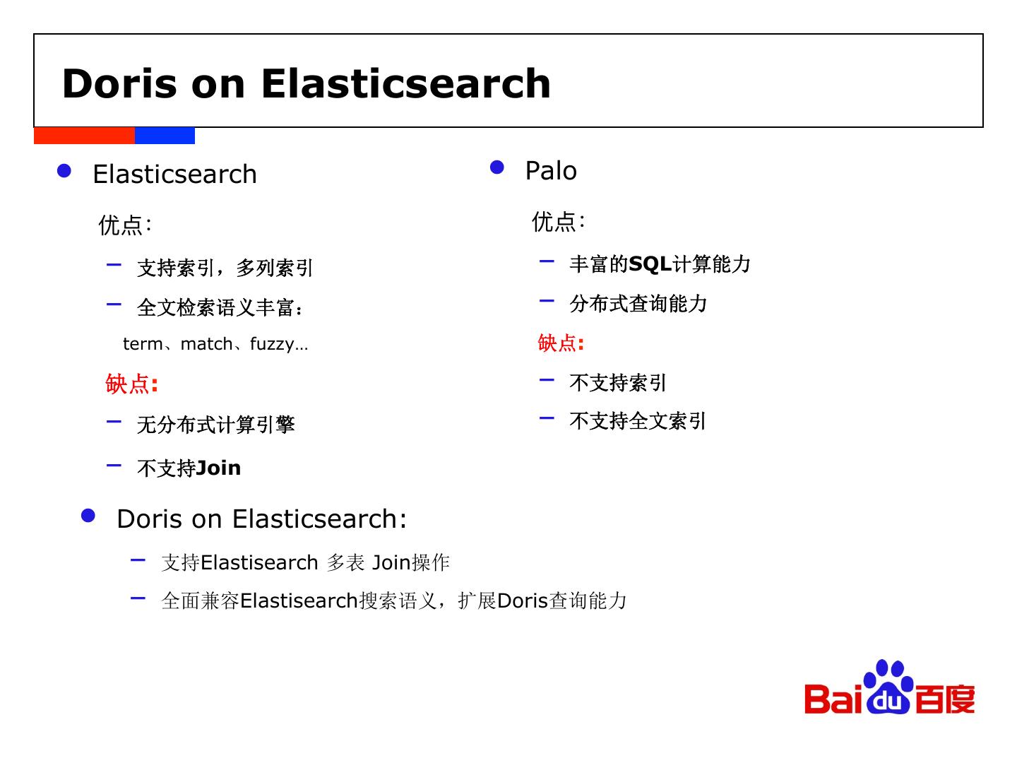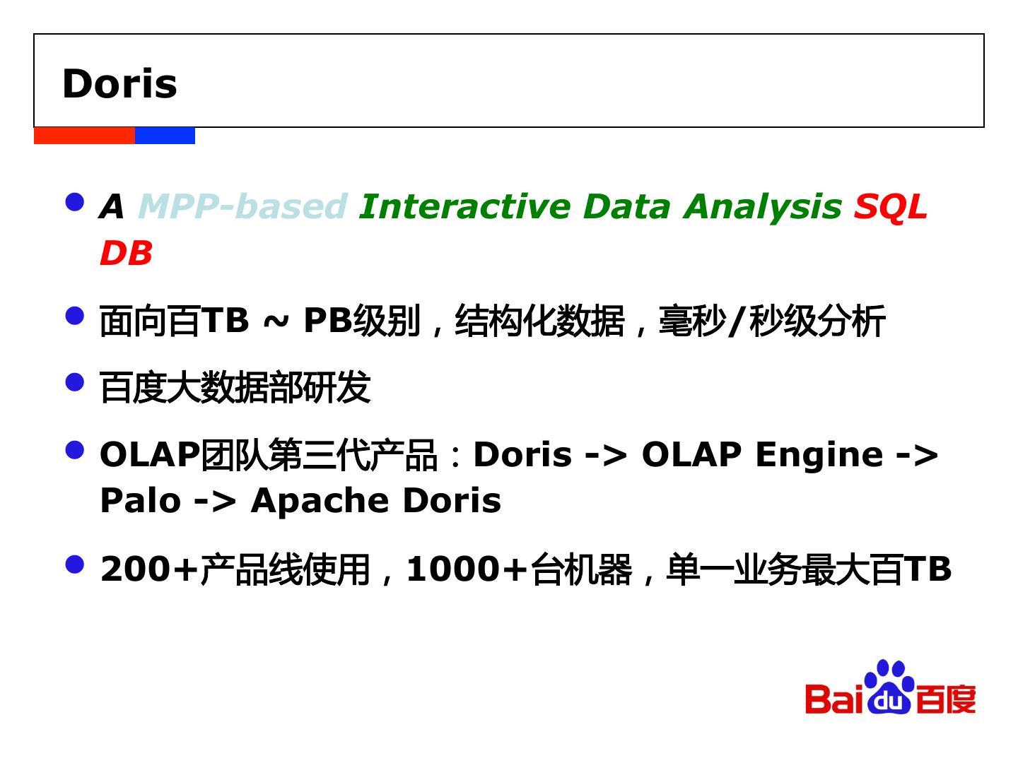 3 .Doris • A MPP-based Interactive Data Analysis SQL DB • 面向百TB ~ PB级别,结构化数据,毫秒/秒级分析 • 百度大数据部研发 • OLAP团队第三代产品:Doris -> OLAP Engine -> Palo -> Apache Doris • 200+产品线使用,1000+台机器,单一业务最大百TB