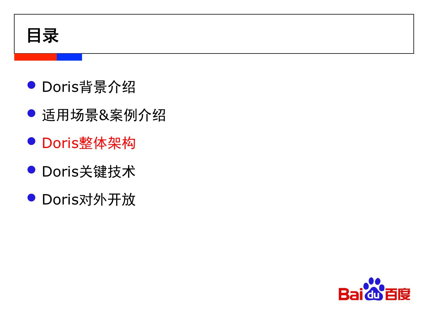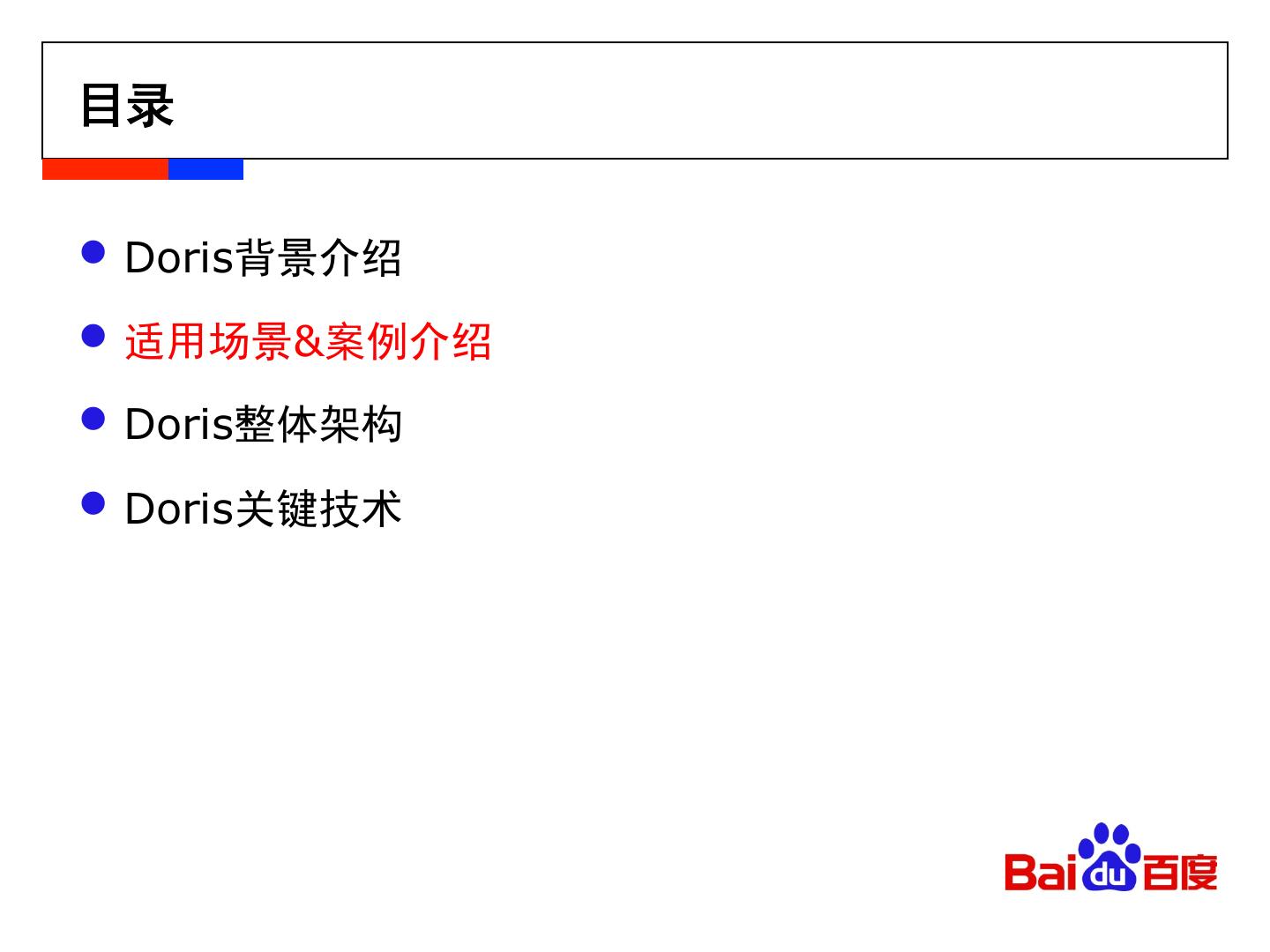 2 .目录 • Doris背景介绍 • 适用场景&案例介绍 • Doris整体架构 • Doris关键技术