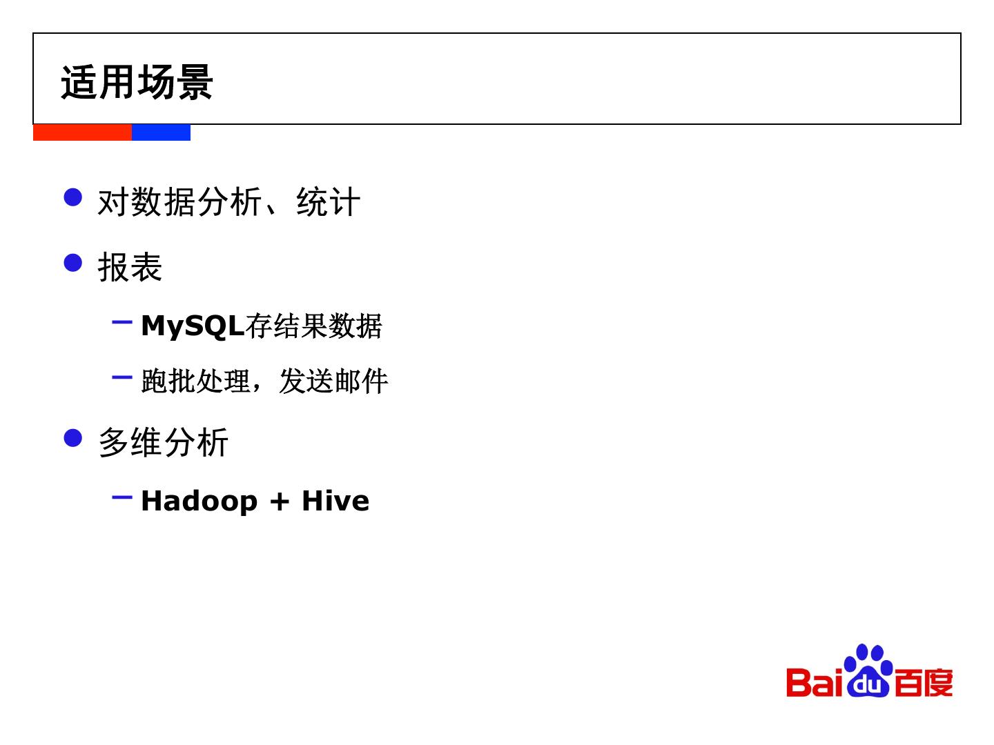 10 .适用场景 • 对数据分析、统计 • 报表 – MySQL存结果数据 – 跑批处理,发送邮件 • 多维分析 – Hadoop + Hive