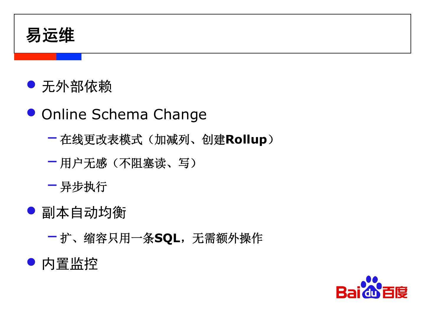 20 .易运维 • 无外部依赖 • Online Schema Change – 在线更改表模式(加减列、创建Rollup) – 用户无感(不阻塞读、写) – 异步执行 • 副本自动均衡 – 扩、缩容只用一条SQL,无需额外操作 • 内置监控
