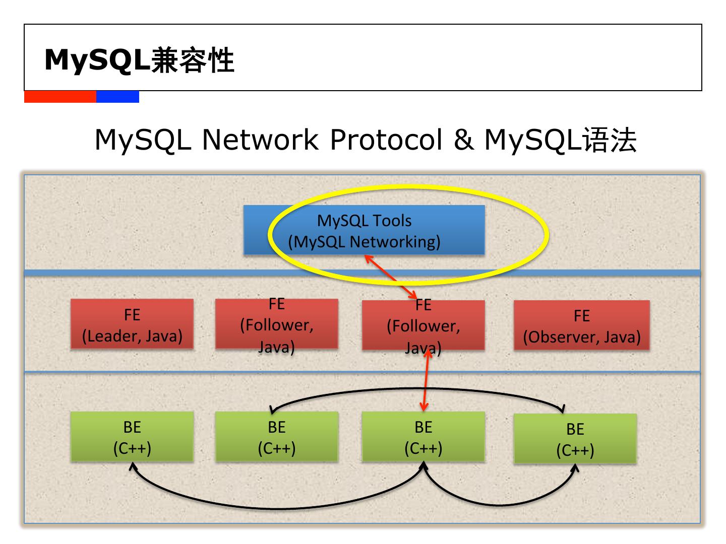 22 .MySQL兼容性 MySQL Network Protocol & MySQL语法 MySQL Tools (MySQL Networking) FE FE FE FE (Follower, (Follower, (Leader, Java) (Observer, Java) Java) Java) BE BE BE BE (C++) (C++) (C++) (C++)