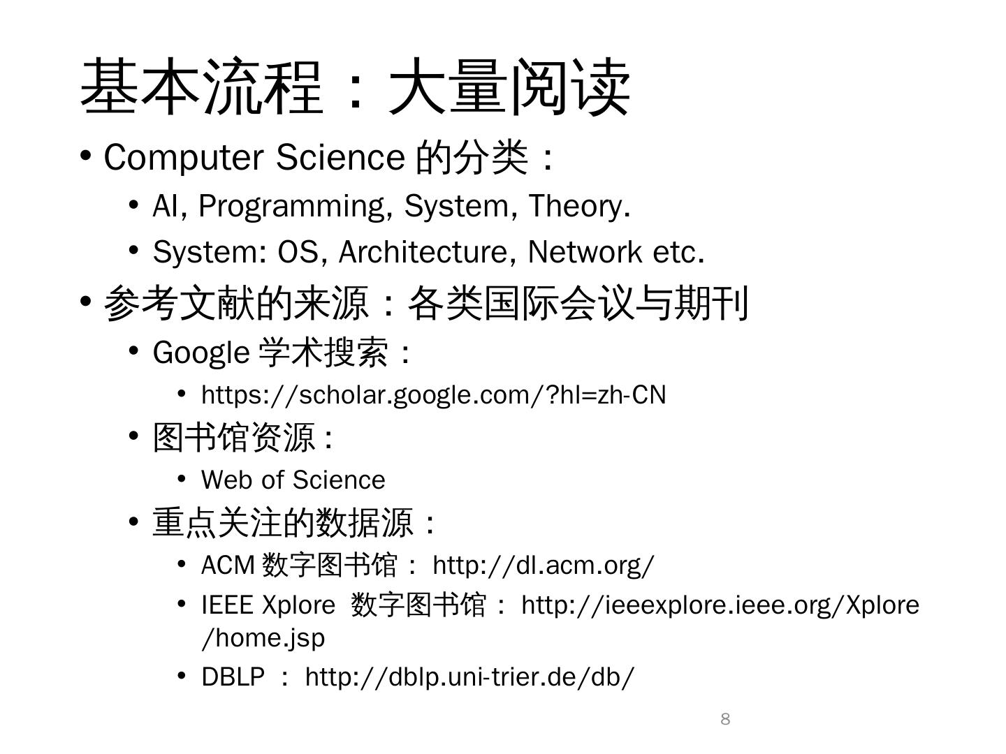 8 .基本流程:大量阅读 Computer Science 的分类: AI, Programming, System, Theory. System: OS, Architecture, Network etc. 参考文献的来源:各类国际会议与期刊 Google 学术搜索: https ://scholar.google.com/?hl=zh-CN 图书馆资源 : Web of Science 重点关注的数据源: ACM 数字图书馆: http://dl.acm.org/ IEEE X plore 数字图书馆: http ://ieeexplore.ieee.org/Xplore/home.jsp DBLP : http://dblp.uni-trier.de/db / 8
