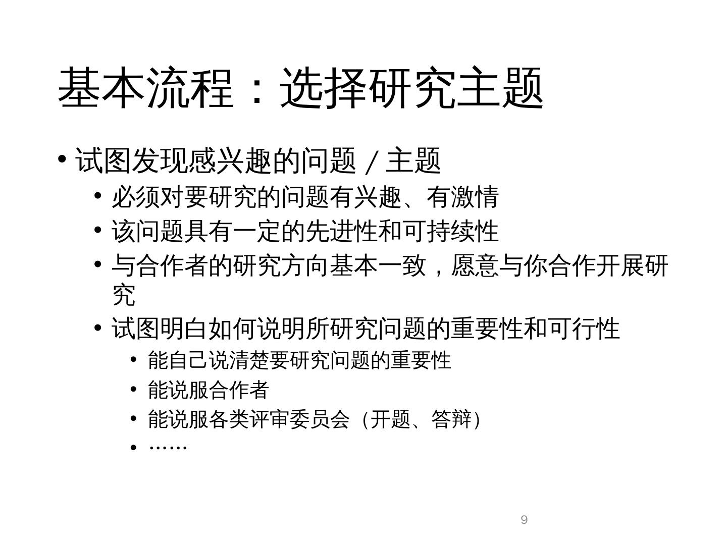9 .基本流程:选择研究主题 试图发现感兴趣的问题 / 主题 必须对要研究的问题有兴趣、有激情 该问题具有一定的先进性和可持续性 与合作者的研究方向基本一致,愿意与你合作开展研究 试图明白如何说明所研究问题的重要性和可行性 能自己说清楚要研究问题的重要性 能说服合作者 能说服各类评审委员会(开题、答辩) …… 9