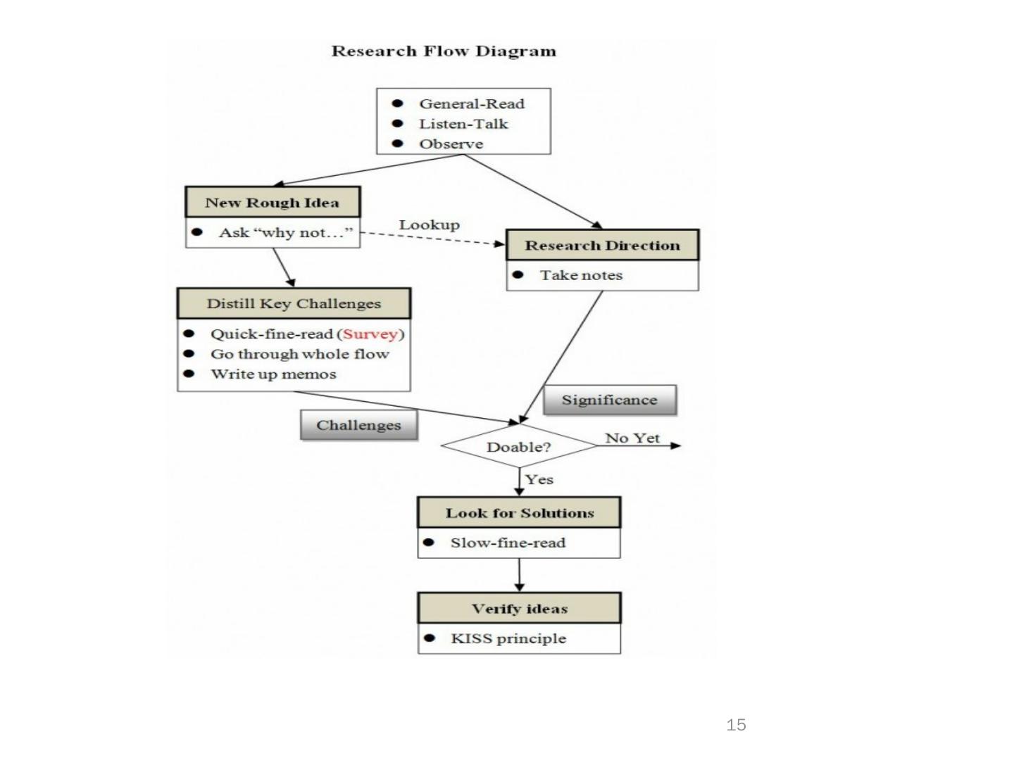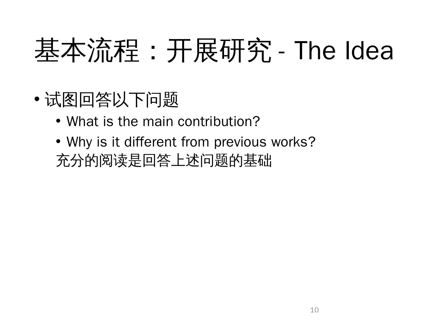 10 .基本流程:开展研究 - The Idea 试图回答以下问题 What is the main contribution? Why is it different from previous works? 充分的阅读是回答上述问题的基础 10