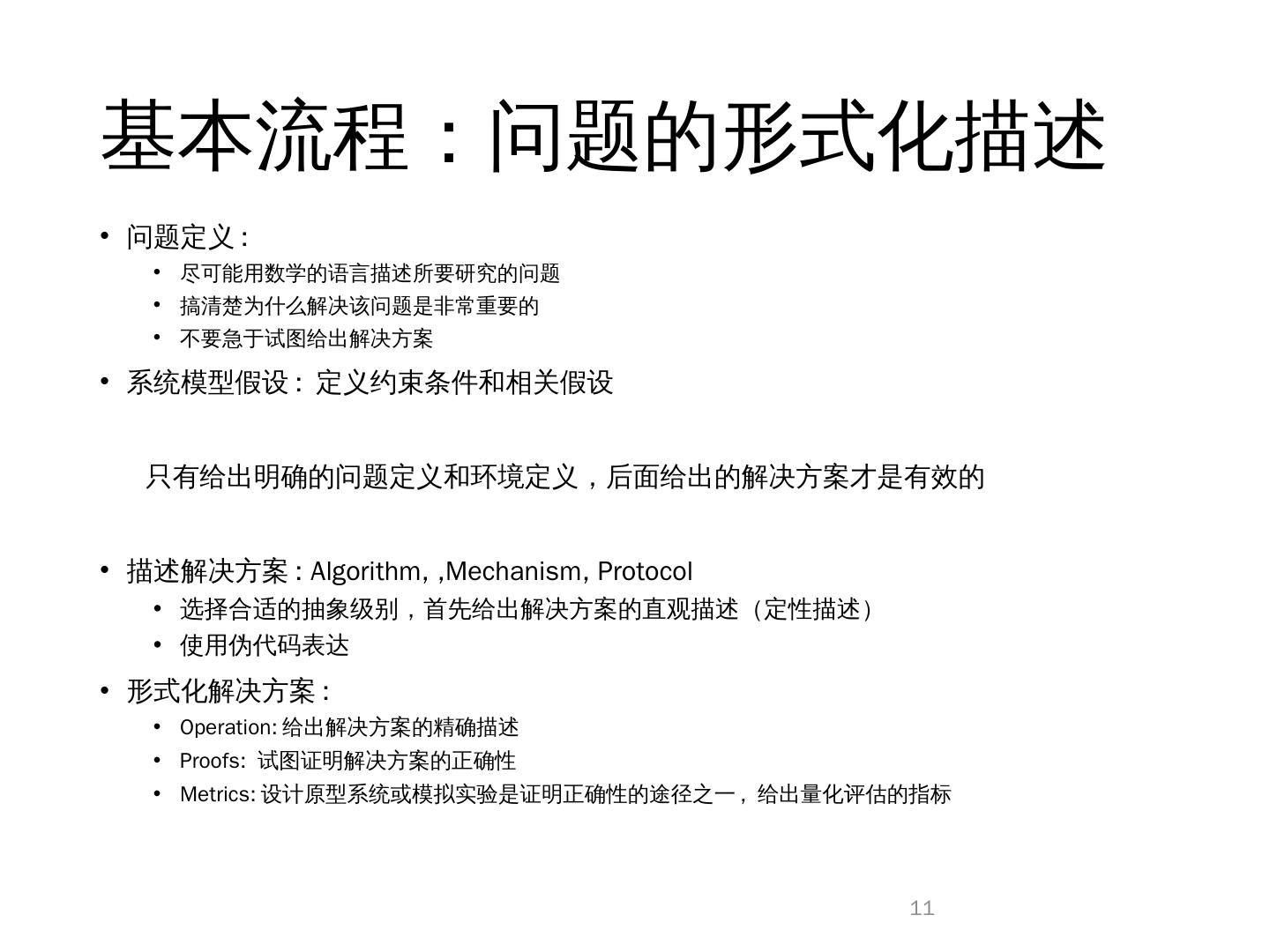 11 .基本流程:问题的形式化描述 问题定义 : 尽可能用数学的语言描述所要研究的问题 搞 清楚为什么解决该问题是非常重要 的 不要 急于试图给出解决方案 系统模型假设 : 定义约束条件和相关假设 只有 给出明确的问题定义和环境定义,后面给出的解决方案才是有效的 描述解决方案 : Algorithm, ,Mechanism, Protocol 选择合适的抽象级别,首先给出解决方案的直观描述(定性描述) 使用伪代码表达 形式化解决方案 : Operation: 给出解决方案的精确描述 Proofs: 试图证明解决方案的正确性 Metrics: 设计原型系统或模拟实验是证明正确性的途径之一 , 给出量化评估的指标 11