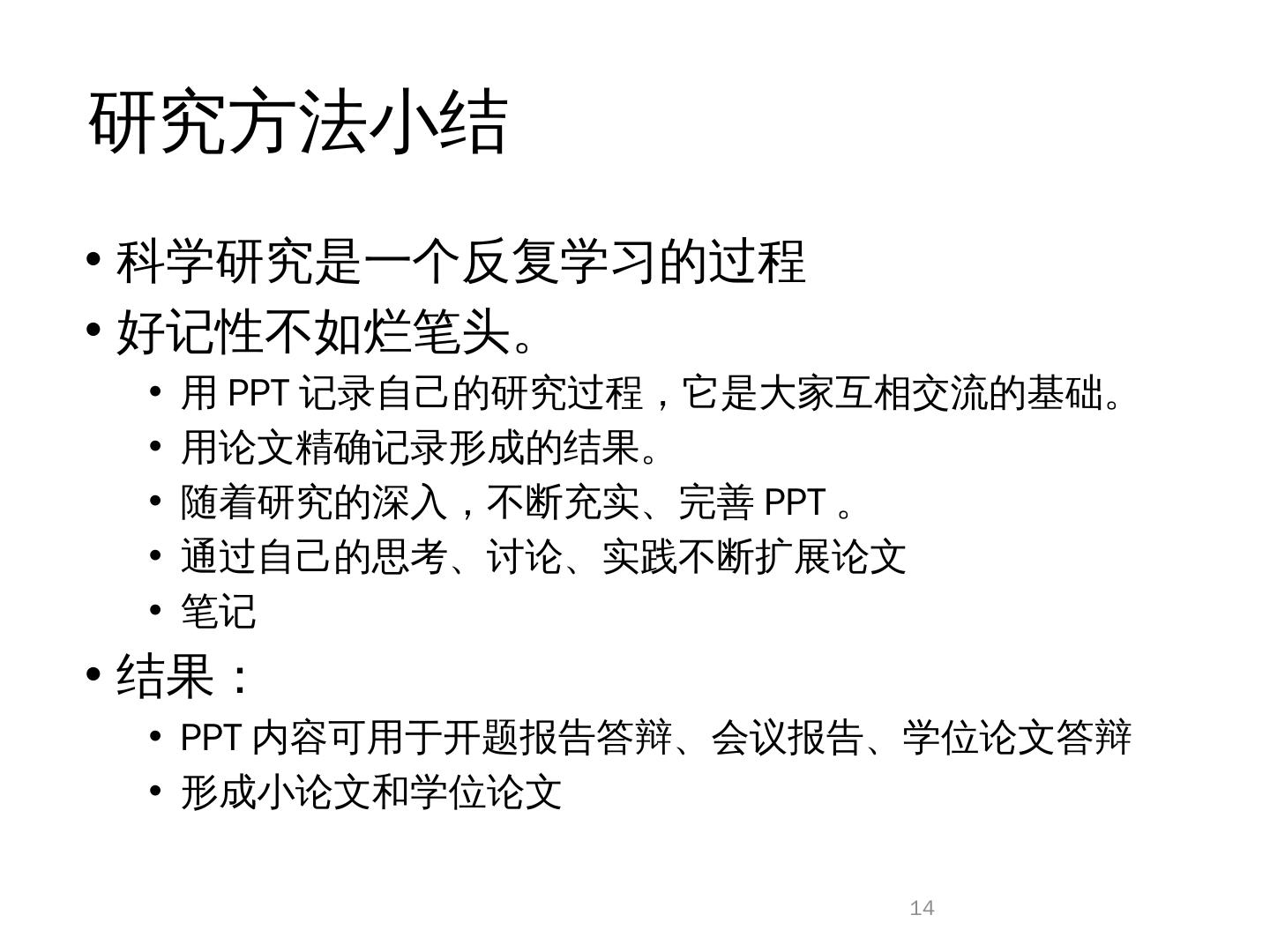 14 .研究方法小结 科学研究是一个反复学习的过程 好记性不如烂笔头。 用 PPT 记录自己的研究过程,它是大家互相交流的基础。 用论文精确记录形成的结果。 随着研究的深入,不断充实、完善 PPT 。 通过自己的思考、讨论、实践不断扩展论文 笔记 结果: PPT 内容可用于开题报告答辩、会议报告、学位论文答辩 形成小论文和学位论文 14