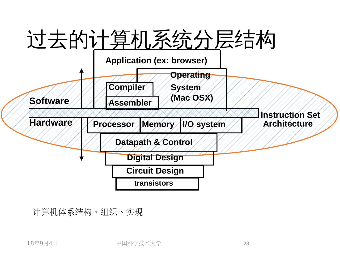 28 .过去的计算机系统分层结构 2015/11/27 中国科学技术大学 28 I/O system Processor Compiler Operating System (Mac OSX) Application (ex: browser) Digital Design Circuit Design Instruction Set Architecture Datapath & Control transistors Memory Hardware Software Assembler 计算机体系结构、组织、实现