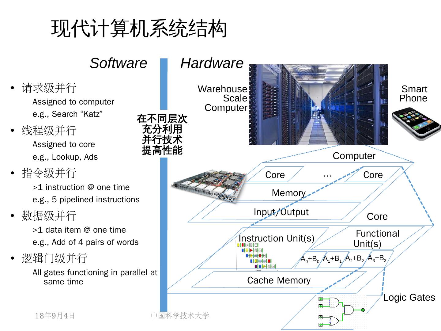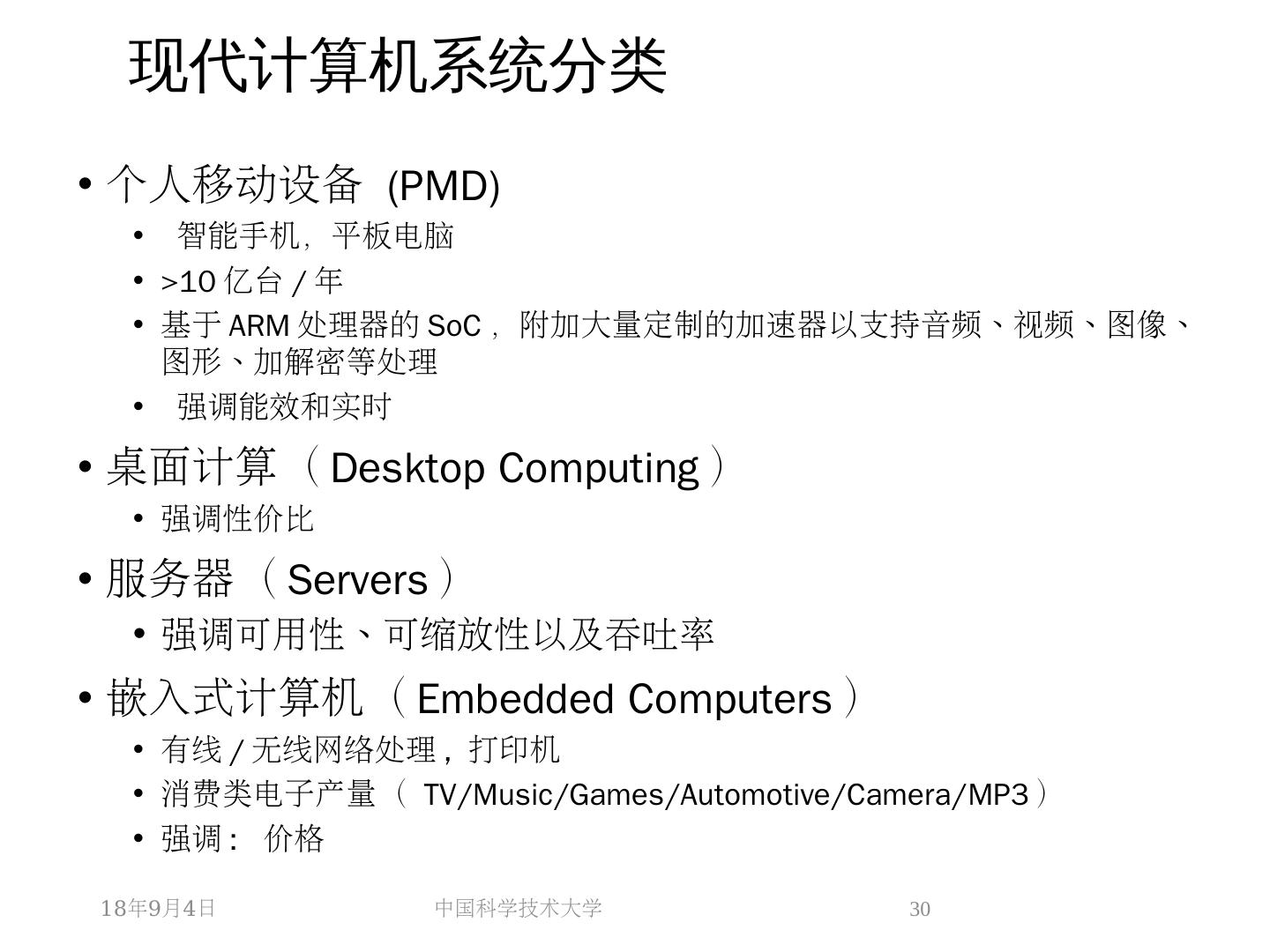 29 .Core Core … Memory Input/Output Computer 现代计算机系统结构 请求级并行 Assigned to computer e.g., Search “Katz” 线程级并行 Assigned to core e.g., Lookup, Ads 指令级并行 >1 instruction @ one time e.g., 5 pipelined instructions 数据级并行 >1 data item @ one time e.g., Add of 4 pairs of words 逻辑门级并行 All gates functioning in parallel at same time 2015/11/27 29 Smart Phone Warehouse Scale Computer Software Hardware 在不同层次 充分利用 并行技术 提高性能 Logic Gates Cache Memory Core Instruction Unit(s) Functional Unit(s ) A 3 +B 3 A 2 +B 2 A 1 +B 1 A 0 +B 0 中国科学技术大学