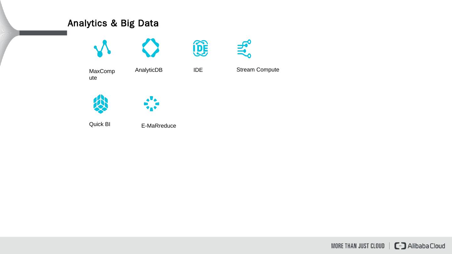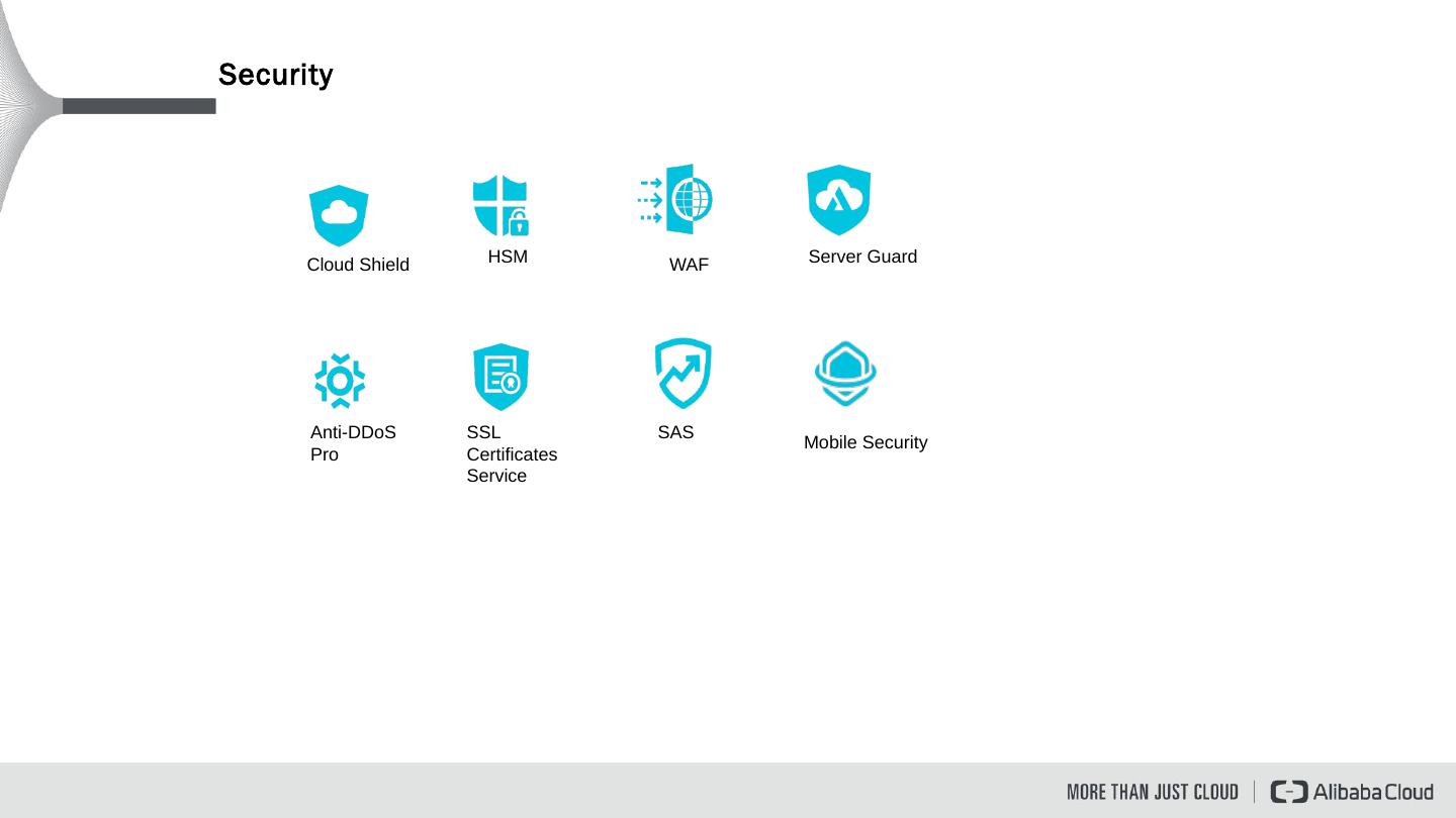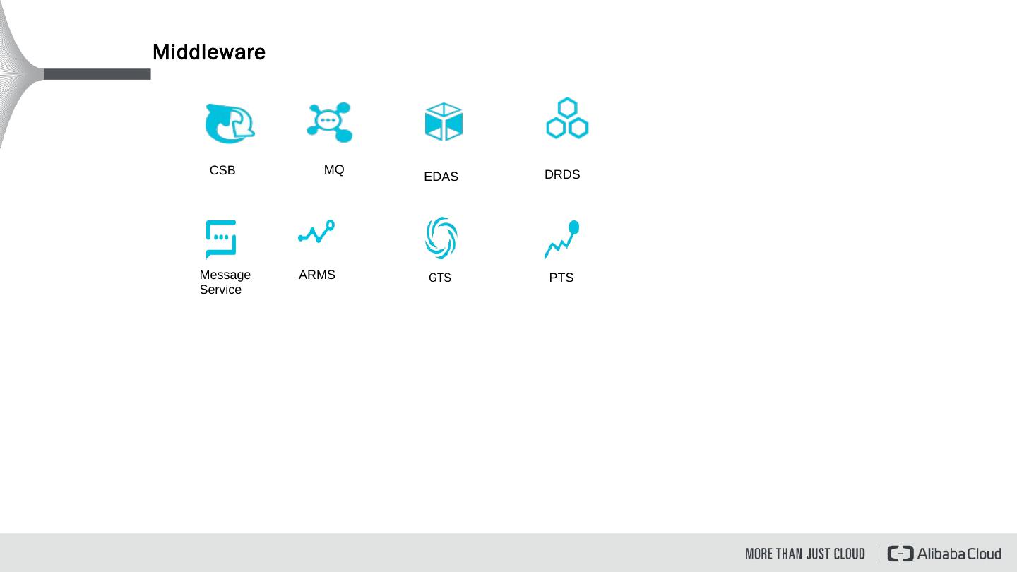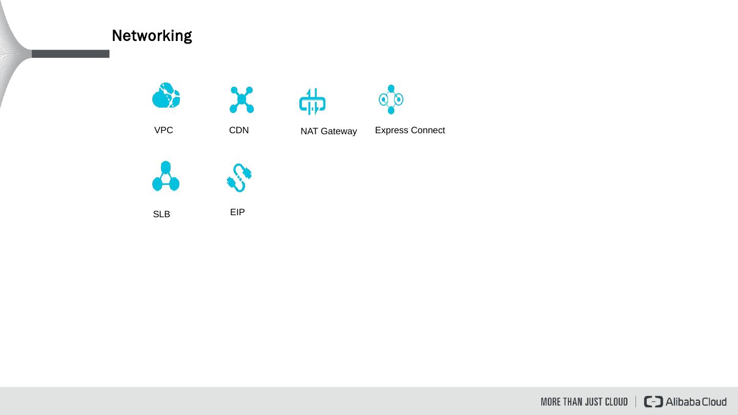DMS. Redis. HybridDB for MySQL. OceanBase. Networking. EIP. VPC. SLB. CDN. NAT Gateway. Express Connect. Monitoring & Management. CloudMonitor.
