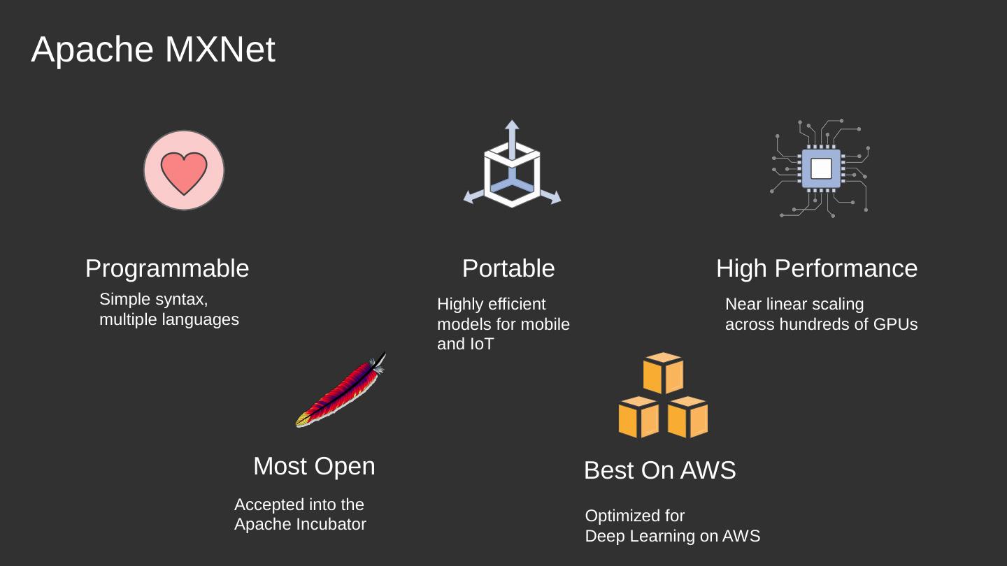Apache MXNet. Programmable. Portable. High Performance. Near linear scaling. across hundreds of GPUs. Highly efficient. models for mobile. and IoT.