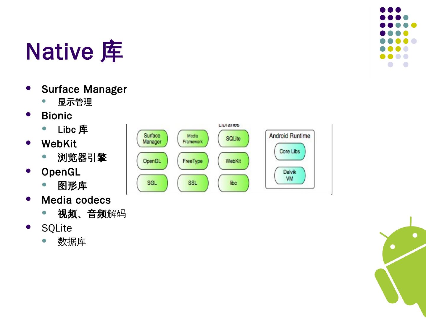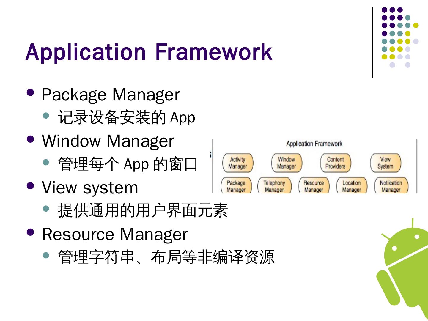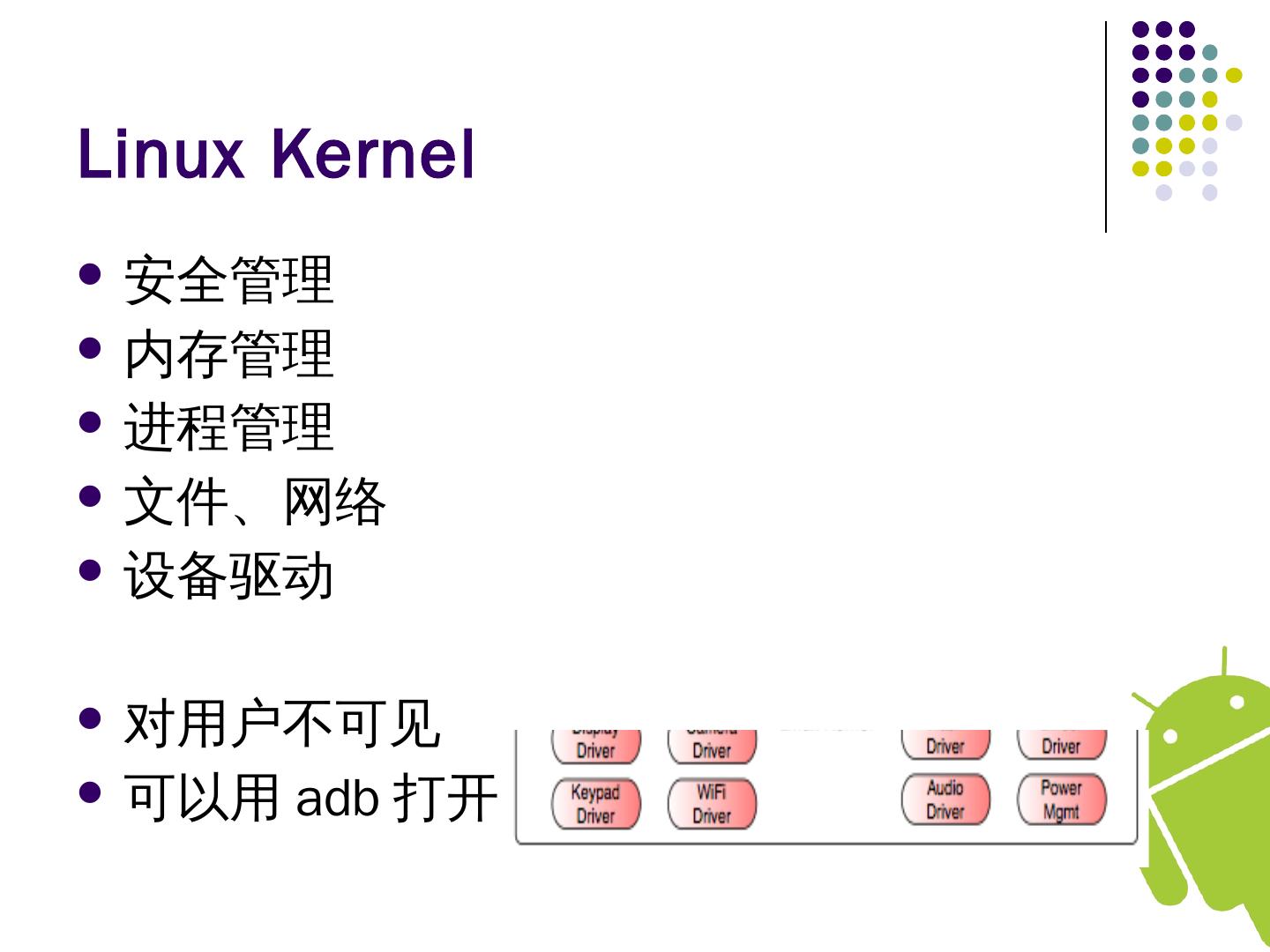 Linux Kernel. 安全管理; 内存管理; 进程管理; 文件、网络; 设备驱动. 对用户不可见; 可以用adb打开. Linux Kernel – Android 相关. 电源管理; Android共享内存; 低内存 ...