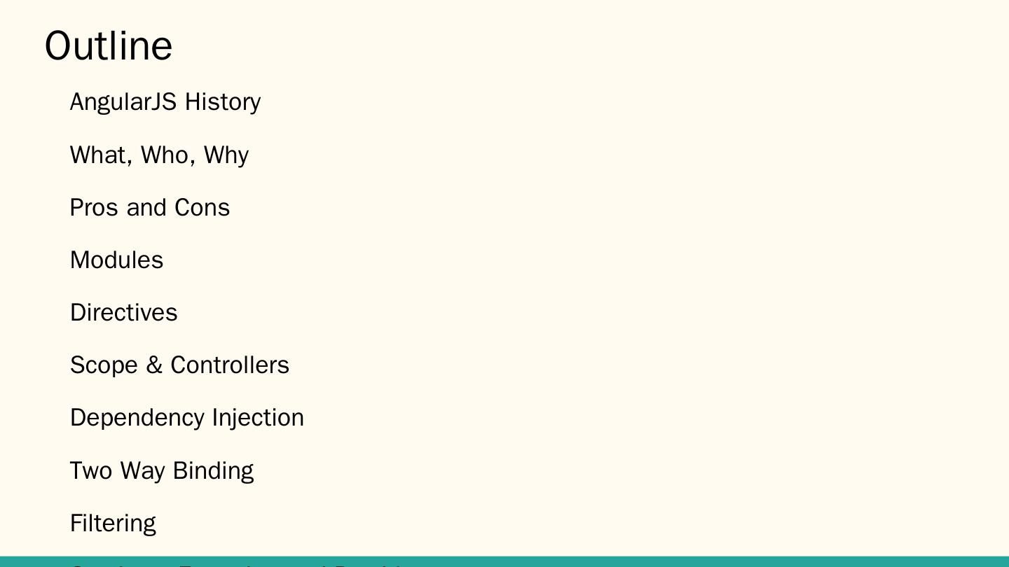 Jessica Betts, Sophia Pandey, & Ryan Amundson. Outline. AngularJS History. What, Who, Why. Pros and Cons. Modules. Directives. Scope & Controllers.