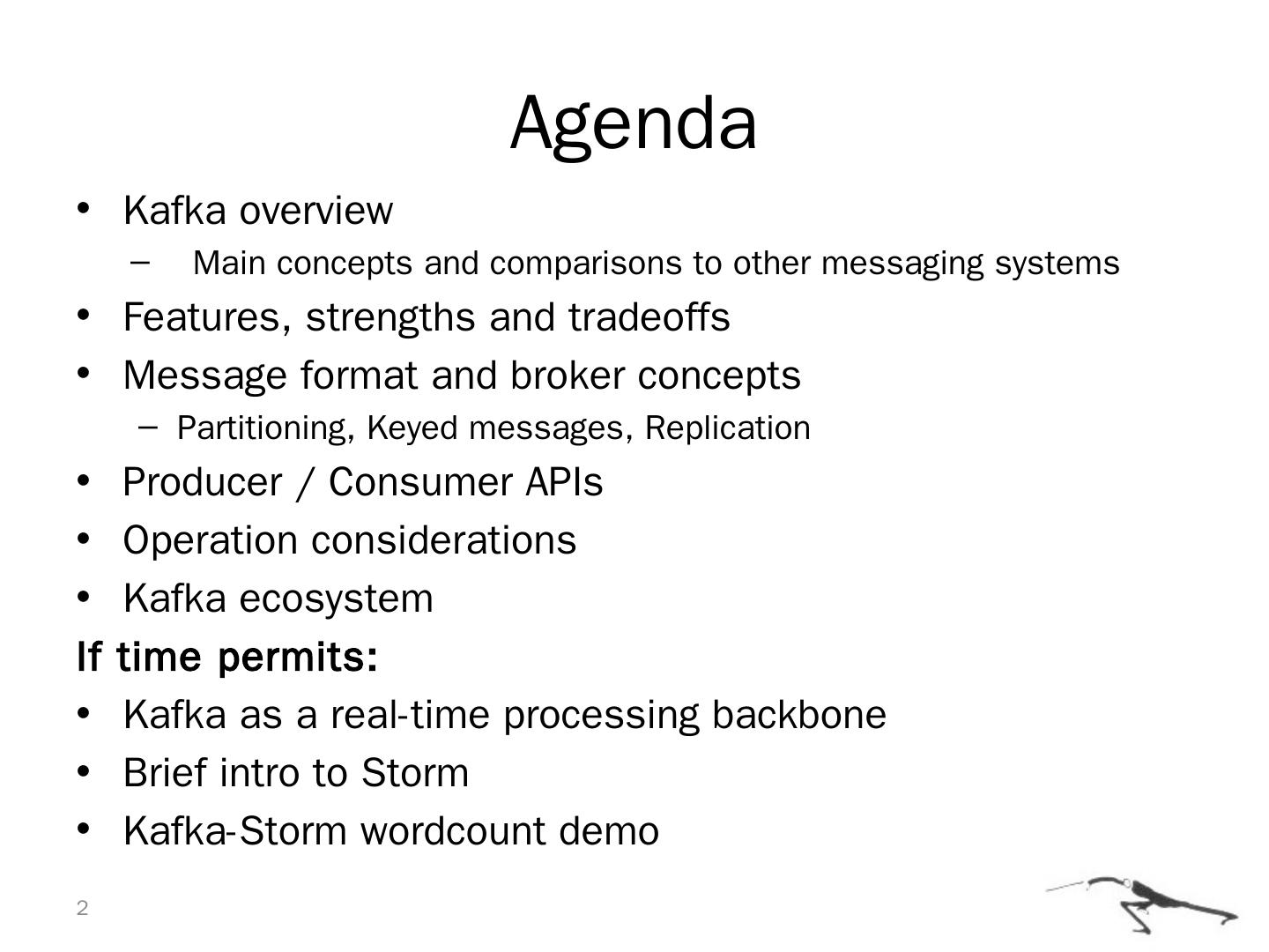 Apache Kafka. A high-throughput distributed messaging system. Johan Lundahl. Agenda. Kafka overview. Main concepts and comparisons to other messaging ...
