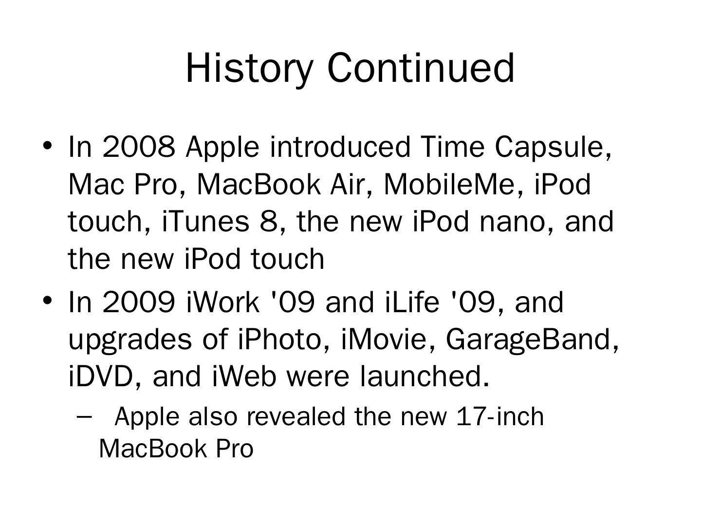 In 2008 Apple introduced Time Capsule, Mac Pro, MacBook Air, MobileMe, iPod touch, iTunes 8, the new iPod nano, and the new iPod touch; In 2009 iWork '09 ...