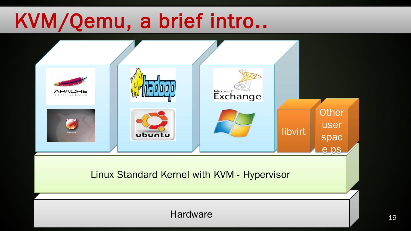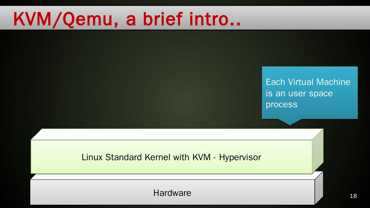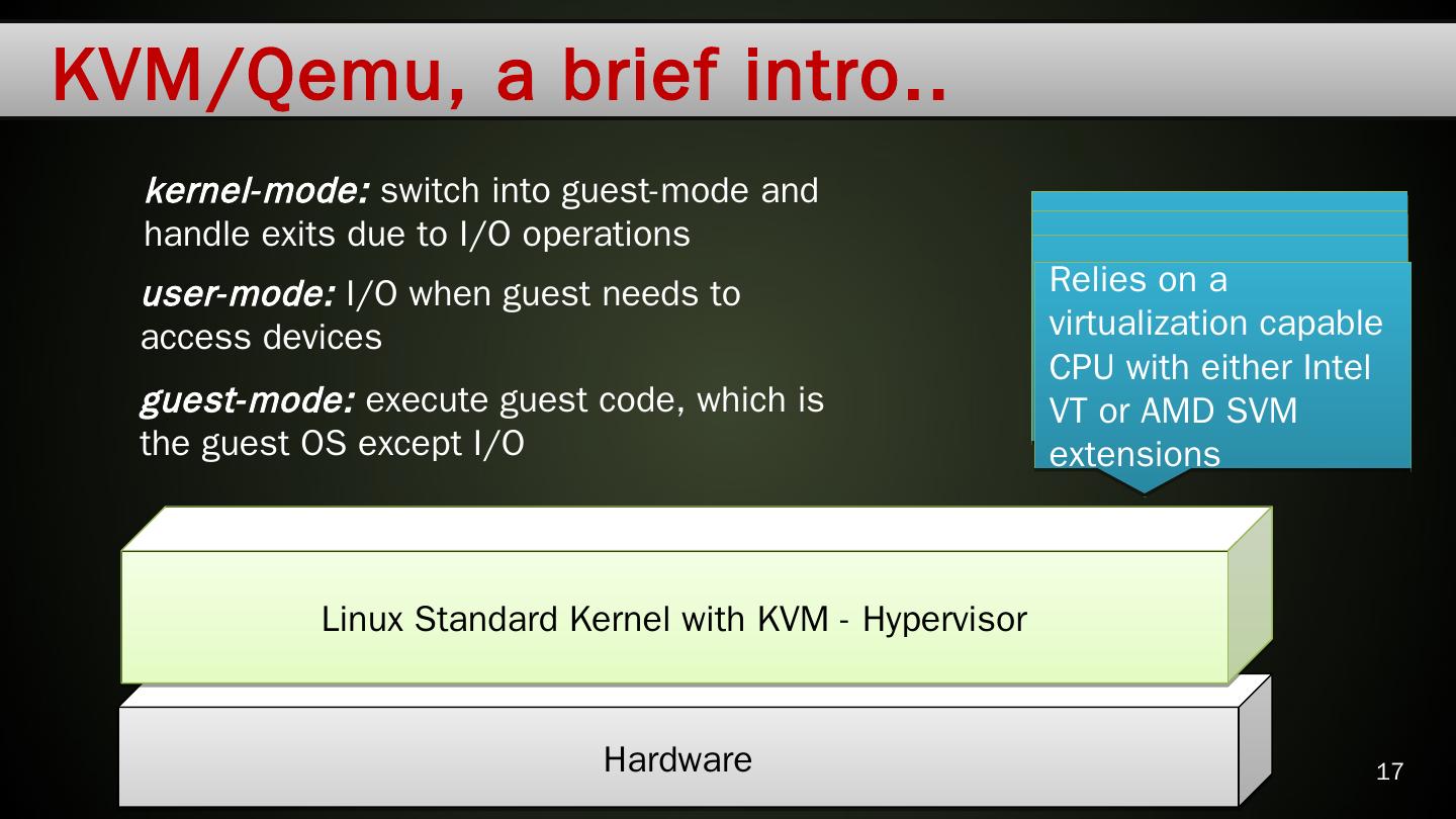 KVM module part of Linux kernel since version 2.6. Linux has all the mechanisms a VMM needs to operate several VMs. Has 3 modes:- kernel, user, guest.