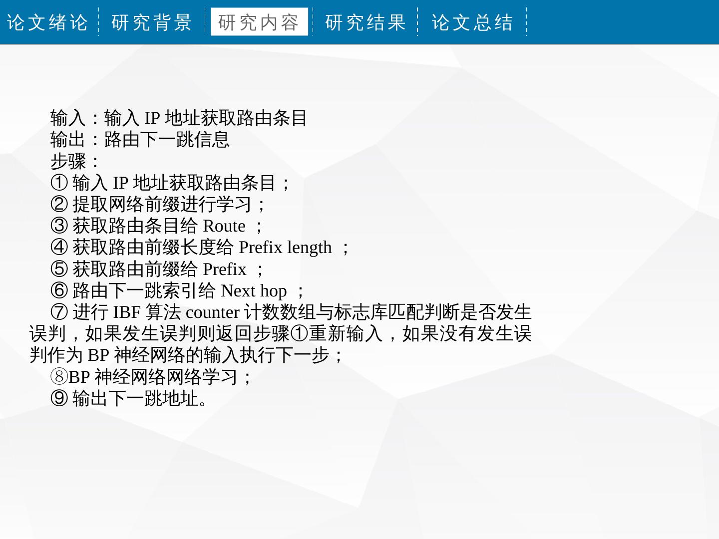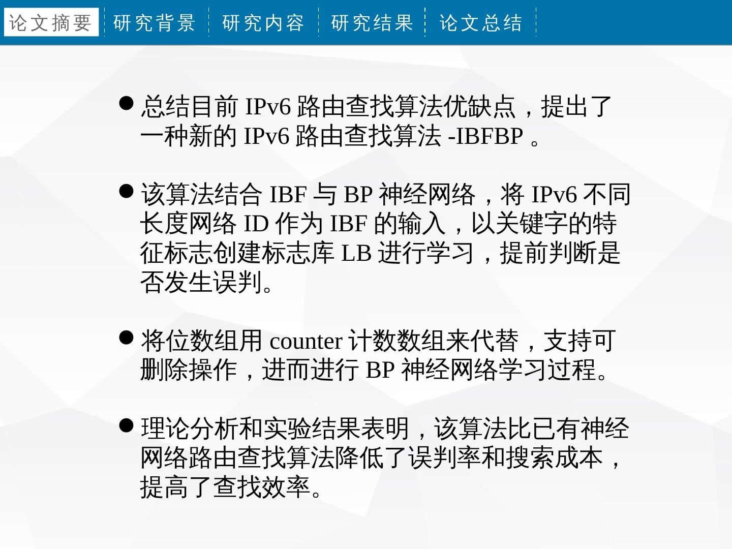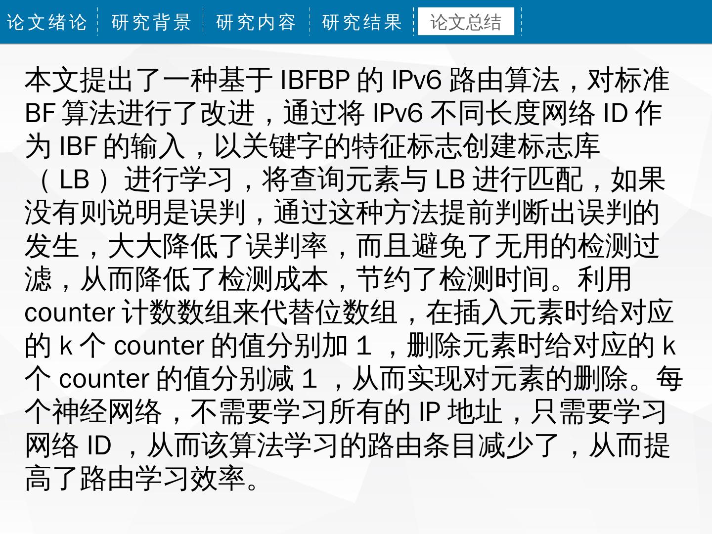 4 .论文摘要 研究背景 研究内容 研究结果 论文总结 总结目前 IPv6 路由查找算法优缺点,提出了 一种新的 IPv6 路由查找算法 -IBFBP 。 该算法结合 IBF 与 BP 神经网络,将 IPv6 不同 长度网络 ID 作为 IBF 的输入,以关键字的特 征标志创建标志库 LB 进行学习,提前判断是 否发生误判。 将位数组用 counter 计数数组来代替,支持可 、 删除操作,进而进行 BP 神经网络学习过程。 理论分析和实验结果表明,该算法比已有神经 网络路由查找算法降低了误判率和搜索成本, 提高了查找效率。