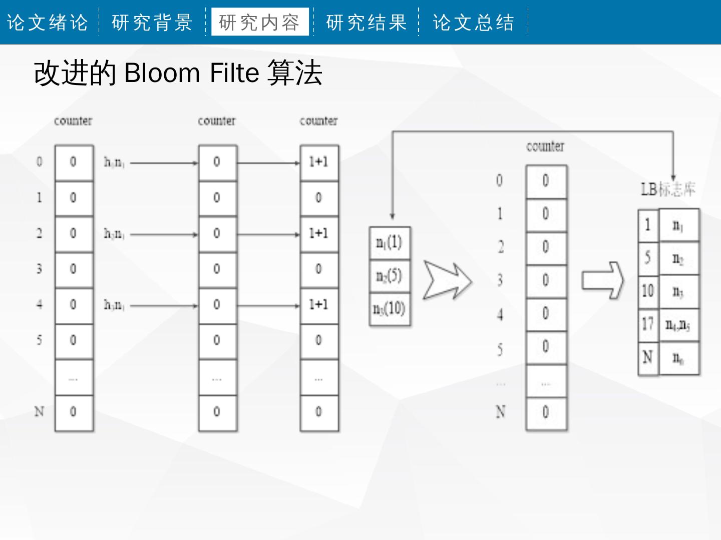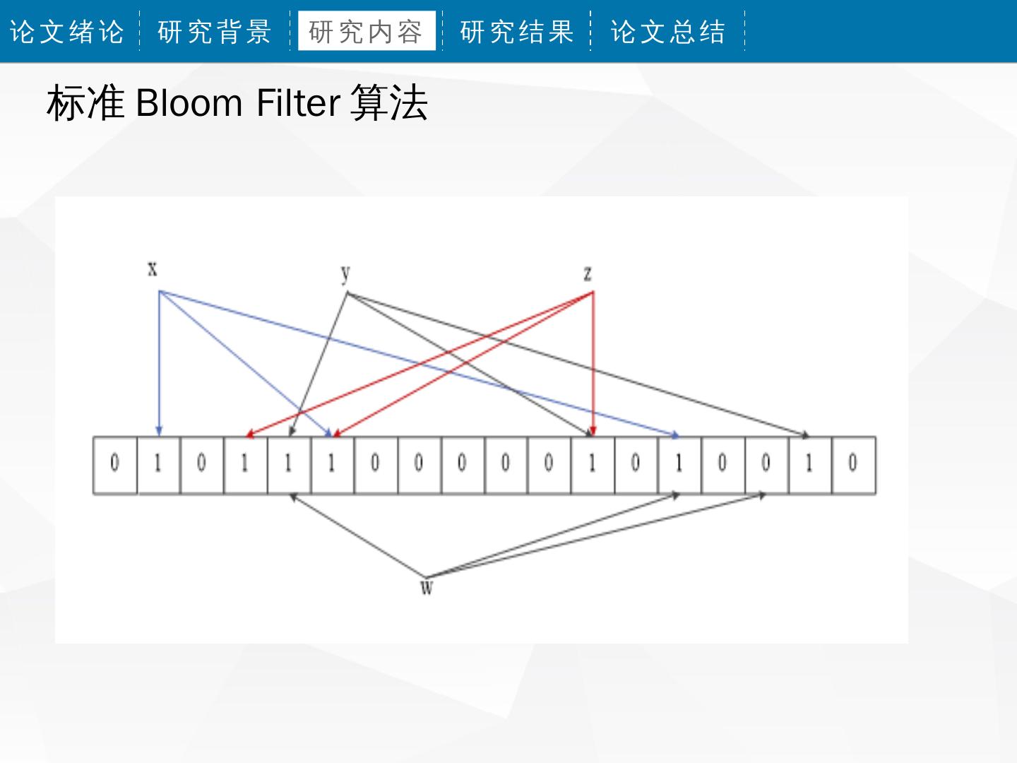 10 .论文绪论 研究背景 研究内容 研究结果 论文总结 改进的 Bloom Filte 算法