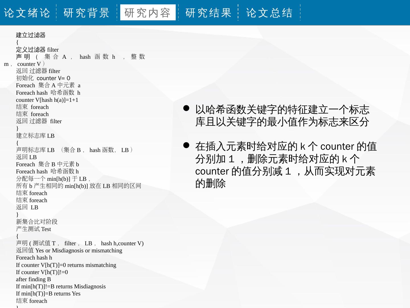 11 .论文绪论 研究背景 研究内容 研究结果 论文总结 建立过滤器 { 定义过滤器 filter 声 明 ( 集 合 A , hash 函 数 h , 整 数 m , counter V ) 返回 过滤器 filter 初始化 counter V= 0 Foreach 集合 A 中元素 a Foreach hash 哈希函数 h counter V[hash h(a)]=1+1 结束 foreach 结束 foreach 以哈希函数关键字的特征建立一个标志 返回 过滤器 filter 库且以关键字的最小值作为标志来区分 } 建立标志库 LB { 声明标志库 LB (集合 B , hash 函数, LB ) 在插入元素时给对应的 k 个 counter 的值 返回 LB Foreach 集合 B 中元素 b 分别加 1 ,删除元素时给对应的 k 个 Foreach hash 哈希函数 h counter 的值分别减 1 ,从而实现对元素 分配每一个 min[h(b)] 于 LB , 所有 b 产生相同的 min[h(b)] 放在 LB 相同的区间 的删除 结束 foreach 结束 foreach 返回 LB } 新集合比对阶段 产生测试 Test { 声明 ( 测试值 T , filter , LB , hash h,counter V) 返回值 Yes or Misdiagnosis or mismatching Foreach hash h If counter V[h(T)]=0 returns mismatching If counter V[h(T)]!=0 after finding B If min[h(T)]!=B returns Misdiagnosis If min[h(T)]=B returns Yes 结束 foreach