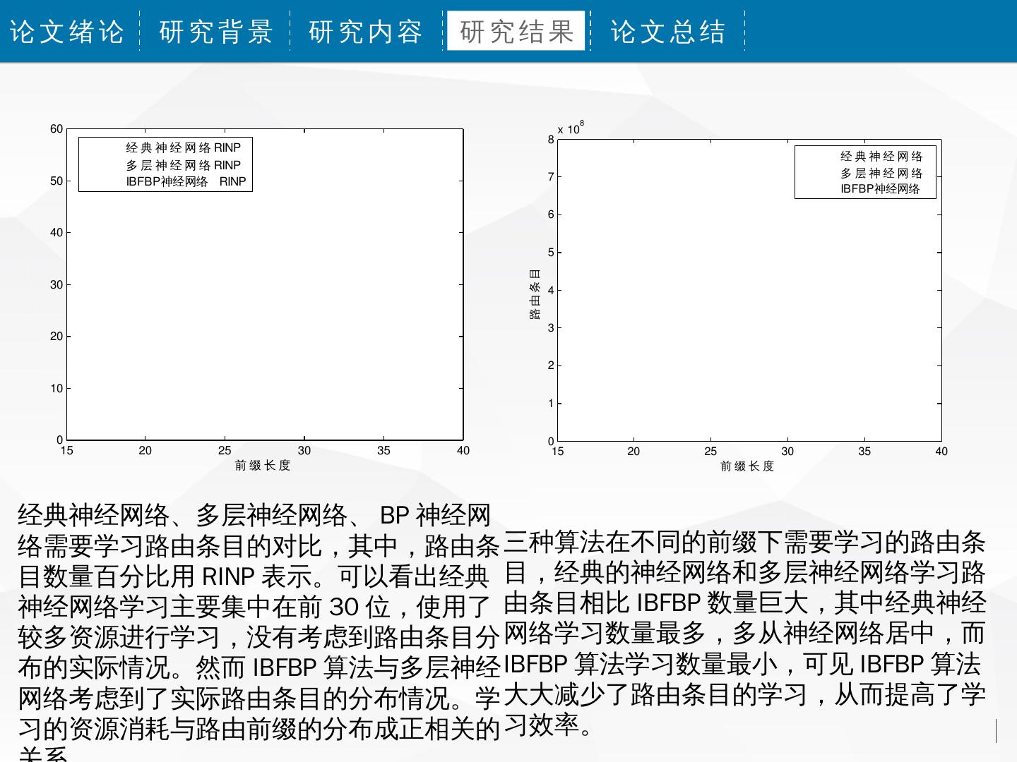 16 .论文绪论 研究背景 研究内容 研究结果 论文总结 8 60 x 10 8 经 典 神 经 网 络 RINP 经典神经网络 多 层 神 经 网 络 RINP 7 多层神经网络 50 IBFBP神经网络 RINP IBFBP神经网络 6 40 5 路由条目 30 4 3 20 2 10 1 0 0 15 20 25 30 35 40 15 20 25 30 35 40 前缀长度 前缀长度 经典神经网络、多层神经网络、 BP 神经网 络需要学习路由条目的对比,其中,路由条 三种算法在不同的前缀下需要学习的路由条 目数量百分比用 RINP 表示。可以看出经典 目,经典的神经网络和多层神经网络学习路 神经网络学习主要集中在前 30 位,使用了 由条目相比 IBFBP 数量巨大,其中经典神经 较多资源进行学习,没有考虑到路由条目分 网络学习数量最多,多从神经网络居中,而 布的实际情况。然而 IBFBP 算法与多层神经 IBFBP 算法学习数量最小,可见 IBFBP 算法 网络考虑到了实际路由条目的分布情况。学 大大减少了路由条目的学习,从而提高了学 习的资源消耗与路由前缀的分布成正相关的 习效率。