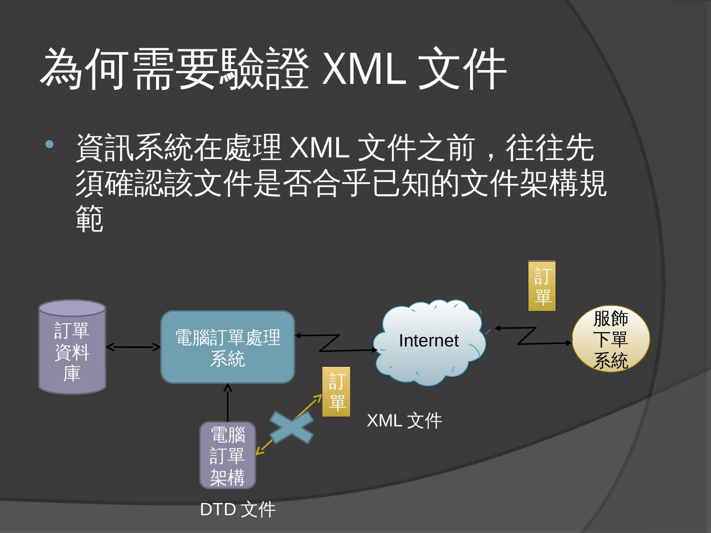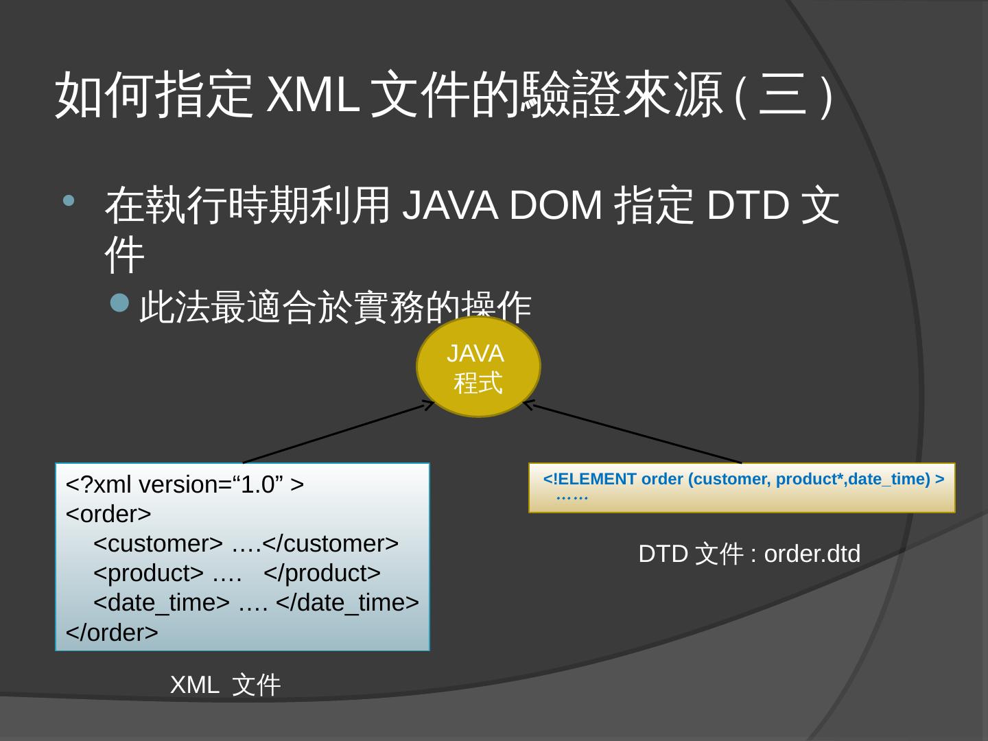 利用JAVA DOM 進行DTD驗證XML文件. 銘傳大學資訊工程學系 王豐緒. 為何需要驗證XML文件. 資訊系統在處理XML文件之前,往往先須確認該文件是否合乎已知的 ...