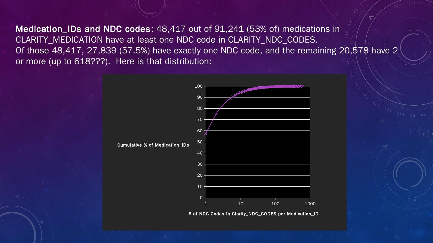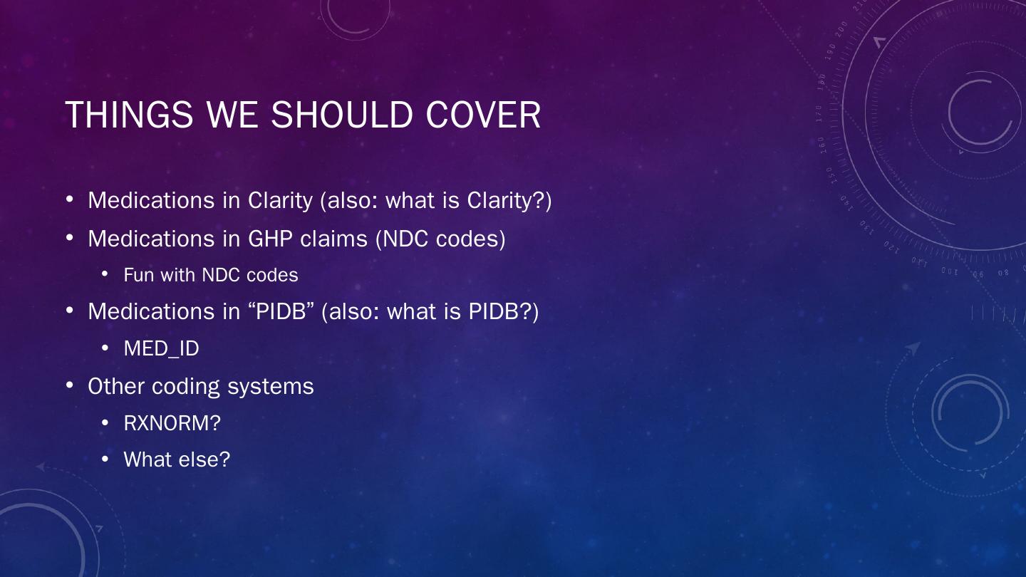 Fun with NDC codes. Medications in “PIDB” (also: what is PIDB?) MED_ID. Other coding systems. RXNORM? What else? Medications in Clarity. (also: what is ...