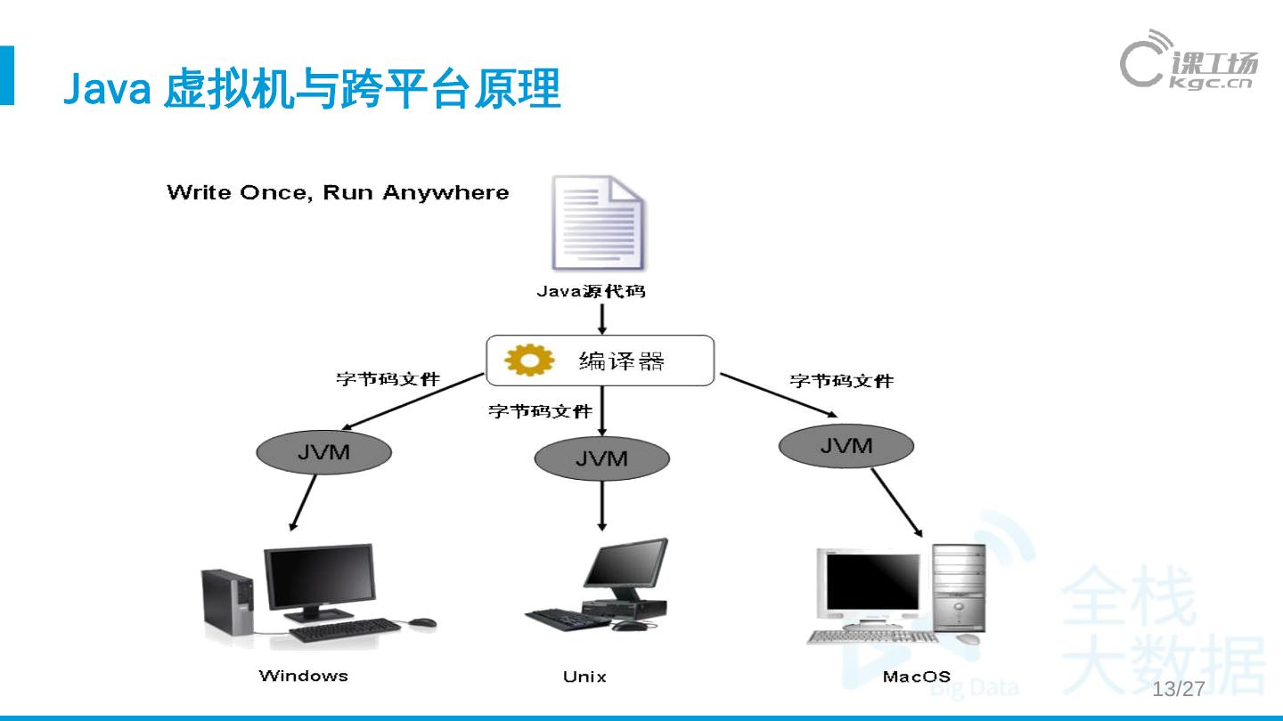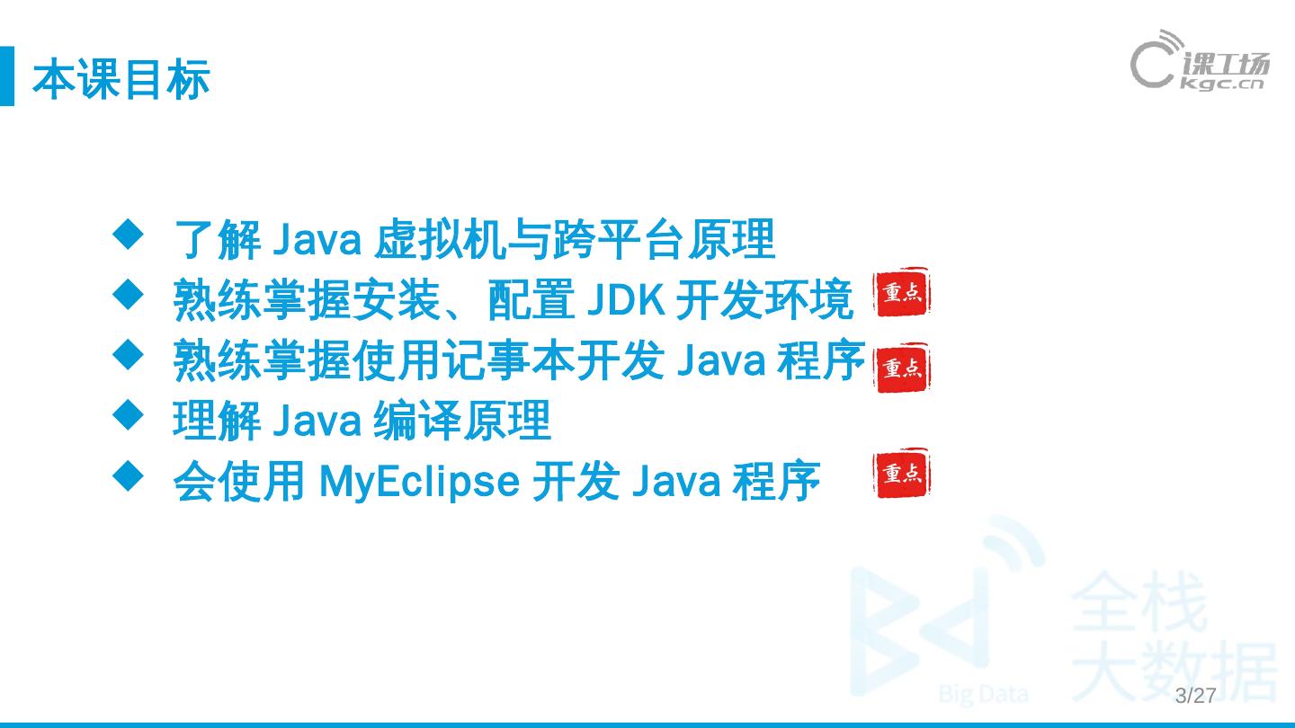 了解Java虚拟机与跨平台原理; 熟练掌握安装、配置JDK开发环境; 熟练掌握使用记事本开发Java程序; 理解Java编译原理; 会使用MyEclipse开发Java程序. 本课目标.