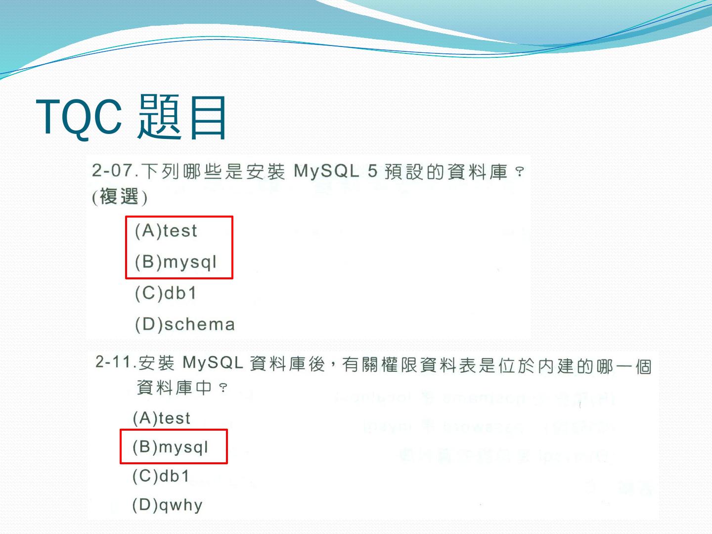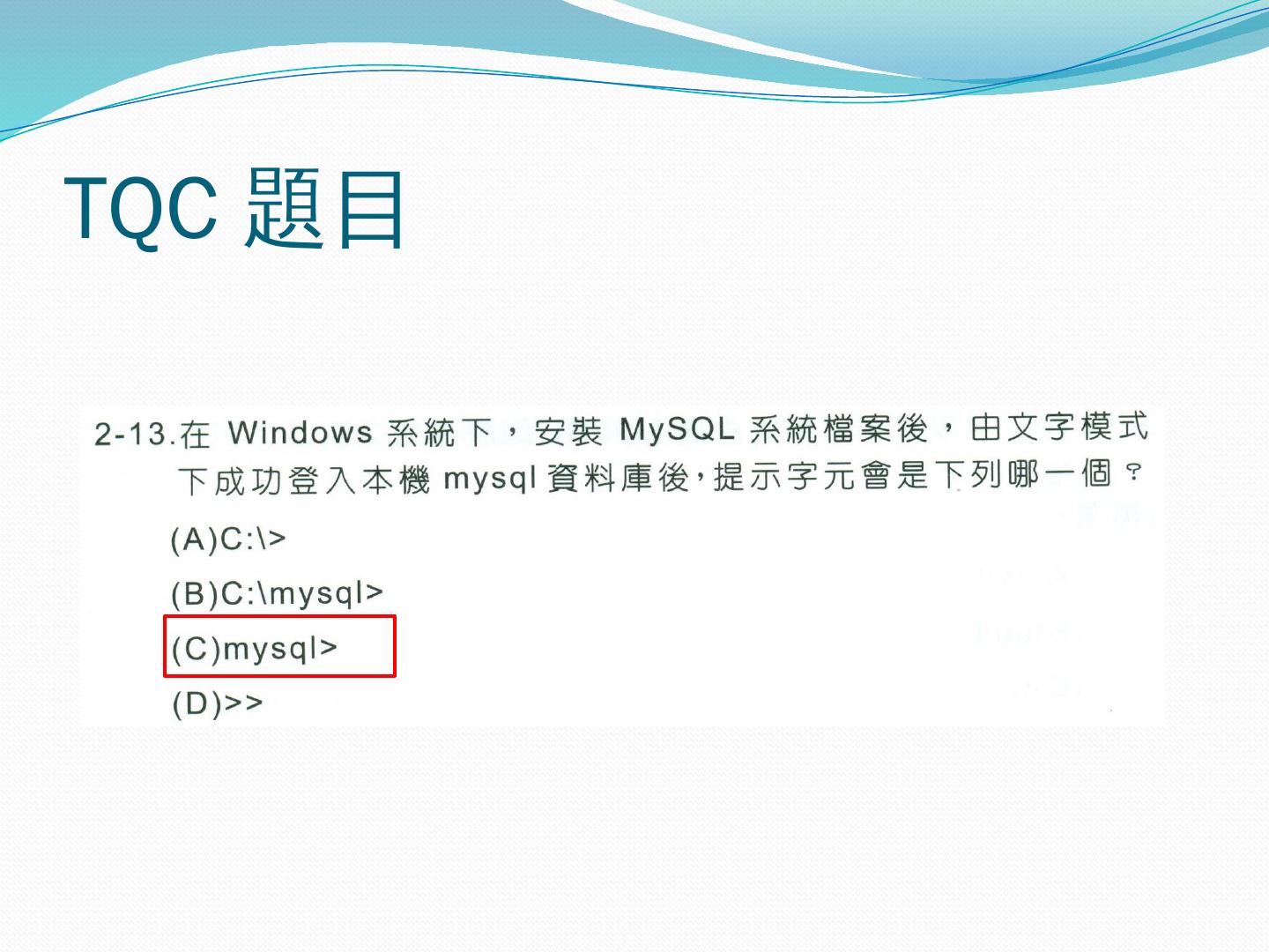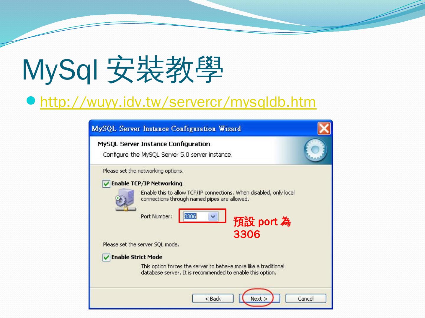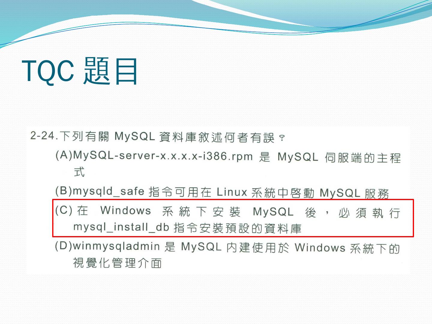 http://wuyy.idv.tw/servercr/mysqldb.htm. 預設port為3306. MySql安裝教學. http://wuyy.idv.tw/servercr/mysqldb.htm. 自行設定密碼. TQC題目. MySQL 的目錄架構.