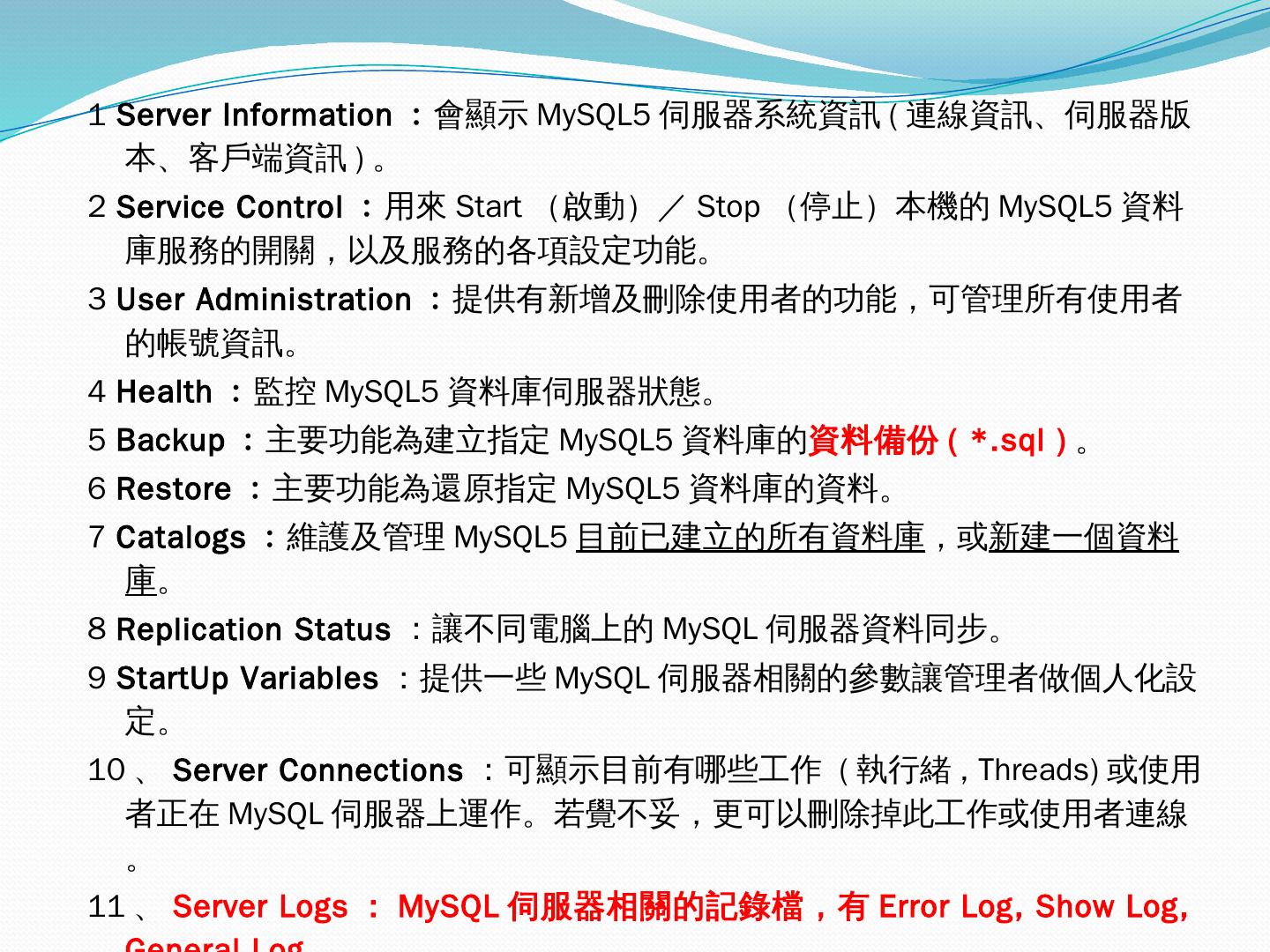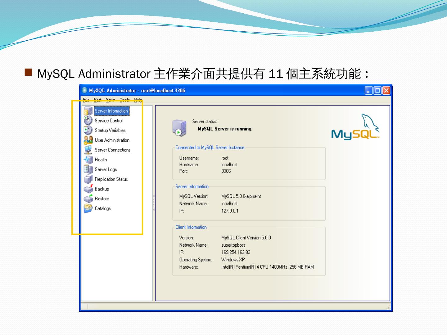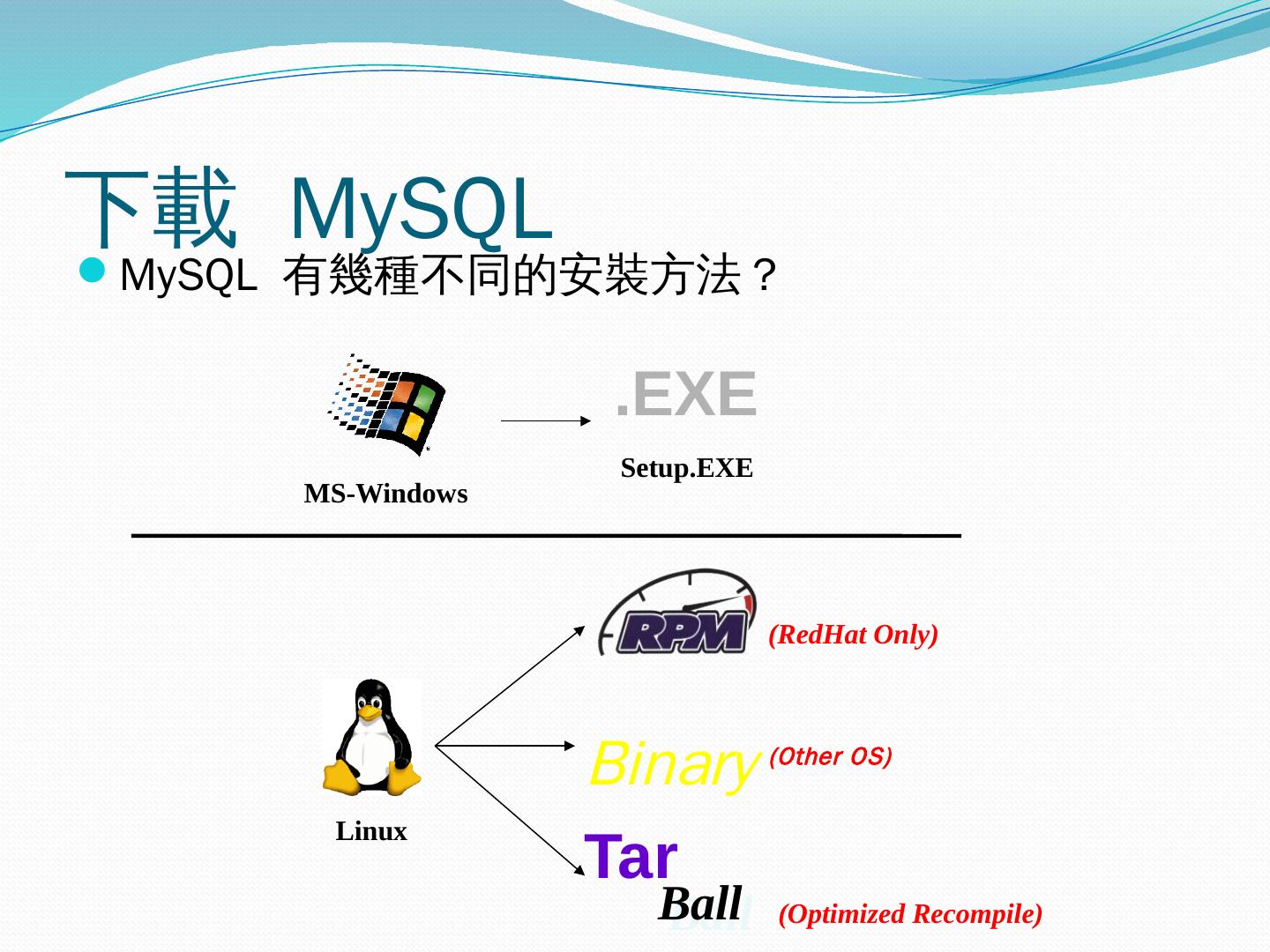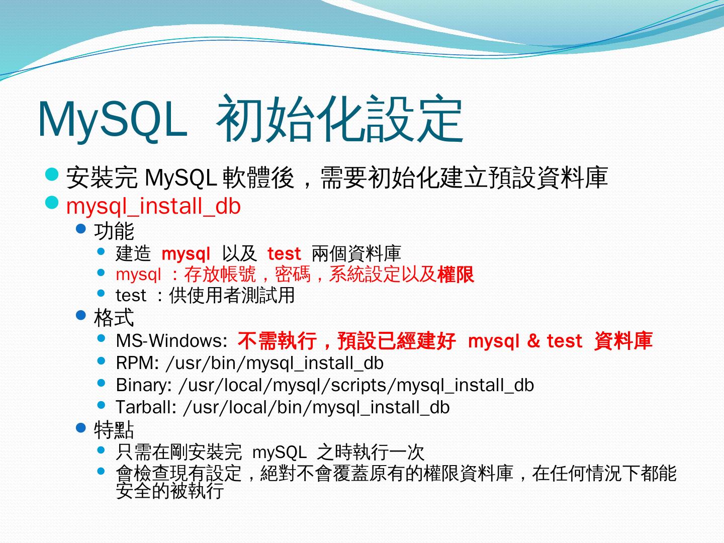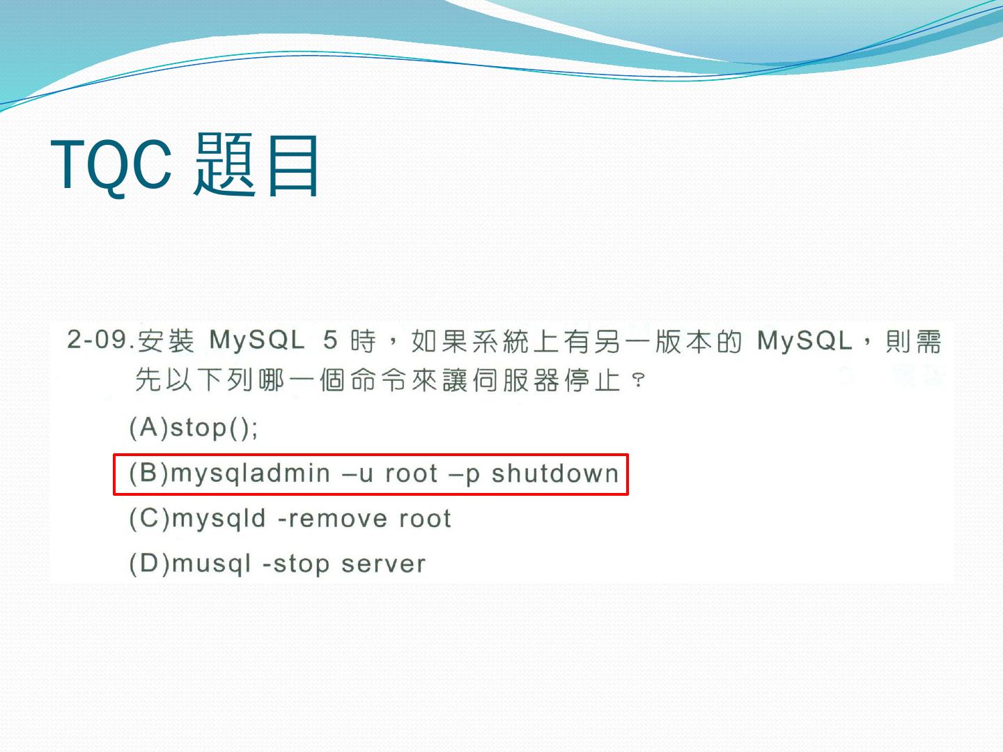 http://wuyy.idv.tw/servercr/mysqldb.htm. 預設port為3306. MySql安裝教學. http://wuyy.idv.tw/servercr/mysqldb.htm. 自行設定密碼. TQC題目. MySQL 的目錄架構.
