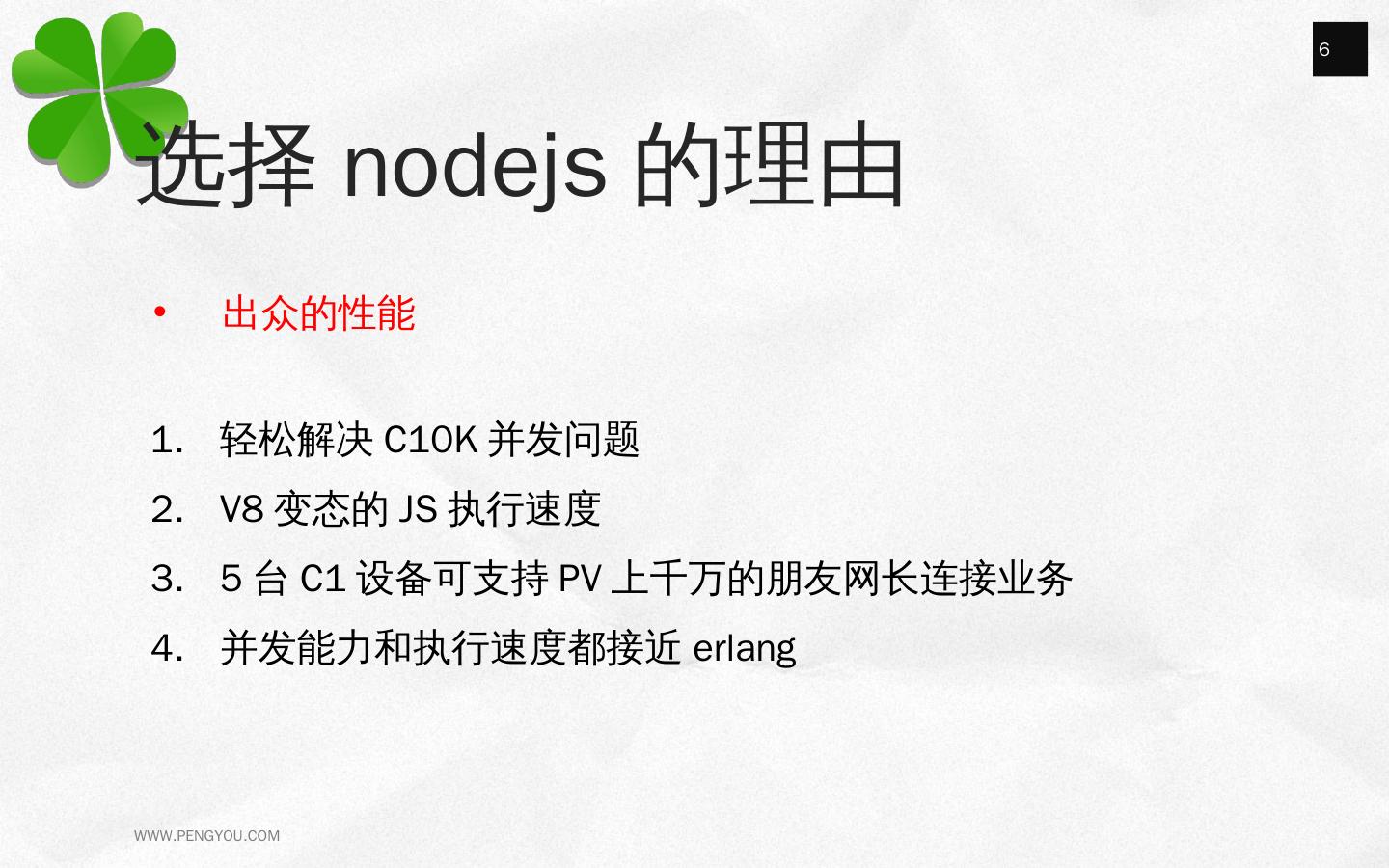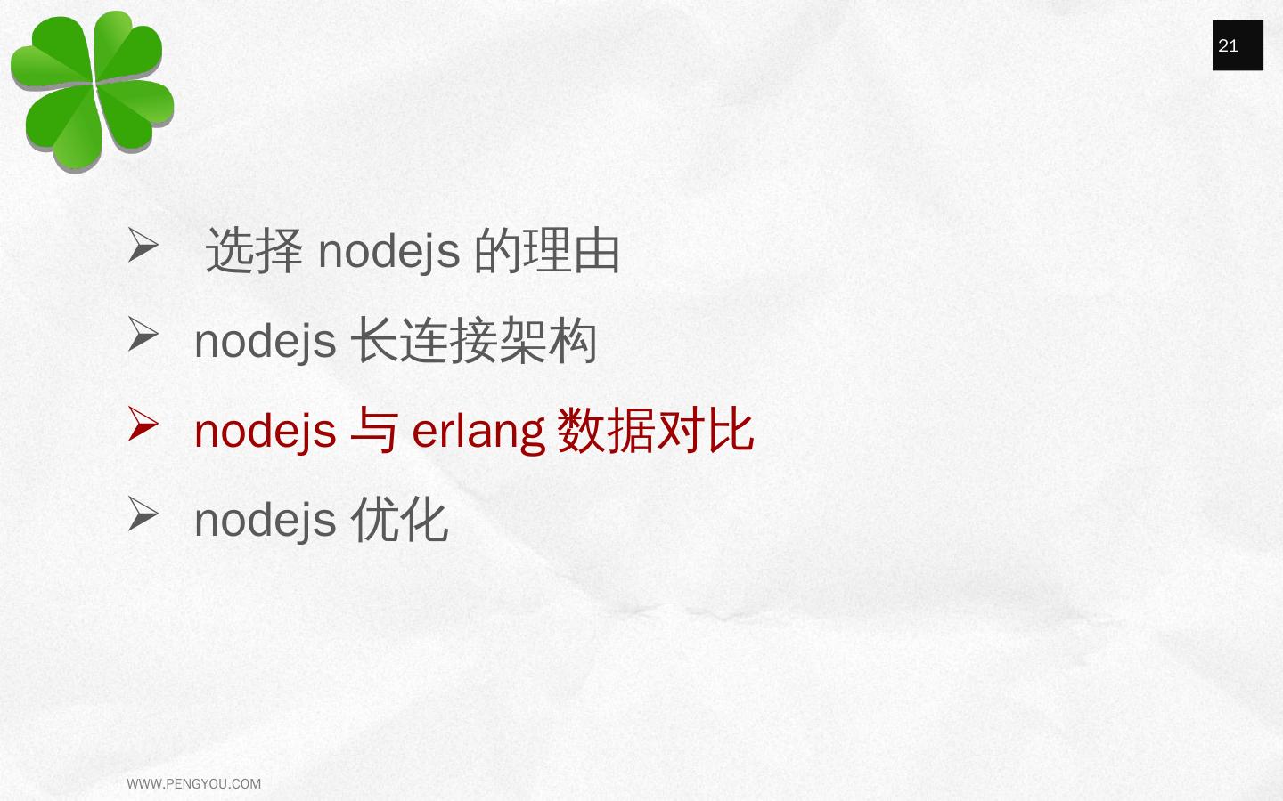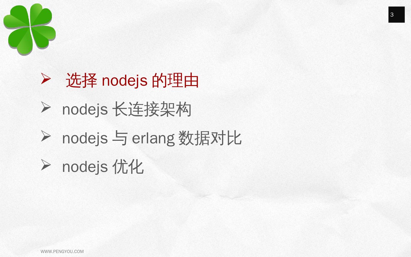 nodejs在朋友网的实践. 2. WWW.PENGYOU.COM. 选择nodejs的理由; nodejs长连接架构; nodejs与erlang数据对比; nodejs优化. 3. WWW.PENGYOU.COM.