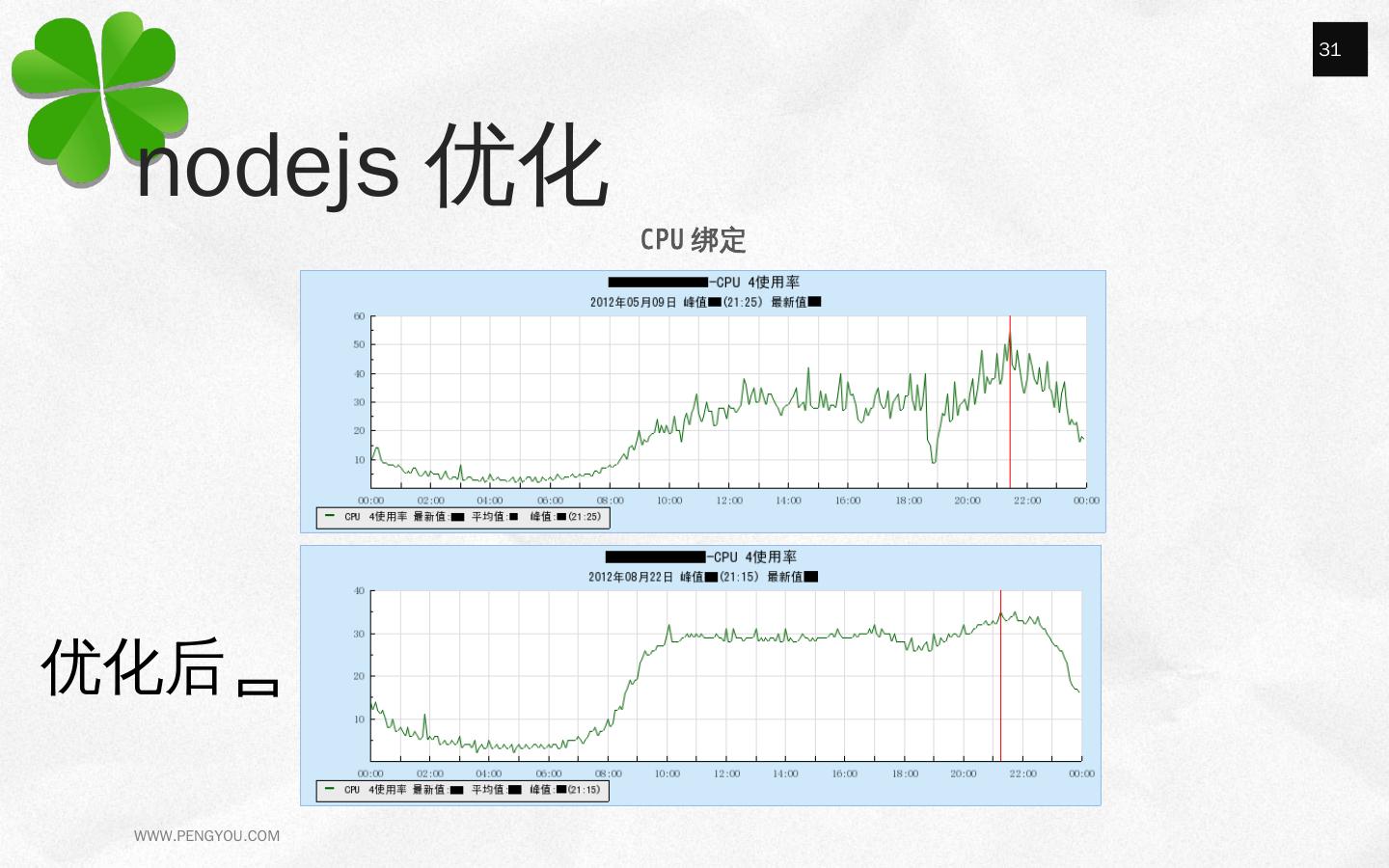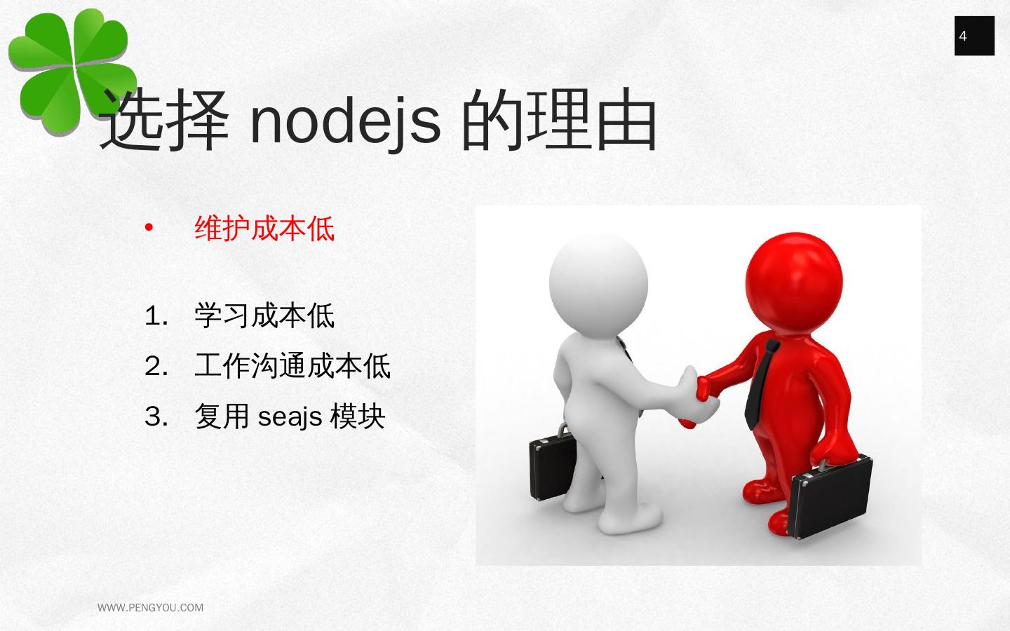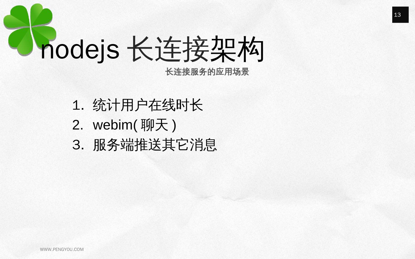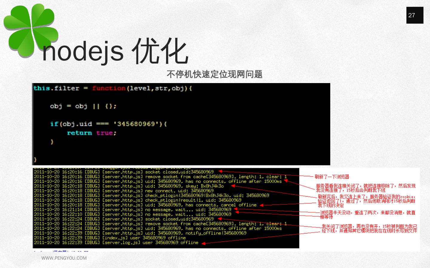 nodejs在朋友网的实践. 2. WWW.PENGYOU.COM. 选择nodejs的理由; nodejs长连接架构; nodejs与erlang数据对比; nodejs优化. 3. WWW.PENGYOU.COM.