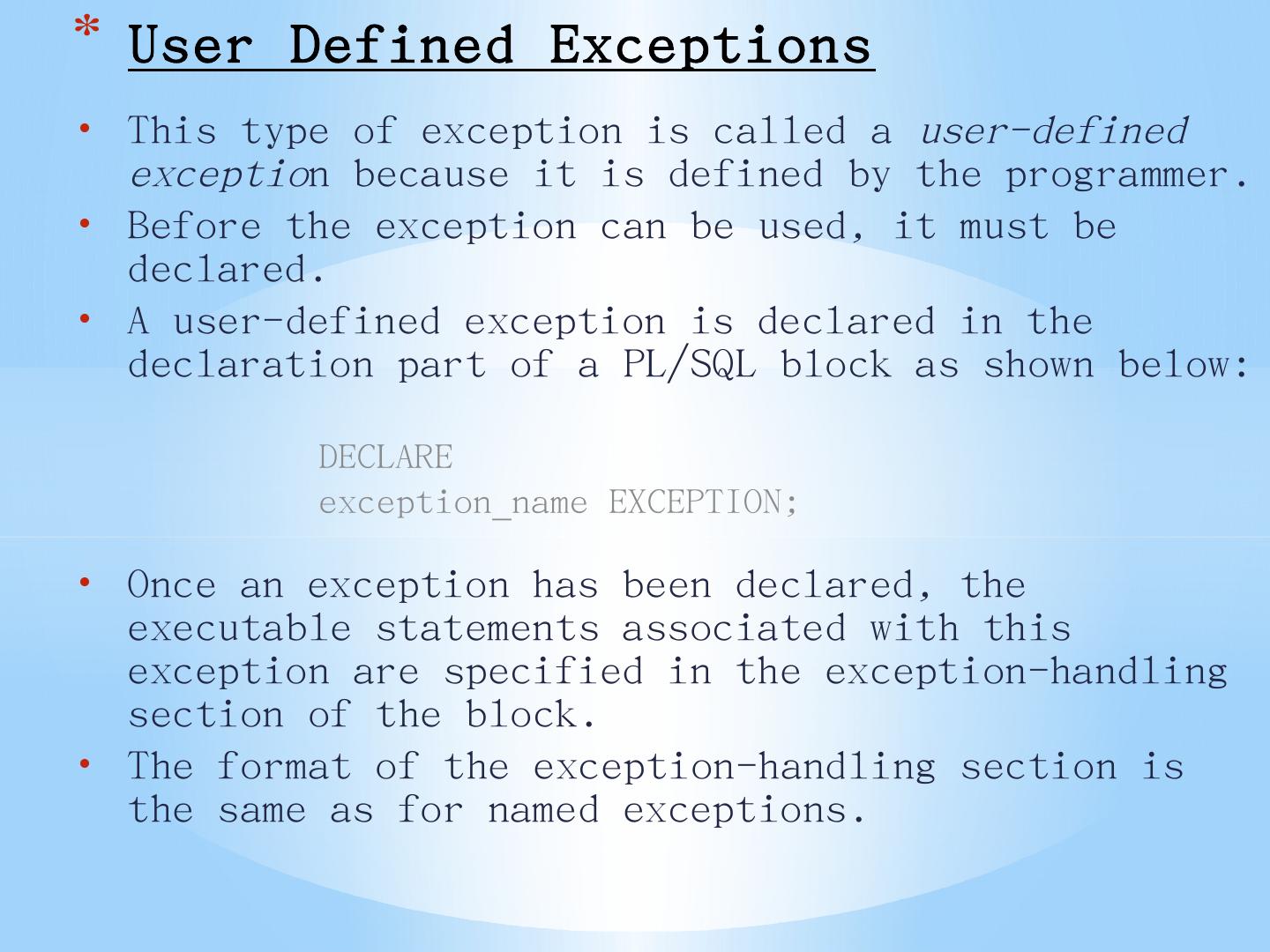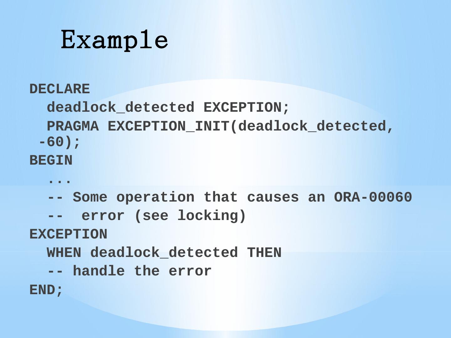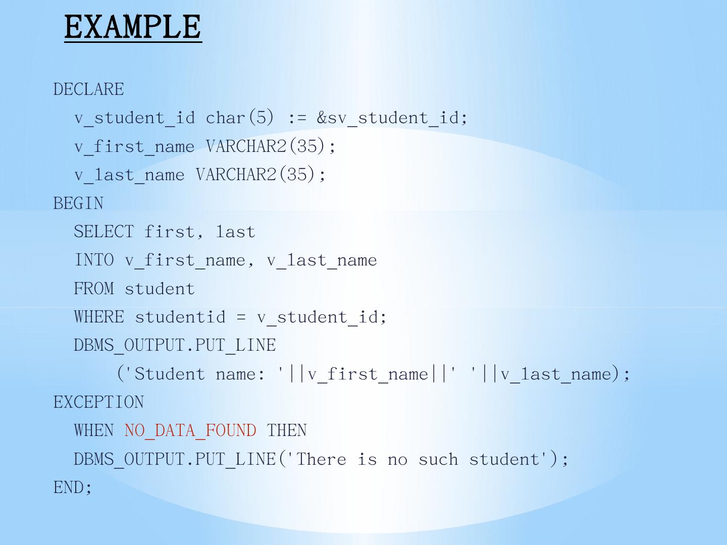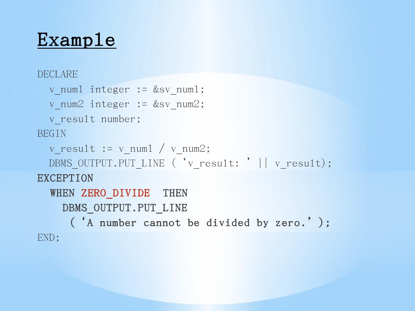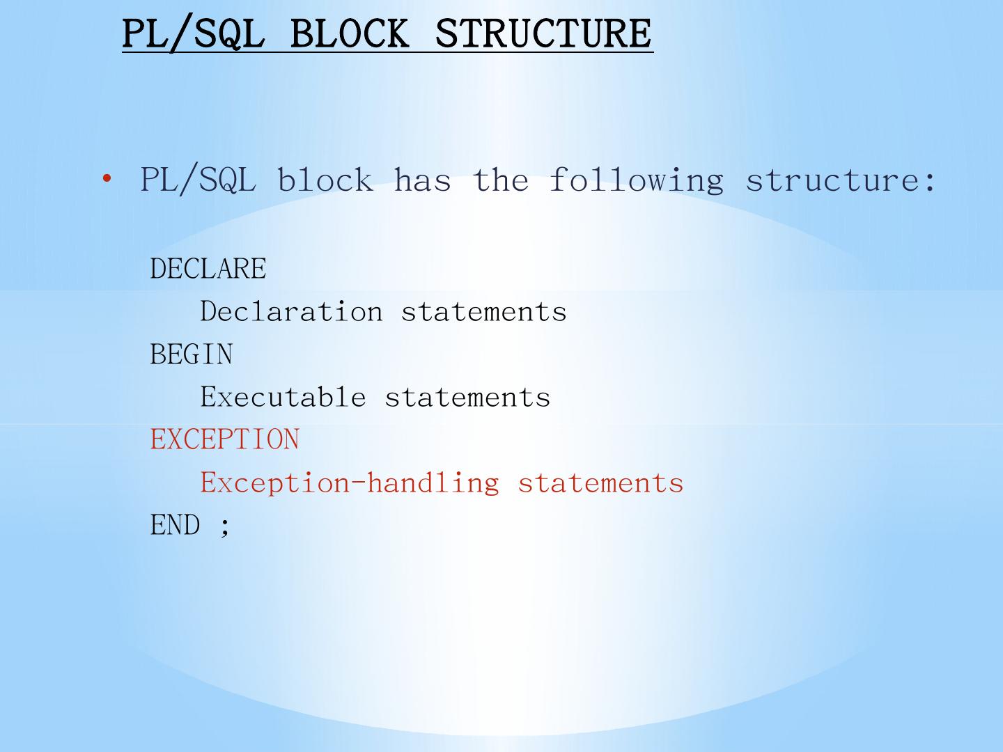 PL/SQL block has the following structure: DECLARE. Declaration statements. BEGIN. Executable statements. EXCEPTION. Exception-handling statements.