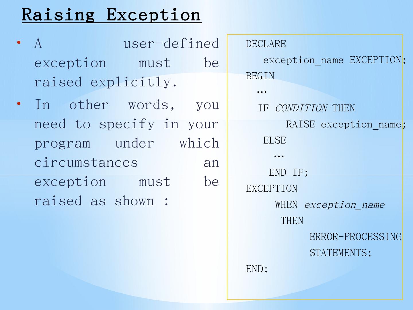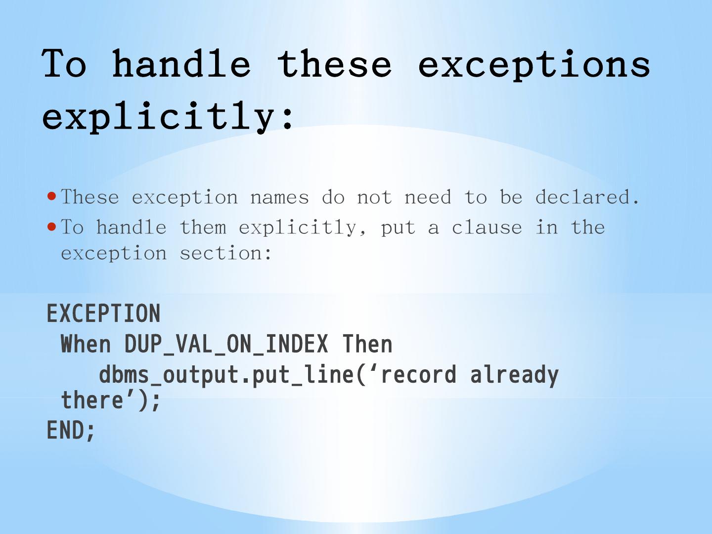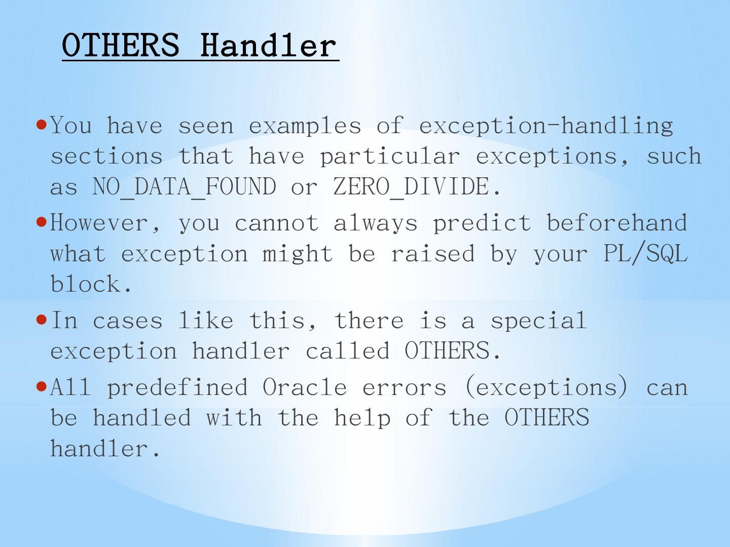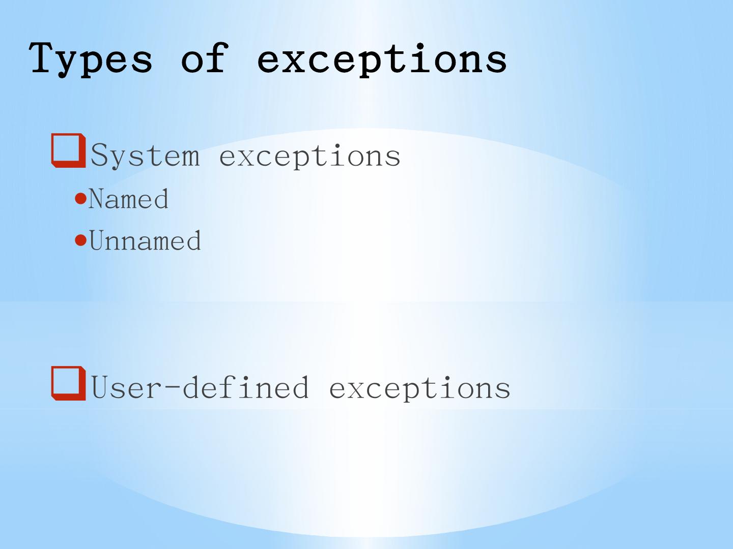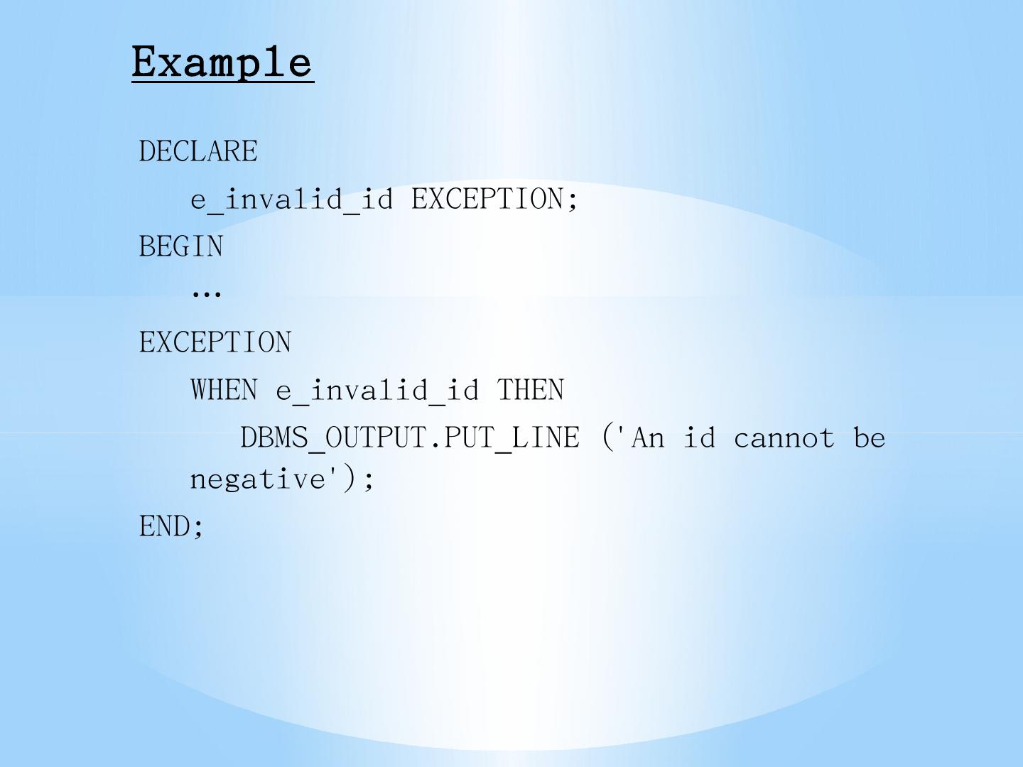 PL/SQL block has the following structure: DECLARE. Declaration statements. BEGIN. Executable statements. EXCEPTION. Exception-handling statements.
