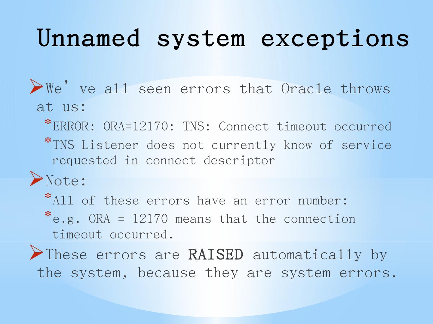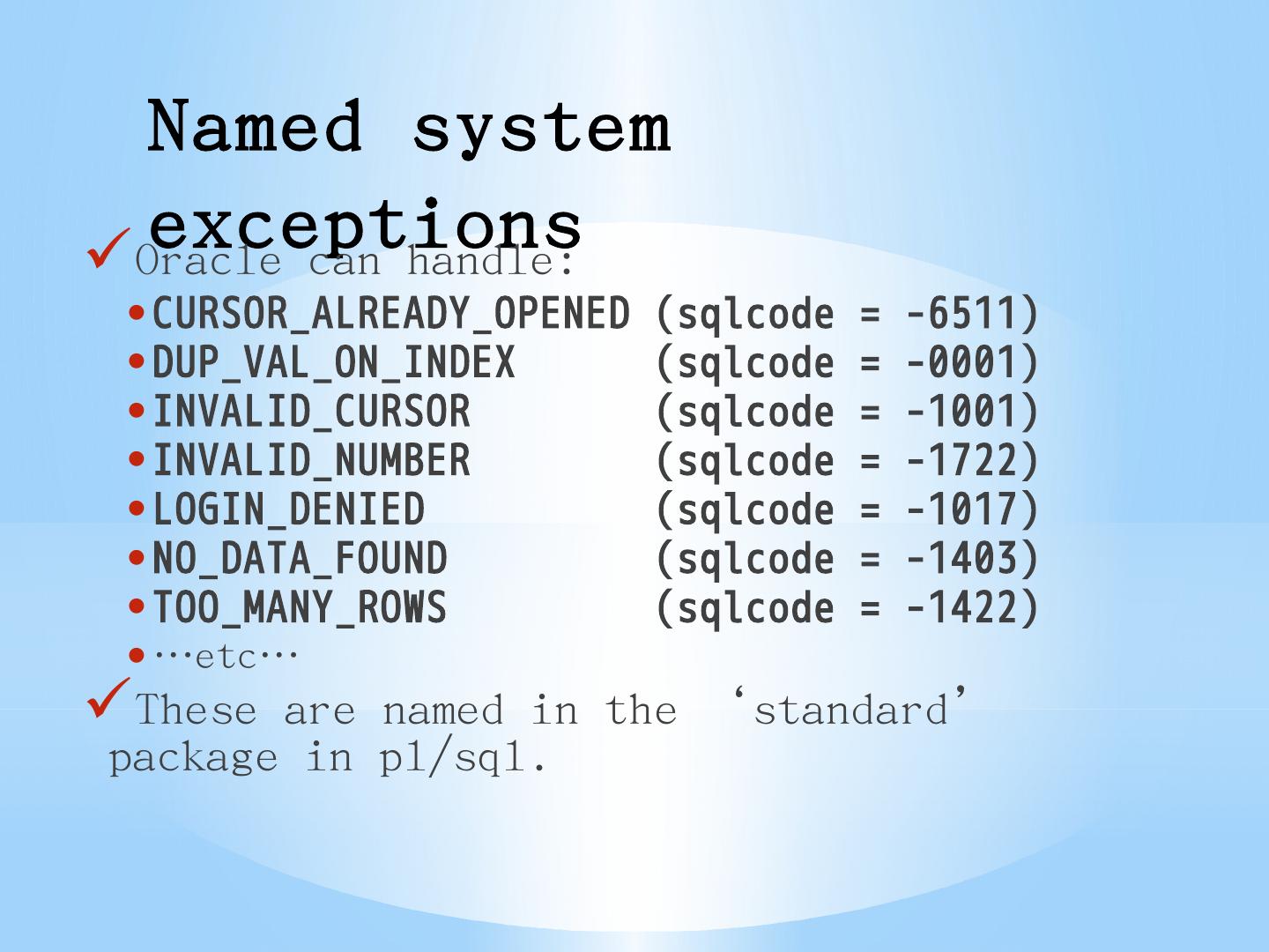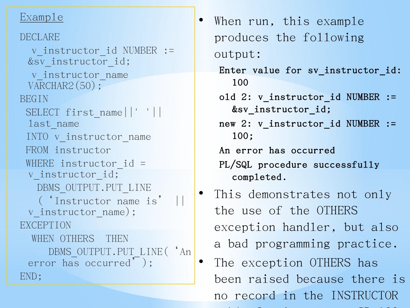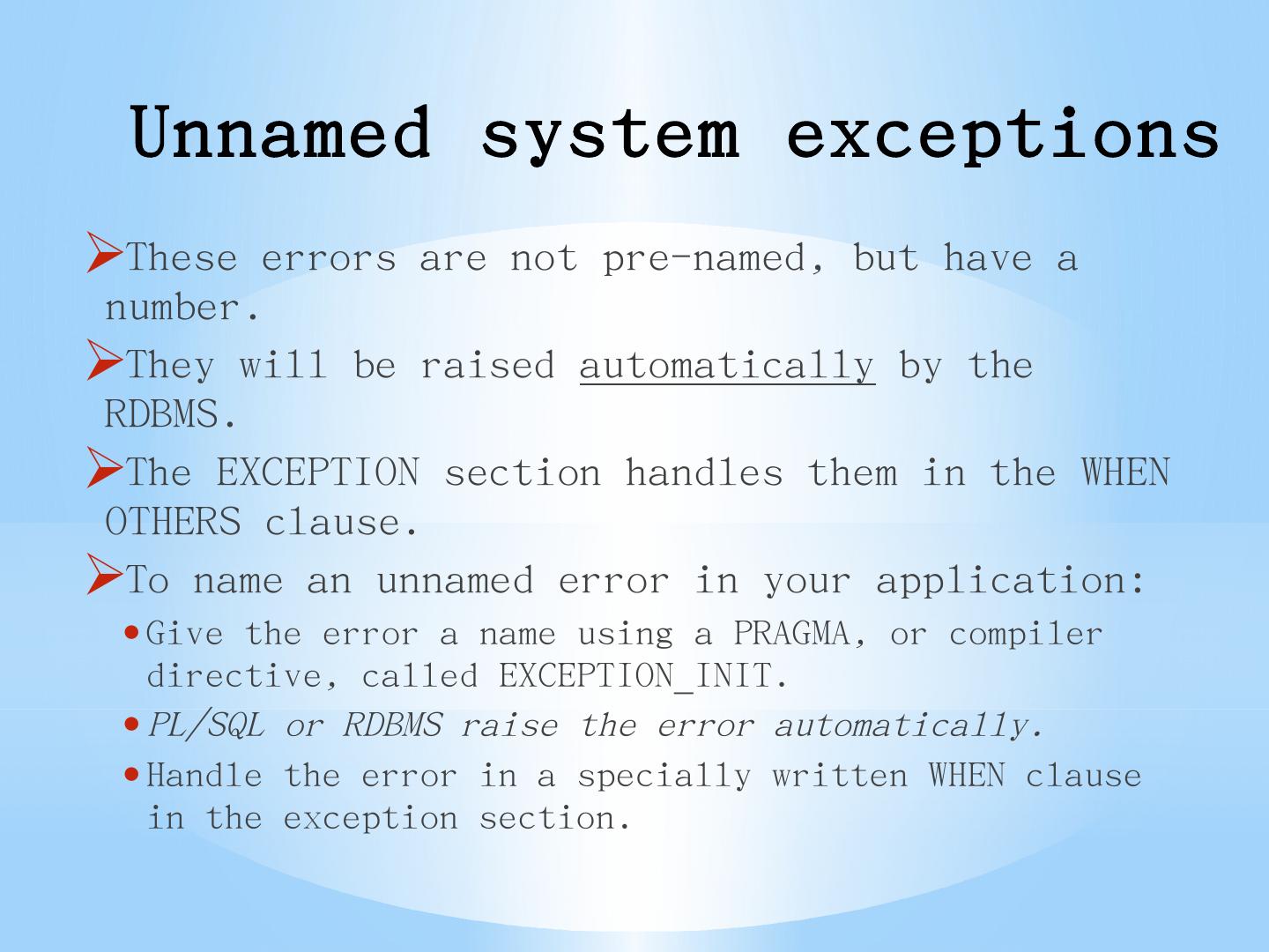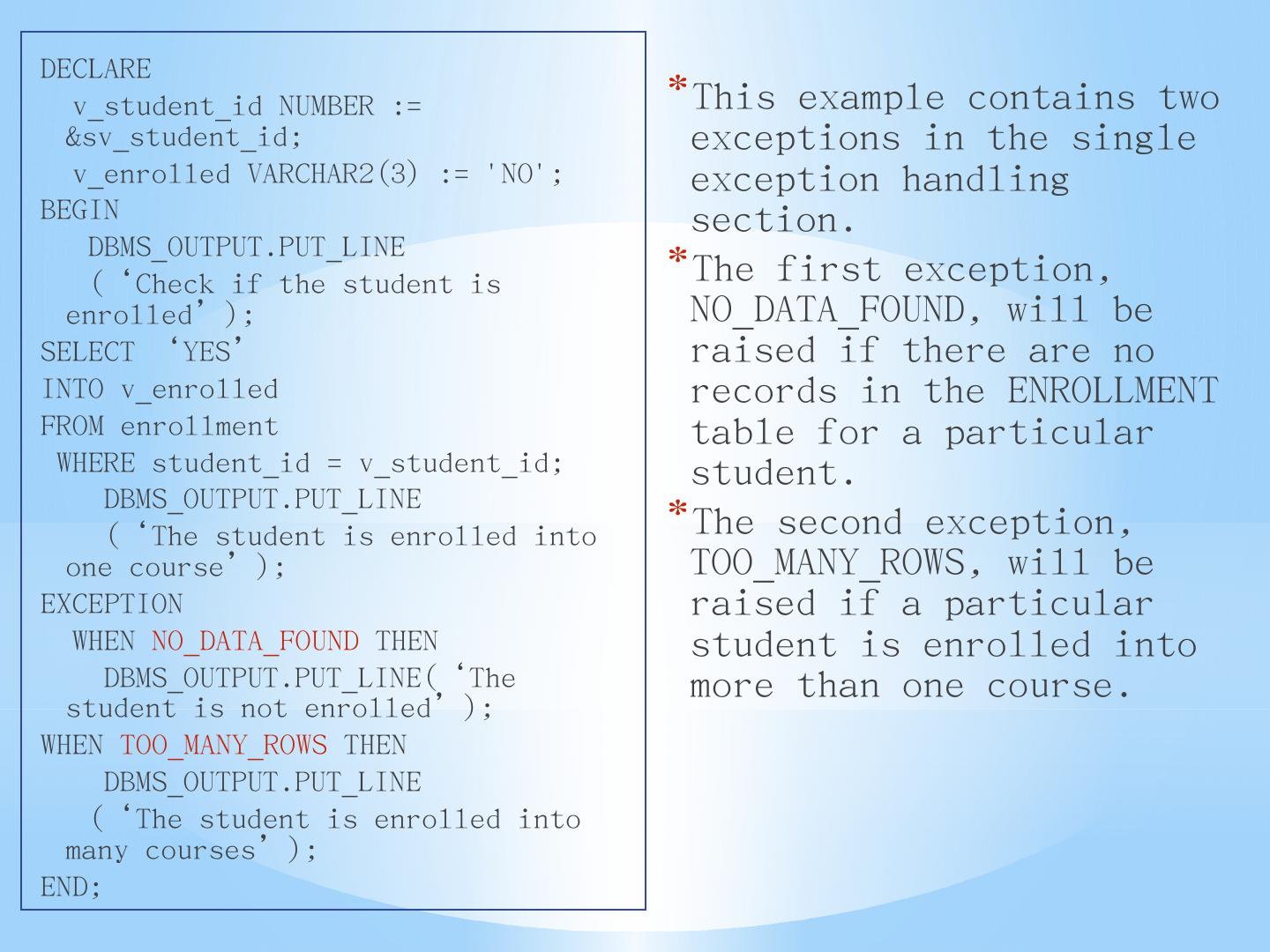 PL/SQL block has the following structure: DECLARE. Declaration statements. BEGIN. Executable statements. EXCEPTION. Exception-handling statements.