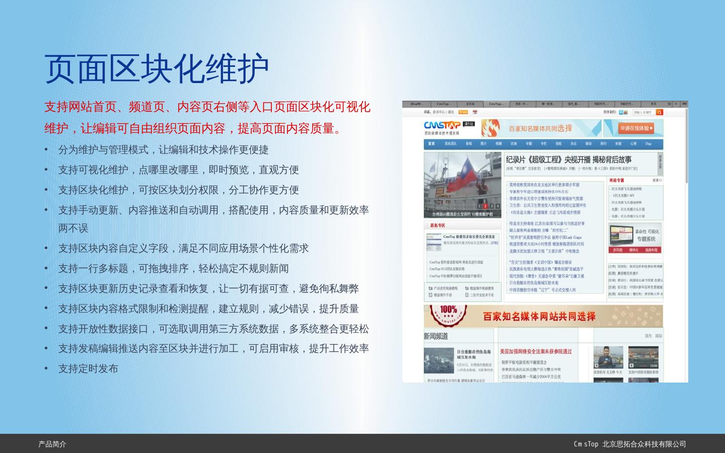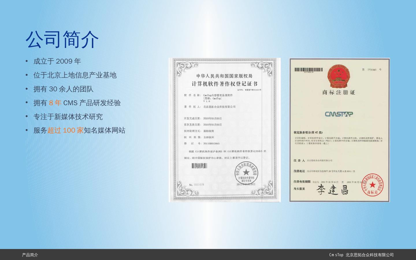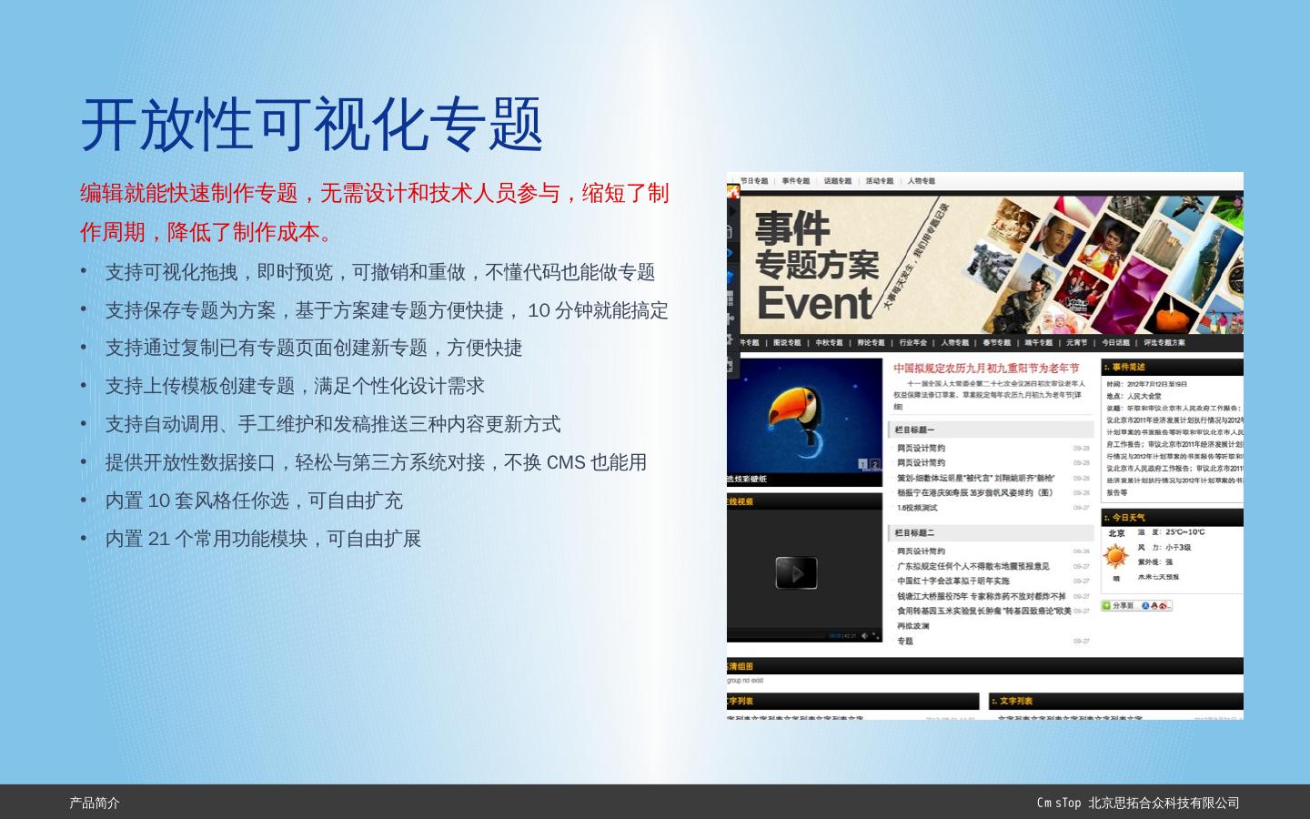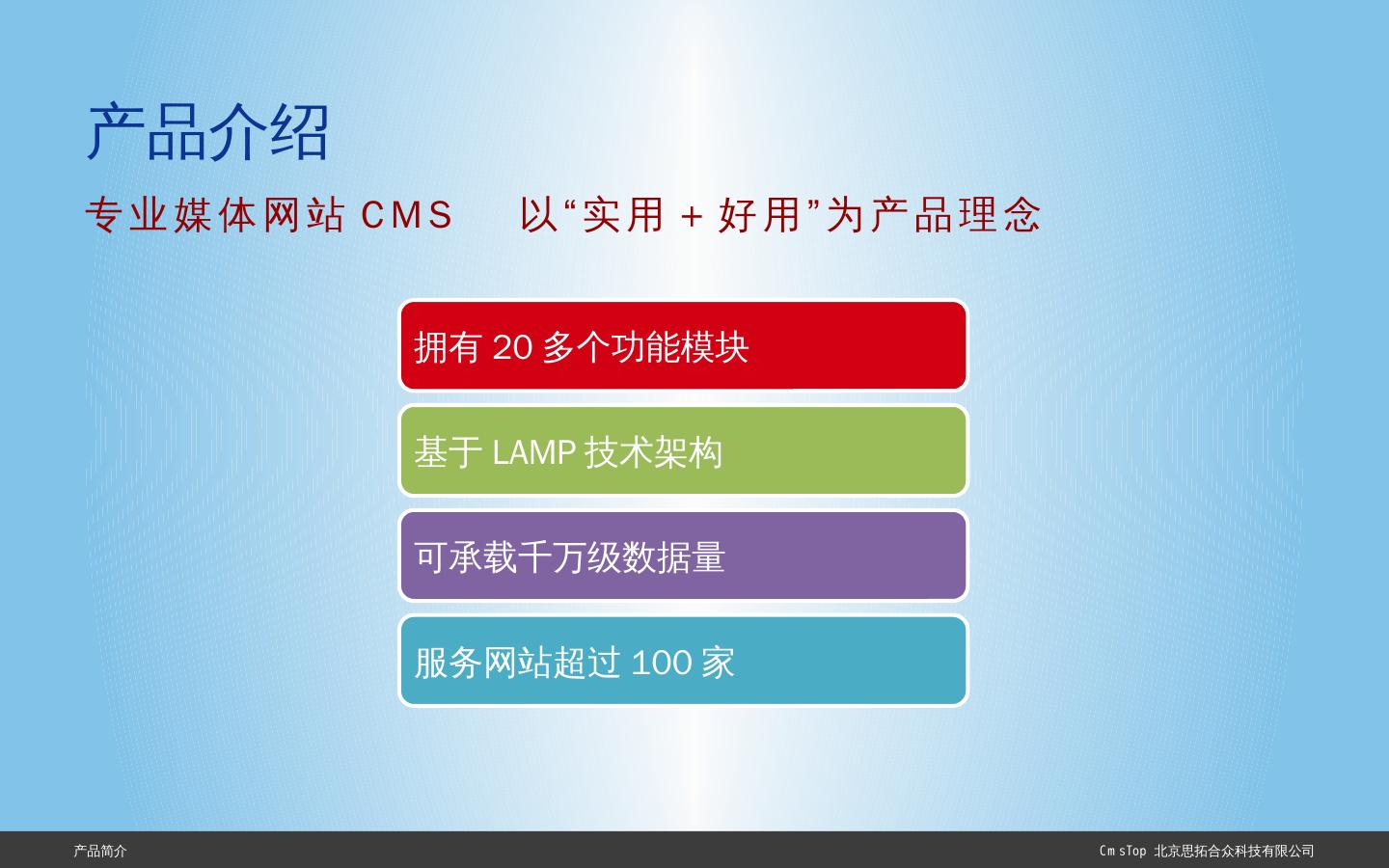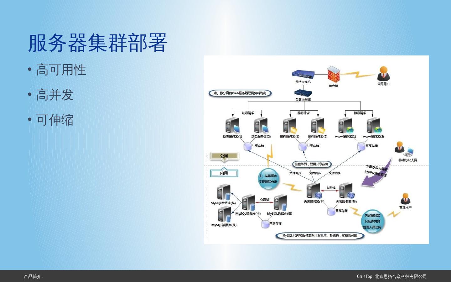 基于LAMP技术架构. 可承载千万级数据量. 服务网站超过100家 .... 服务器集群部署. 高可用性; 高并发; 可伸缩. CmsTop 北京思拓合众科技有限公司. 产品简介.
