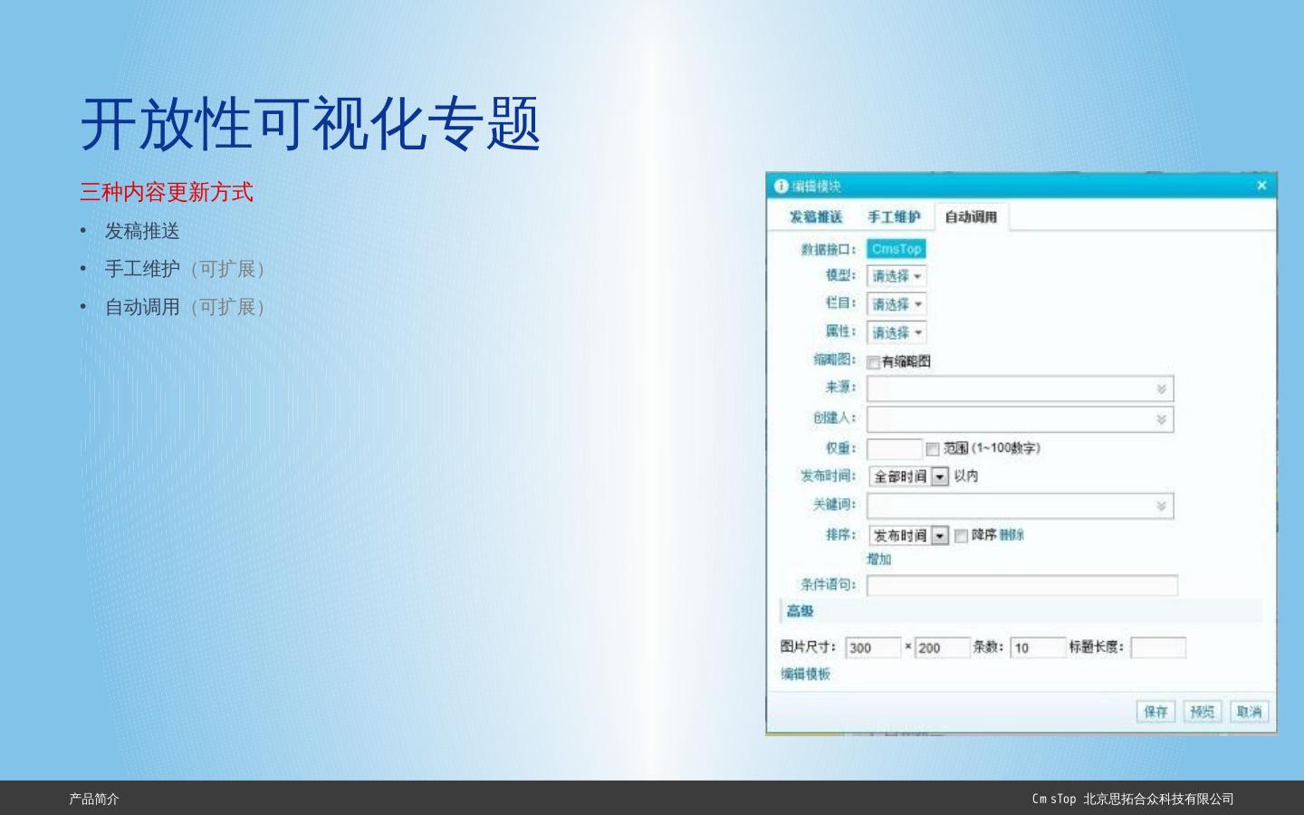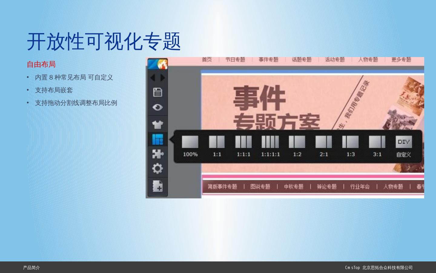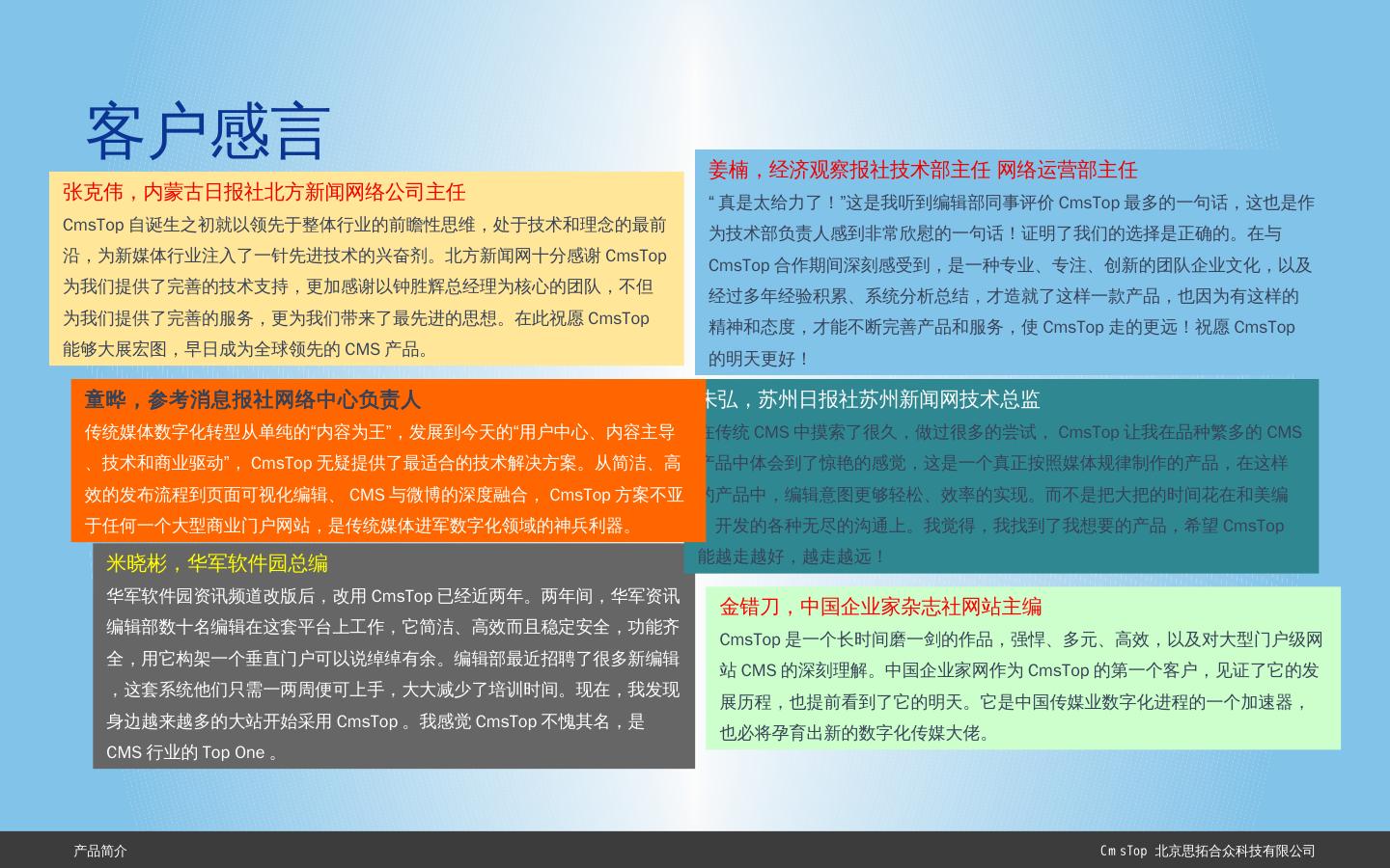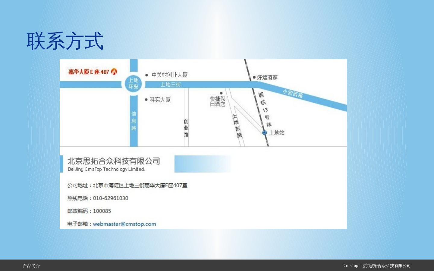 基于LAMP技术架构. 可承载千万级数据量. 服务网站超过100家 .... 服务器集群部署. 高可用性; 高并发; 可伸缩. CmsTop 北京思拓合众科技有限公司. 产品简介.