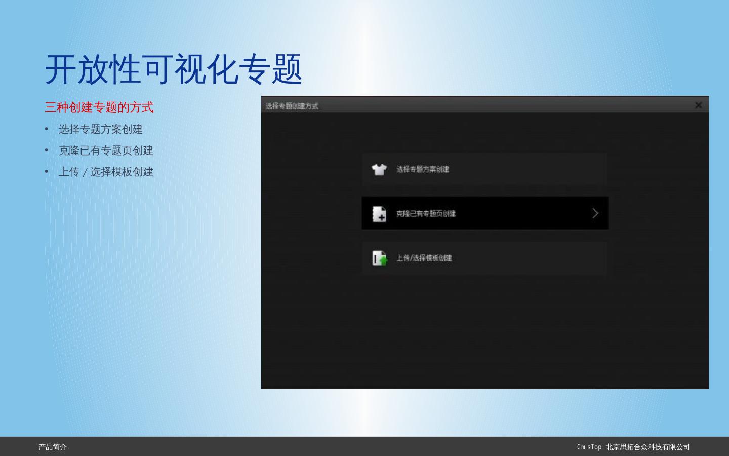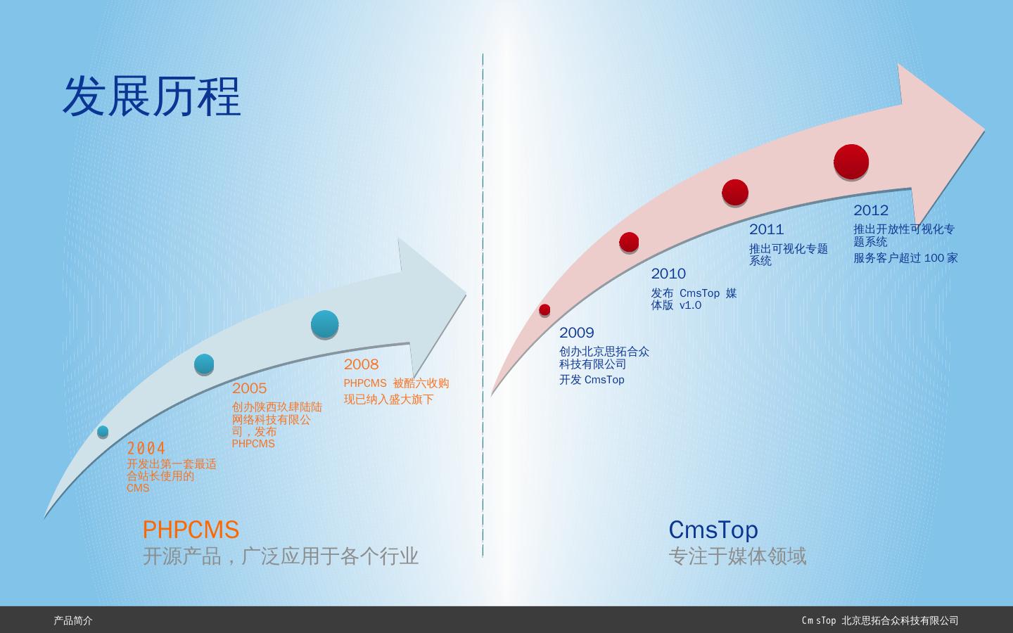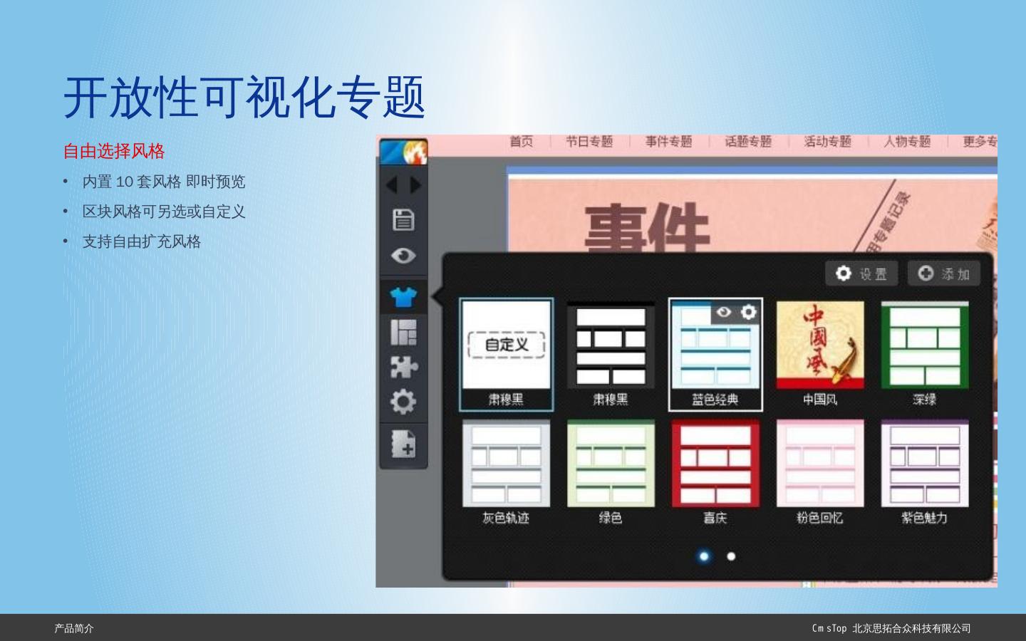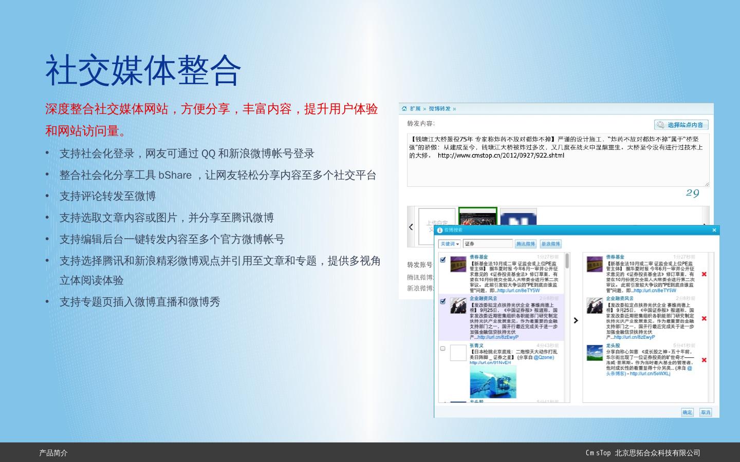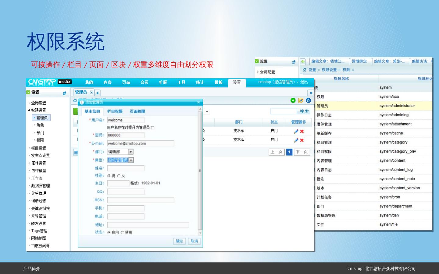 基于LAMP技术架构. 可承载千万级数据量. 服务网站超过100家 .... 服务器集群部署. 高可用性; 高并发; 可伸缩. CmsTop 北京思拓合众科技有限公司. 产品简介.