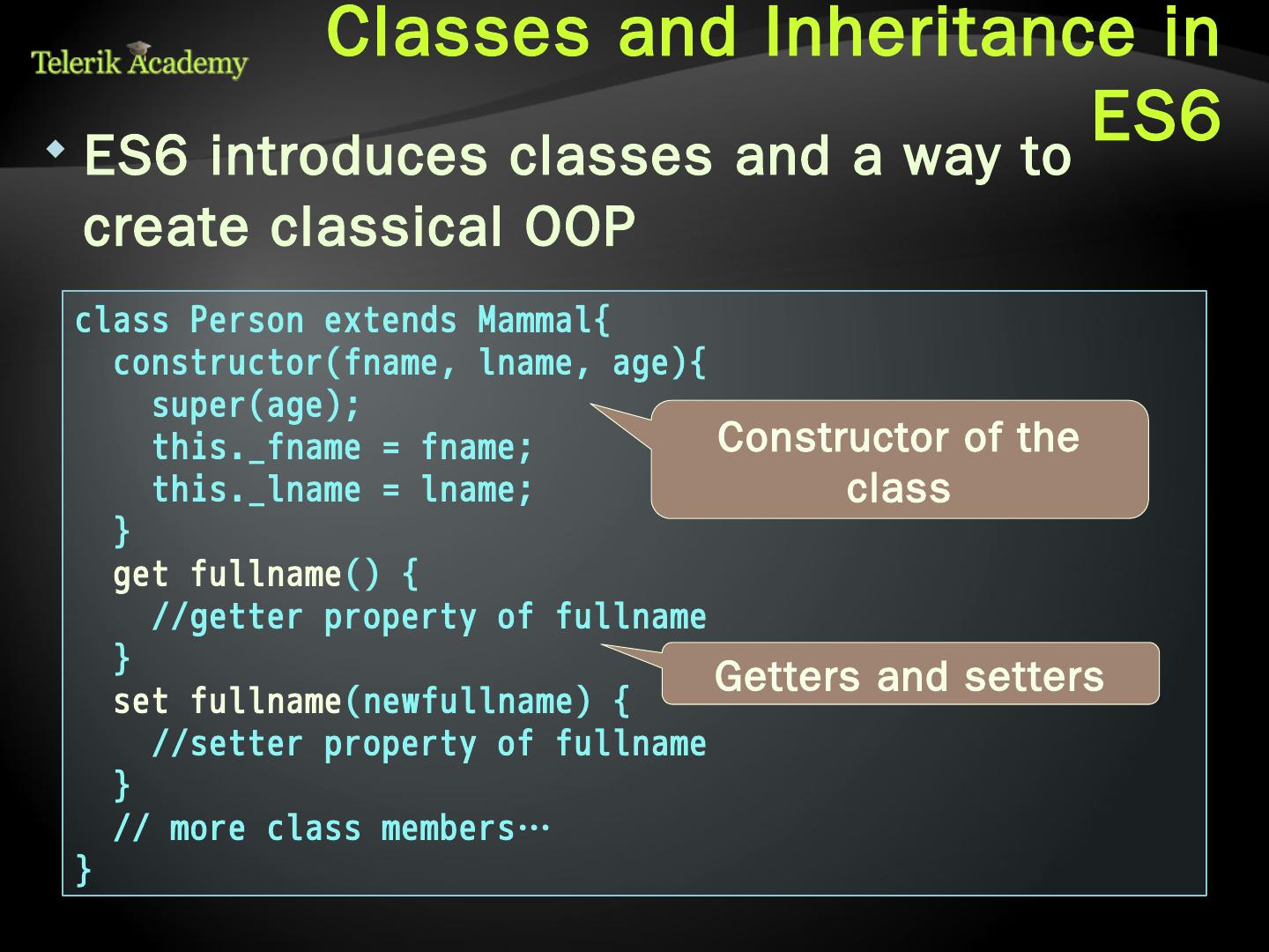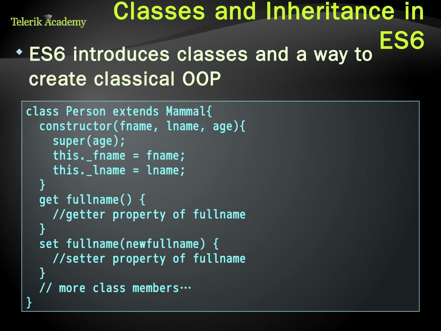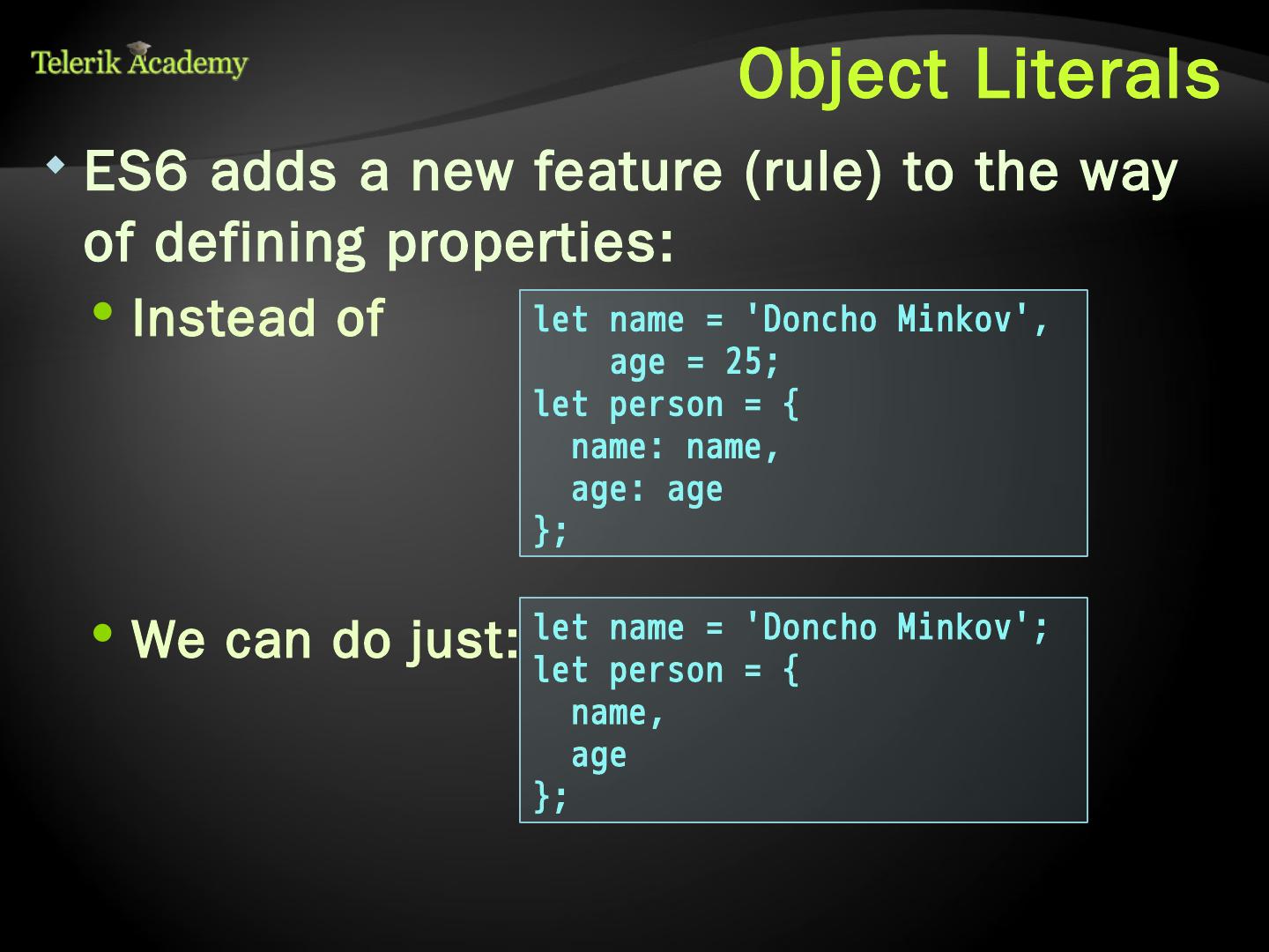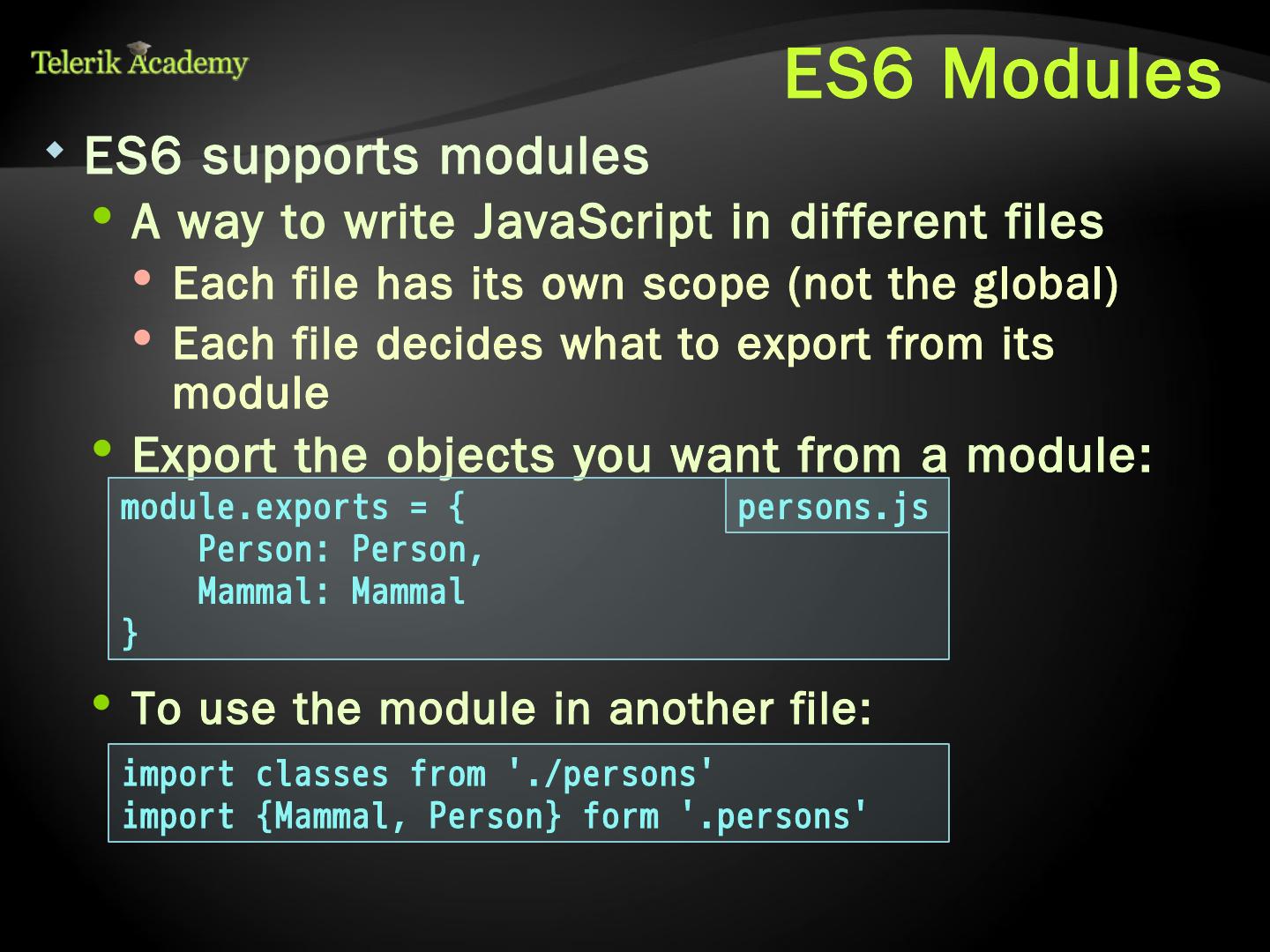 ES6 introduces new ways to declare variables: ... ES6 introduces classes and a way to create classical OOP .... Export the objects you want from a module:.