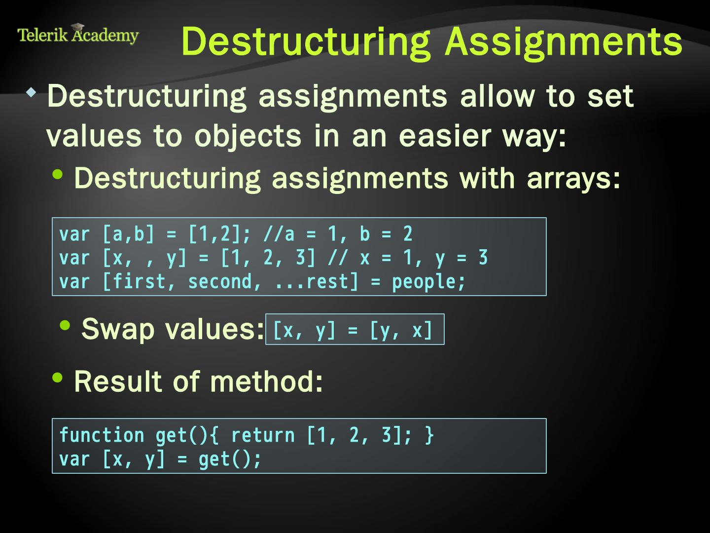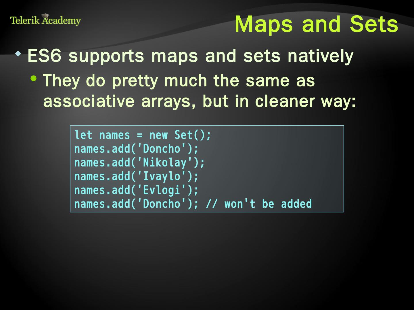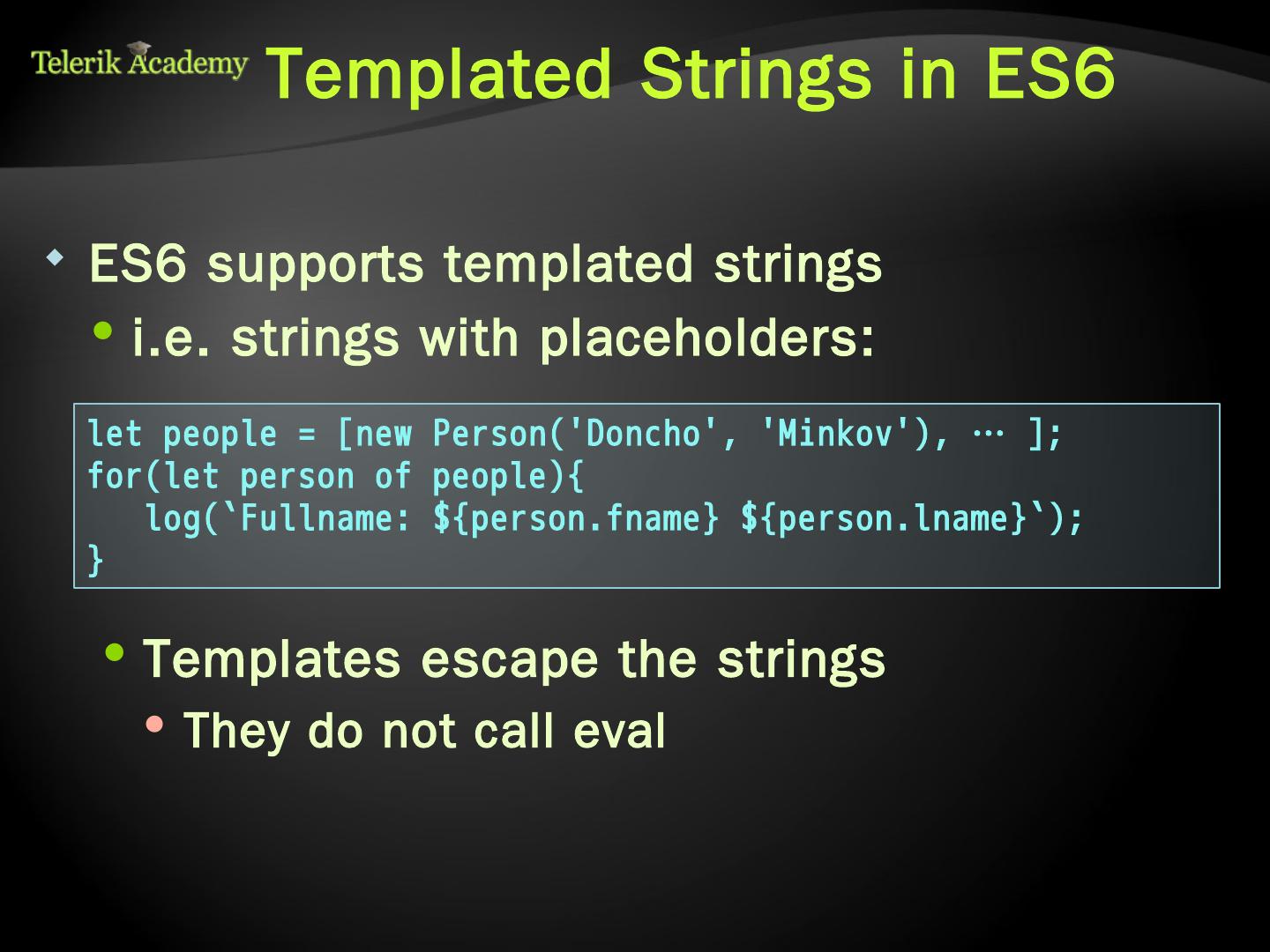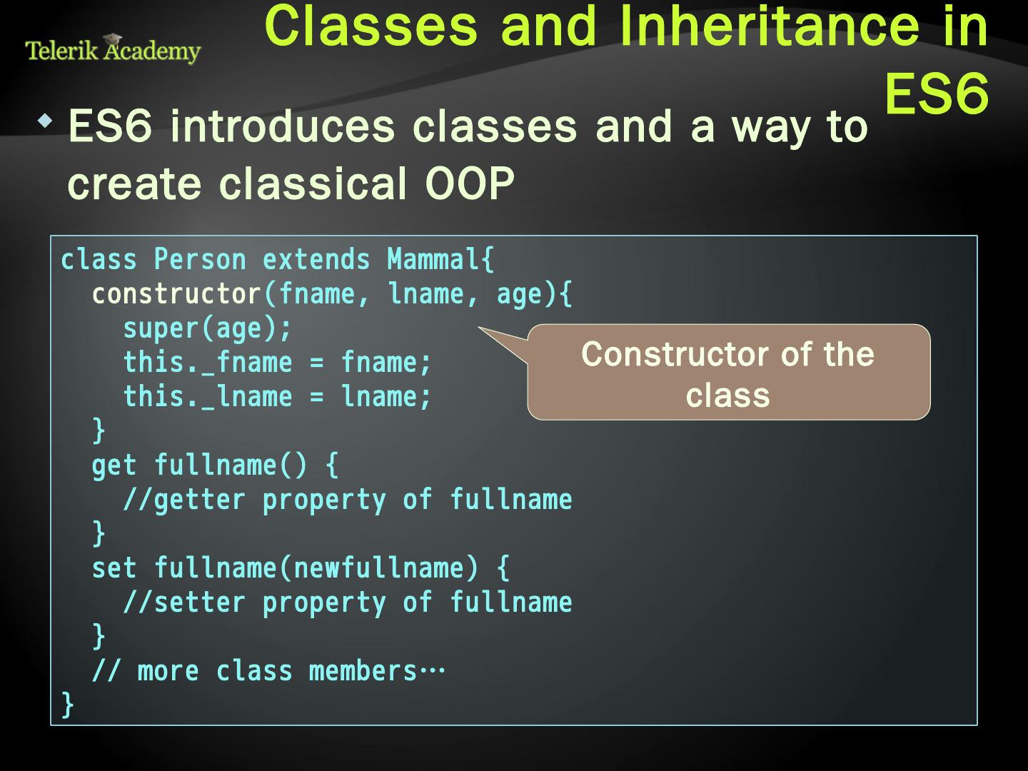 ES6 introduces new ways to declare variables: ... ES6 introduces classes and a way to create classical OOP .... Export the objects you want from a module:.