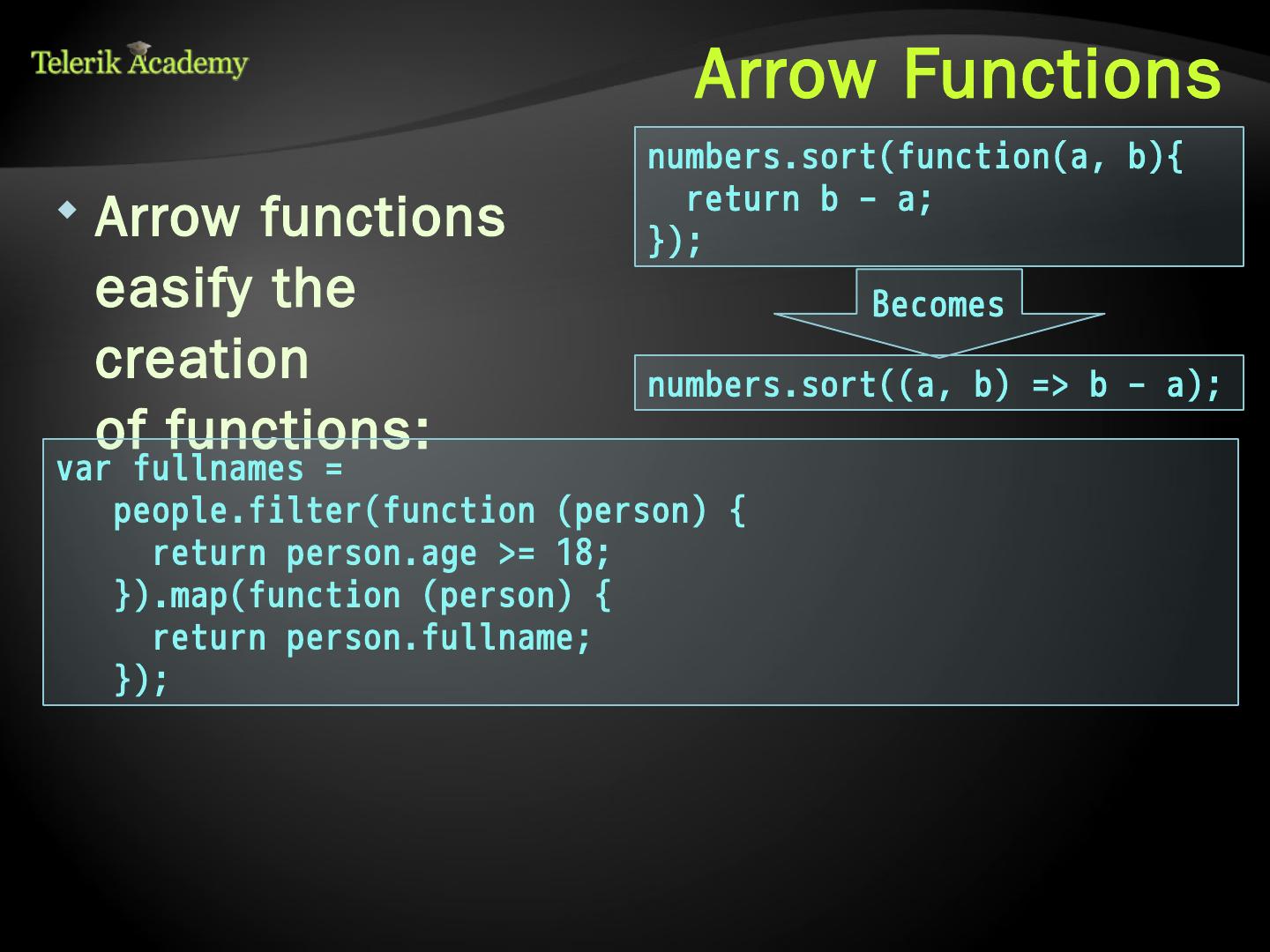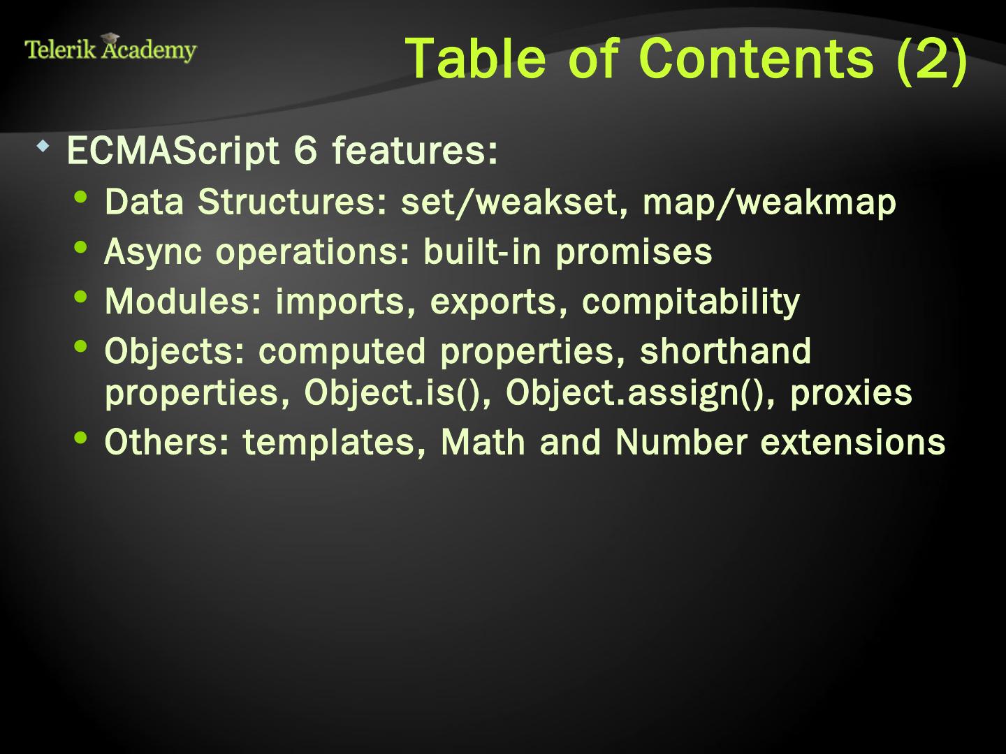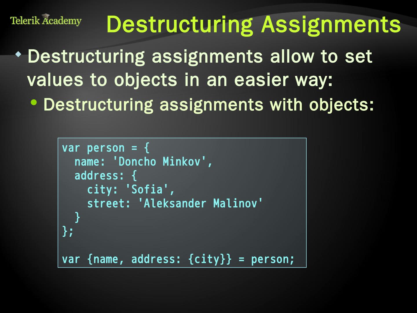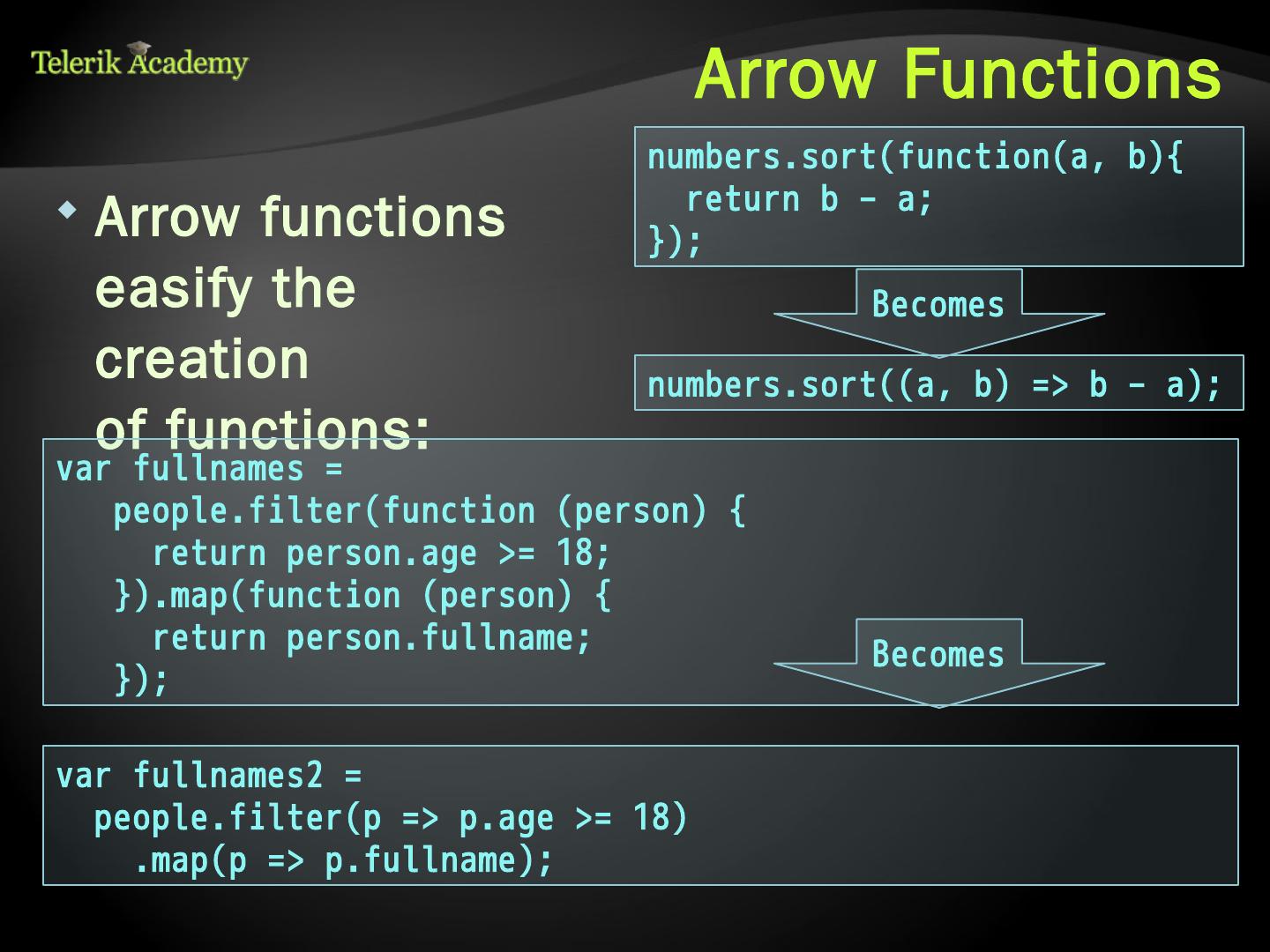 ES6 introduces new ways to declare variables: ... ES6 introduces classes and a way to create classical OOP .... Export the objects you want from a module:.
