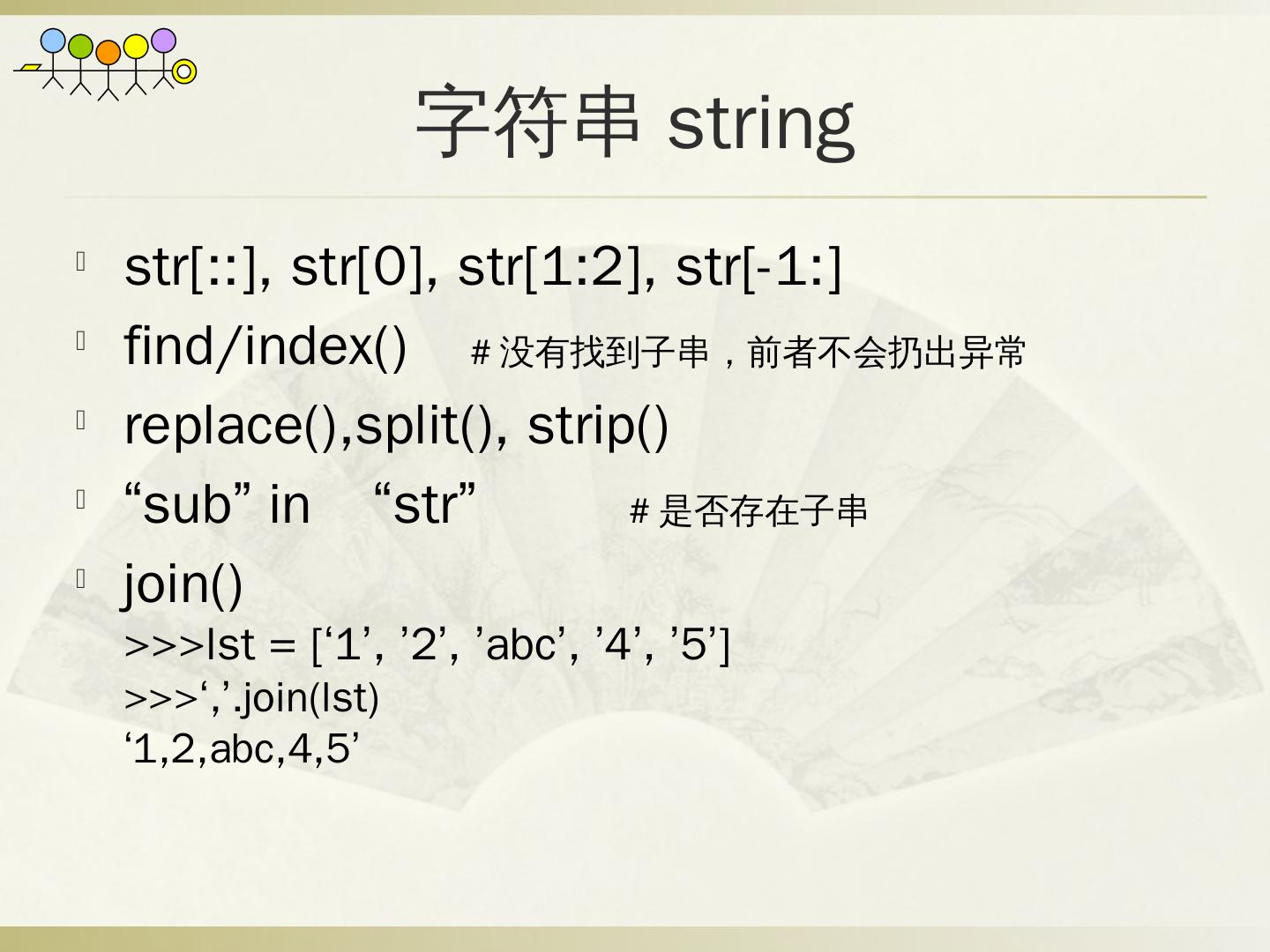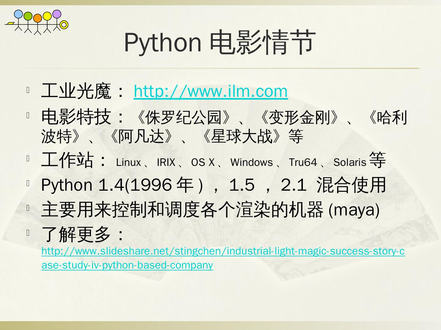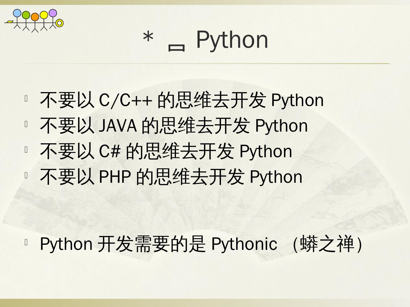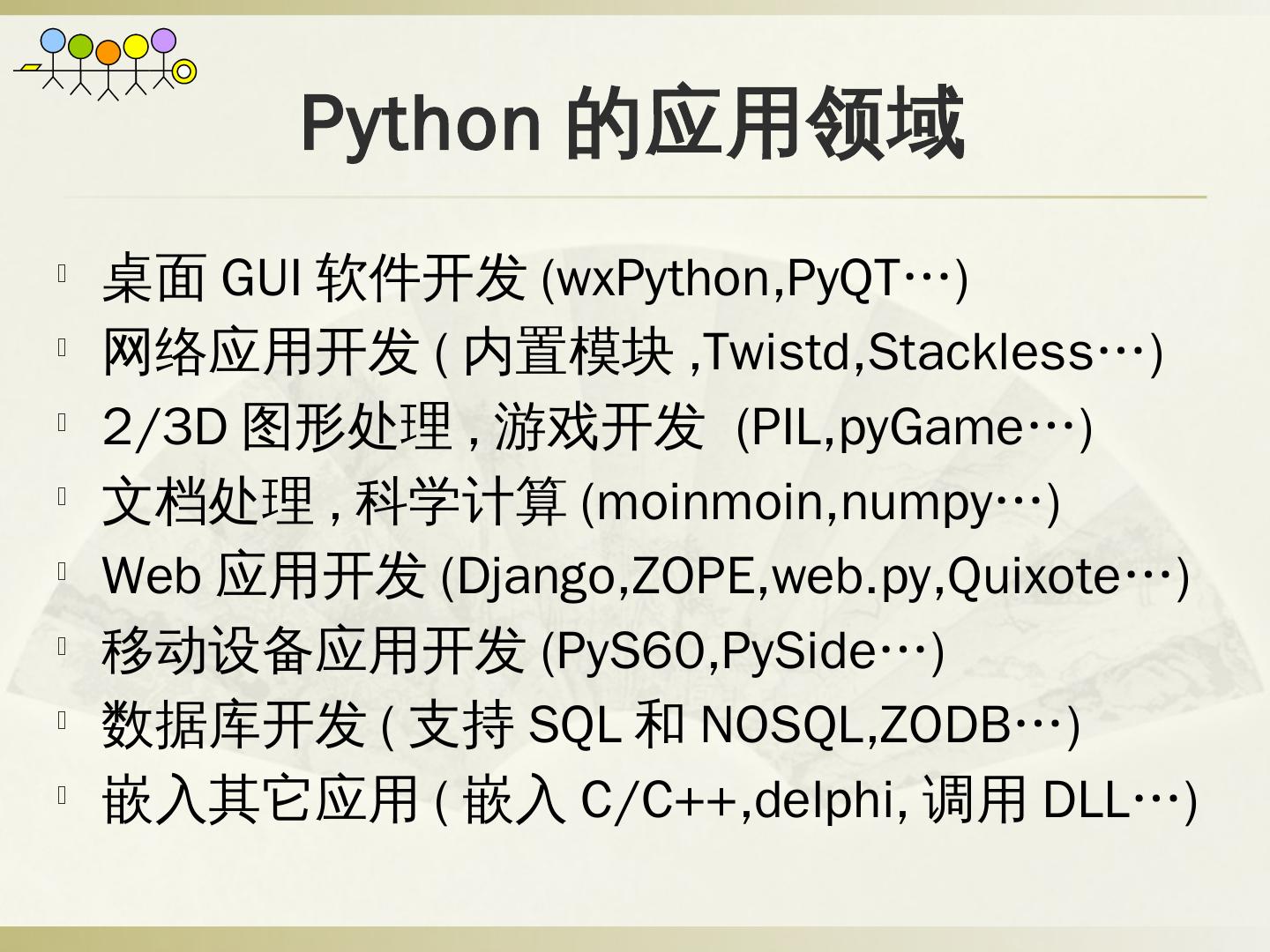 移动设备应用开发(PyS60,PySide…) 数据库开发( ... 除了OS和驱动程序. Python 还有什么 ... 我原先的一个项目中,要根据业务逻辑来封装字符串操作,简化调用。