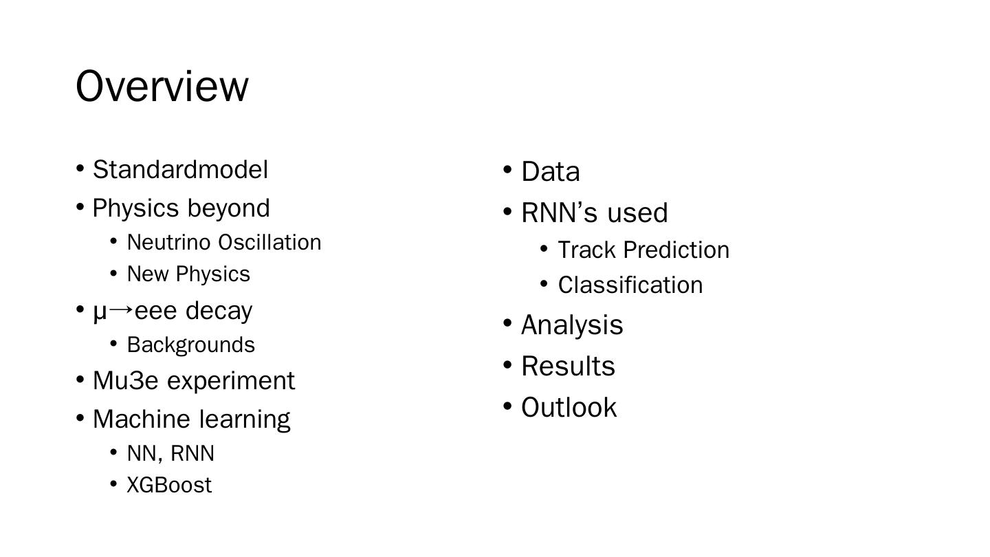 Standardmodel; Physics beyond. Neutrino Oscillation; New Physics. μ→eee decay. Backgrounds. Mu3e experiment; Machine learning. NN, RNN; XGBoost.