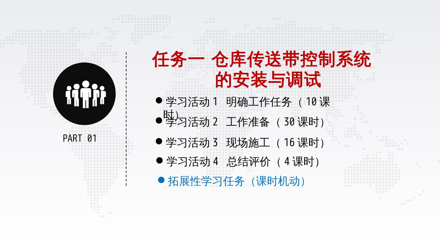 3 . 任务一 仓库传送带控制系统 的安装与调试 学习活动 1 明确工作任务( 10 课 时) 学习活动 2 工作准备( 30 课时) PART 01 学习活动 3 现场施工( 16 课时) 学习活动 4 总结评价( 4 课时) 拓展性学习任务(课时机动)