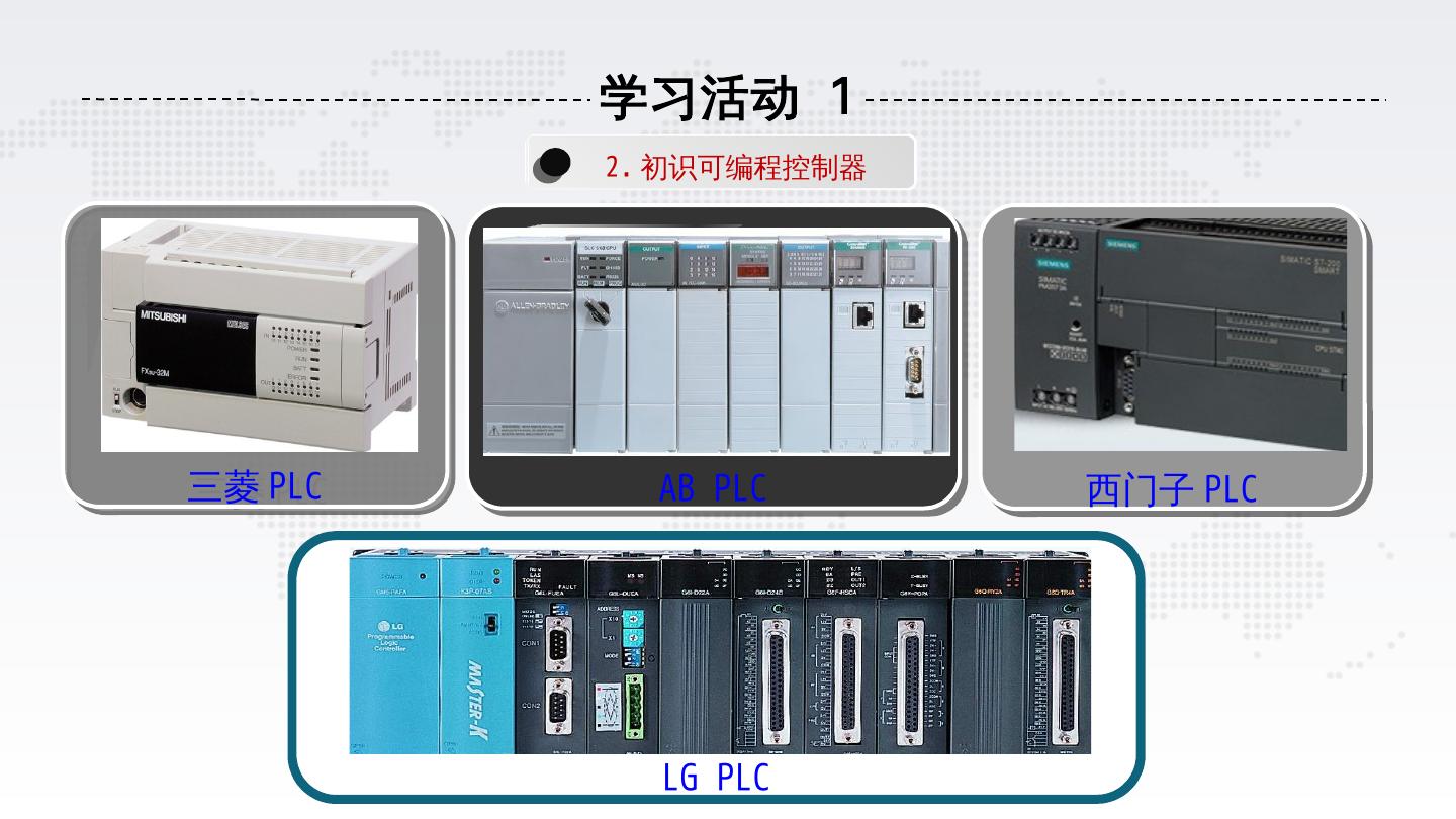 8 . 学习活动 1 2. 初识可编程控制器 三菱 三菱 PLC PLC AB AB PLC PLC 西门子 西门子 PLC PLC LG PLC