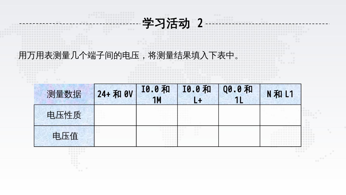 14 . 学习活动 2 用万用表测量几个端子间的电压,将测量结果填入下表中。 I0.0 和 I0.0 和 Q0.0 和 测量数据 24+ 和 0V N 和 L1 1M L+ 1L 电压性质 电压值