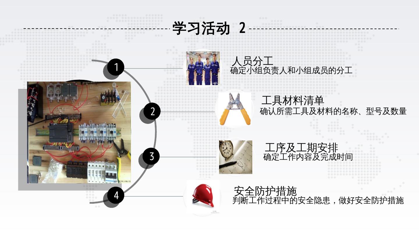 20 . 学习活动 2 人员分工 11 确定小组负责人和小组成员的分工 工具材料清单 22 确认所需工具及材料的名称、型号及数量 工序及工期安排 33 确定工作内容及完成时间 安全防护措施 44 判断工作过程中的安全隐患,做好安全防护措施