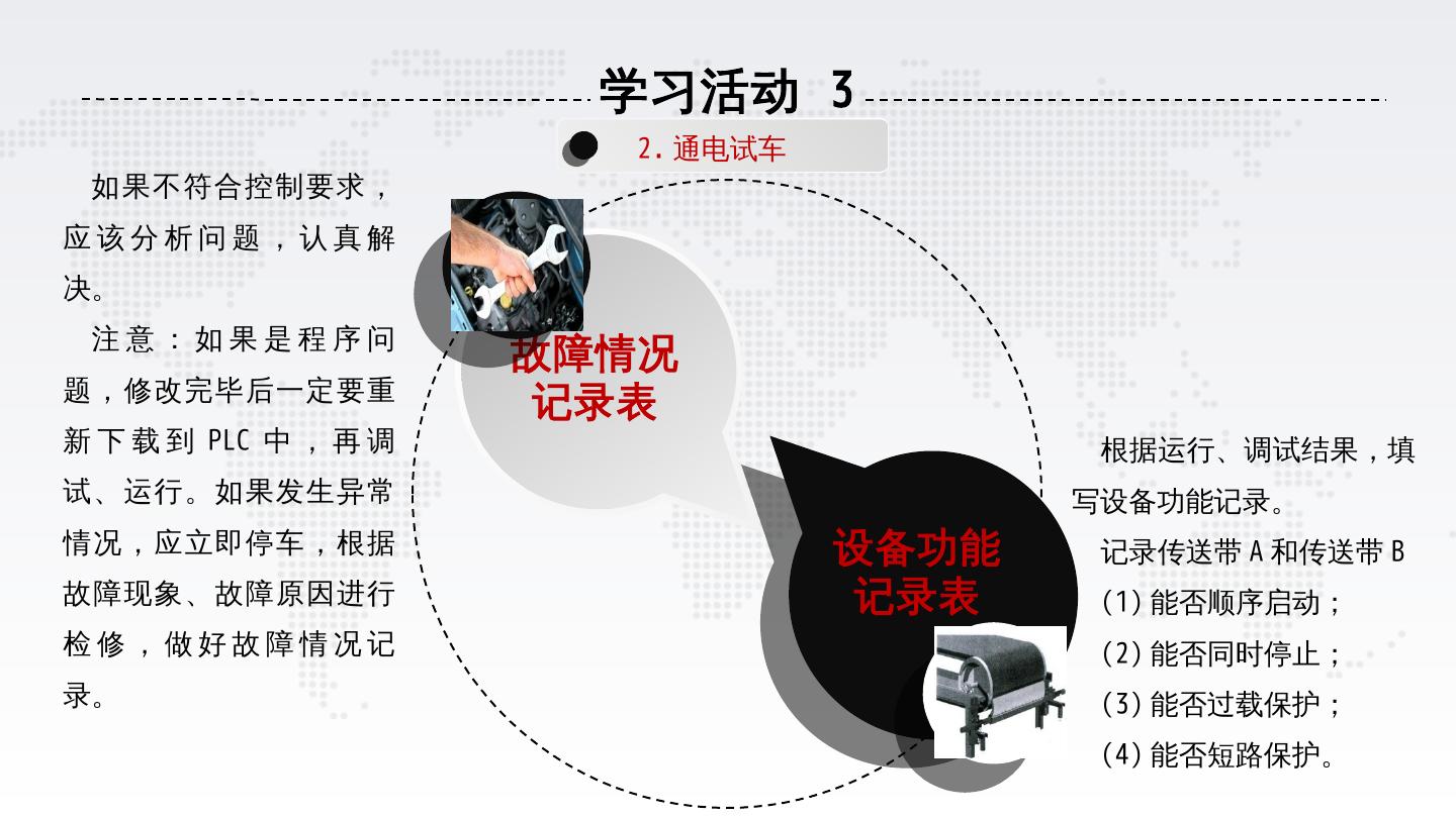 23 . 学习活动 3 2. 通电试车 如果不符合控制要求, 应该分析问题,认真解 决。 注意:如果是程序问 故障情况 题,修改完毕后一定要重 记录表 新 下 载 到 PLC 中 , 再 调 根据运行、调试结果,填 试、运行。如果发生异常 写设备功能记录。 情况,应立即停车,根据 设备功能 记录传送带 A 和传送带 B 故障现象、故障原因进行 记录表 (1) 能否顺序启动; 检修,做好故障情况记 (2) 能否同时停止; 录。 现有 (3) 能否过载保护; 资金 (4) 能否短路保护。