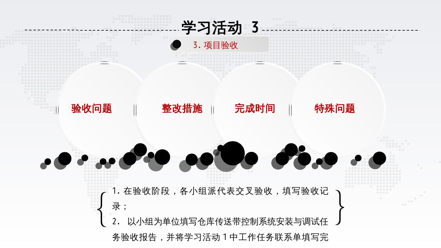 24 . 学习活动 3 3. 项目验收 验收问题 整改措施 完成时间 特殊问题 1. 在验收阶段,各小组派代表交叉验收,填写验收记 录; 2. 以小组为单位填写仓库传送带控制系统安装与调试任 务验收报告,并将学习活动 1 中工作任务联系单填写完