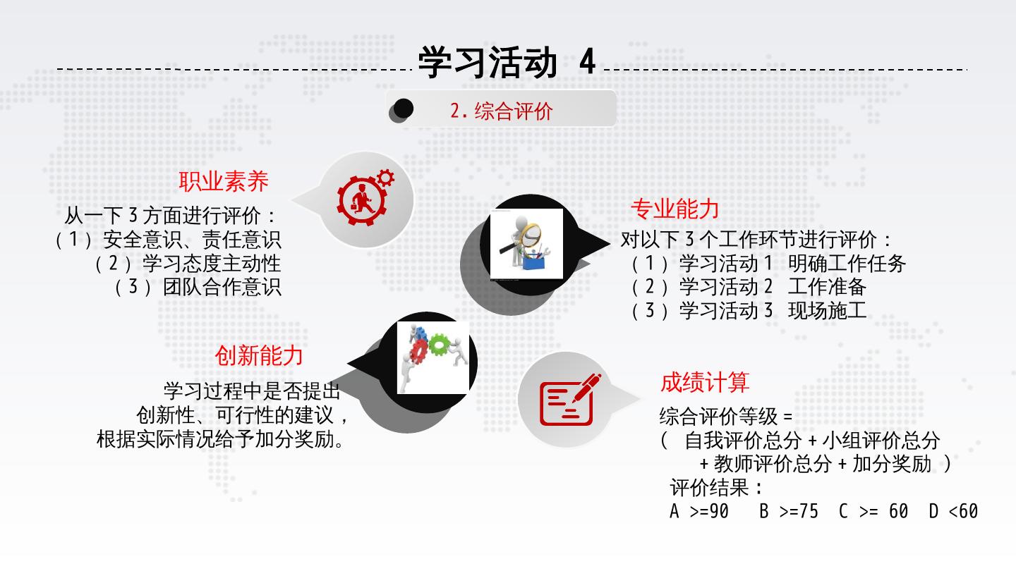 29 . 学习活动 4 2. 综合评价 职业素养 从一下 3 方面进行评价: 专业能力 ( 1 )安全意识、责任意识 对以下 3 个工作环节进行评价: ( 2 )学习态度主动性 ( 1 )学习活动 1 明确工作任务 ( 3 )团队合作意识 ( 2 )学习活动 2 工作准备 ( 3 )学习活动 3 现场施工 创新能力 学习过程中是否提出 成绩计算 创新性、可行性的建议, 综合评价等级 = 根据实际情况给予加分奖励。 ( 自我评价总分 + 小组评价总分 + 教师评价总分 + 加分奖励 ) 评价结果 : A >=90 B >=75 C >= 60 D <60