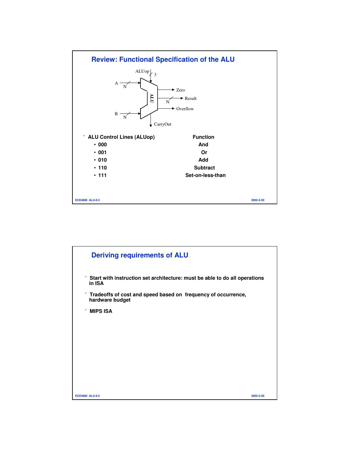 2 . Review: Functional Specification of the ALU ALUop 3 A N Zero ALU Result N Overflow B N CarryOut °ALU Control Lines (ALUop) Function • 000 And • 001 Or • 010 Add • 110 Subtract • 111 Set-on-less-than ECE4680 ALU-II.3 2002-2-20 Deriving requirements of ALU °Start with instruction set architecture: must be able to do all operations in ISA °Tradeoffs of cost and speed based on frequency of occurrence, hardware budget °MIPS ISA ECE4680 ALU-II.4 2002-2-20