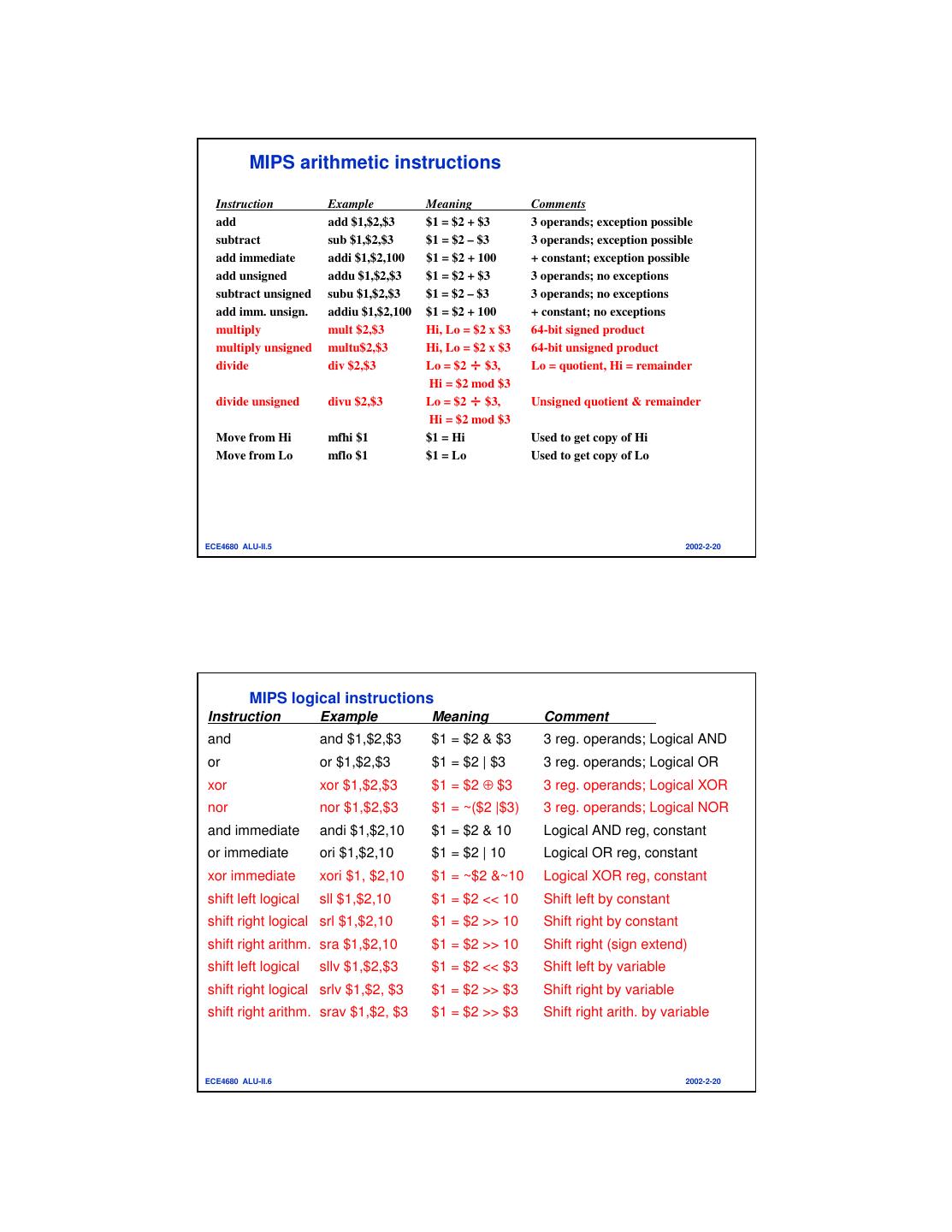 3 . MIPS arithmetic instructions Instruction Example Meaning Comments add add $1,$2,$3 $1 = $2 + $3 3 operands; exception possible subtract sub $1,$2,$3 $1 = $2 – $3 3 operands; exception possible add immediate addi $1,$2,100 $1 = $2 + 100 + constant; exception possible add unsigned addu $1,$2,$3 $1 = $2 + $3 3 operands; no exceptions subtract unsigned subu $1,$2,$3 $1 = $2 – $3 3 operands; no exceptions add imm. unsign. addiu $1,$2,100 $1 = $2 + 100 + constant; no exceptions multiply mult $2,$3 Hi, Lo = $2 x $3 64-bit signed product multiply unsigned multu$2,$3 Hi, Lo = $2 x $3 64-bit unsigned product divide div $2,$3 Lo = $2 ÷ $3, Lo = quotient, Hi = remainder Hi = $2 mod $3 divide unsigned divu $2,$3 Lo = $2 ÷ $3, Unsigned quotient & remainder Hi = $2 mod $3 Move from Hi mfhi $1 $1 = Hi Used to get copy of Hi Move from Lo mflo $1 $1 = Lo Used to get copy of Lo ECE4680 ALU-II.5 2002-2-20 MIPS logical instructions Instruction Example Meaning Comment and and $1,$2,$3 $1 = $2 & $3 3 reg. operands; Logical AND or or $1,$2,$3 $1 = $2 | $3 3 reg. operands; Logical OR xor xor $1,$2,$3 $1 = $2 ⊕ $3 3 reg. operands; Logical XOR nor nor $1,$2,$3 $1 = ~($2 |$3) 3 reg. operands; Logical NOR and immediate andi $1,$2,10 $1 = $2 & 10 Logical AND reg, constant or immediate ori $1,$2,10 $1 = $2 | 10 Logical OR reg, constant xor immediate xori $1, $2,10 $1 = ~$2 &~10 Logical XOR reg, constant shift left logical sll $1,$2,10 $1 = $2 << 10 Shift left by constant shift right logical srl $1,$2,10 $1 = $2 >> 10 Shift right by constant shift right arithm. sra $1,$2,10 $1 = $2 >> 10 Shift right (sign extend) shift left logical sllv $1,$2,$3 $1 = $2 << $3 Shift left by variable shift right logical srlv $1,$2, $3 $1 = $2 >> $3 Shift right by variable shift right arithm. srav $1,$2, $3 $1 = $2 >> $3 Shift right arith. by variable ECE4680 ALU-II.6 2002-2-20
